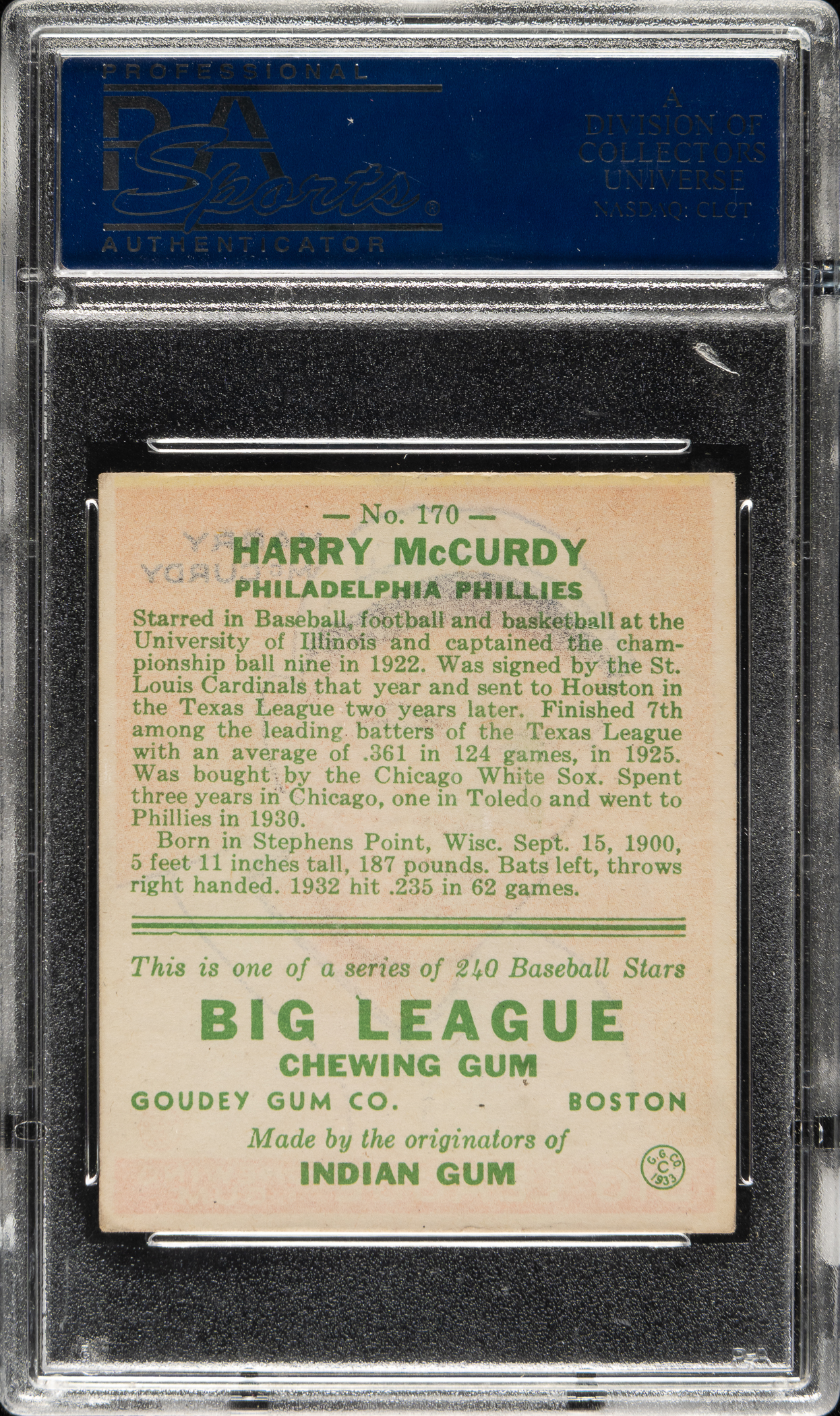 Lot # 1028: 1933 R319 Goudey #170 Harry McCurdy PSA EX 5