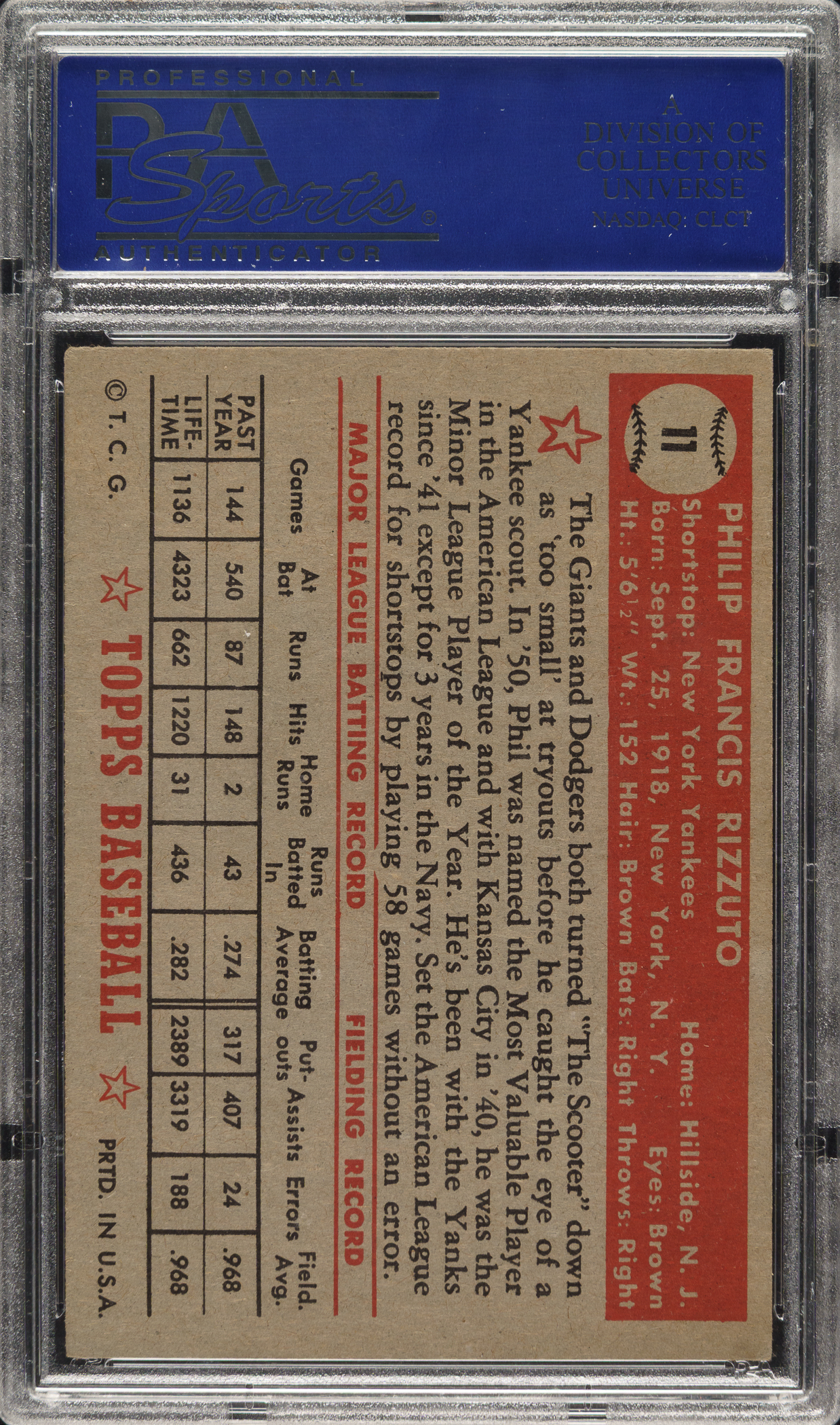 Lot # 1439: 1952 Topps #11 Phil Rizzuto PSA EX-MT 6