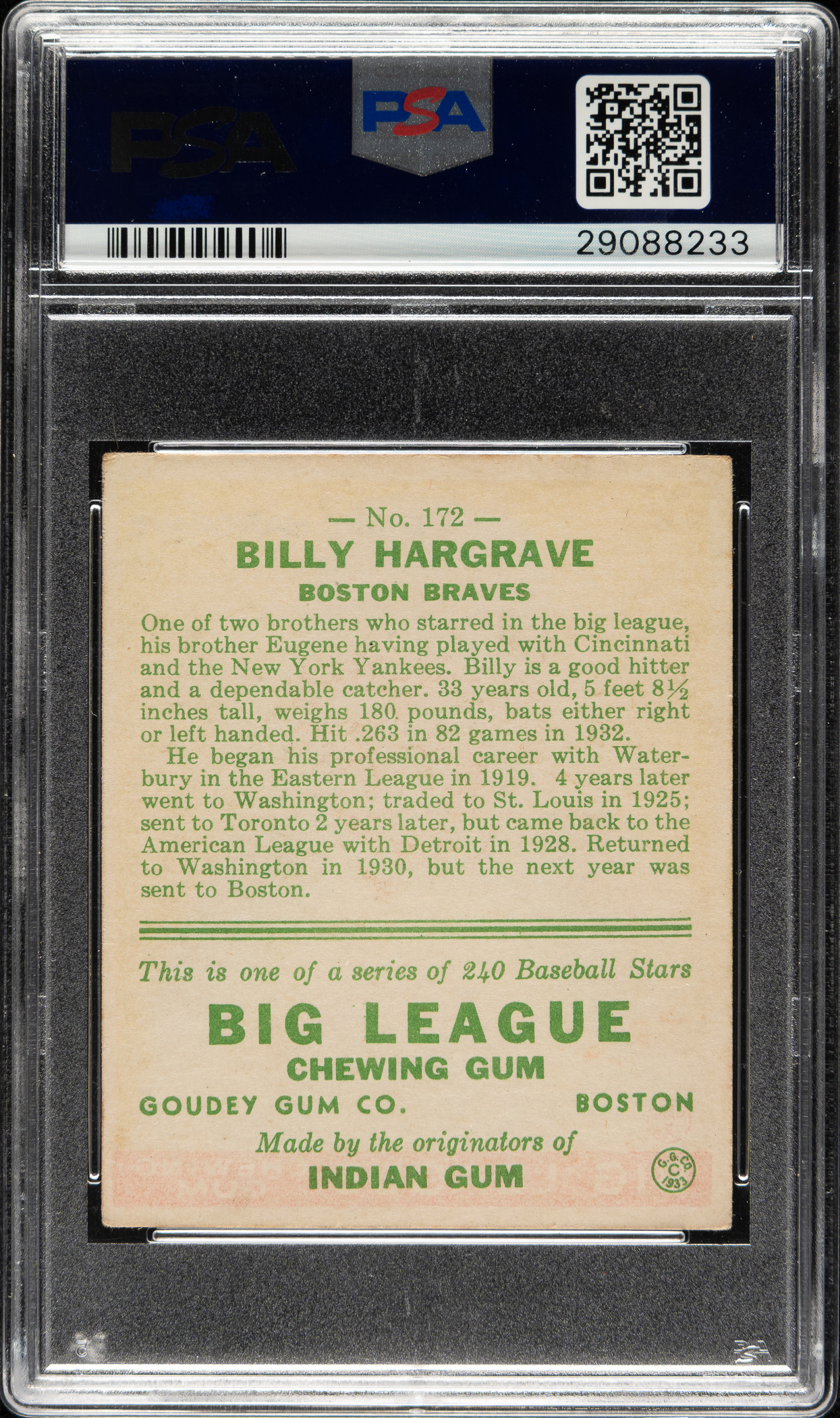 Lot # 1030: 1933 R319 Goudey #172 Billy Hargrave PSA VG-EX 4