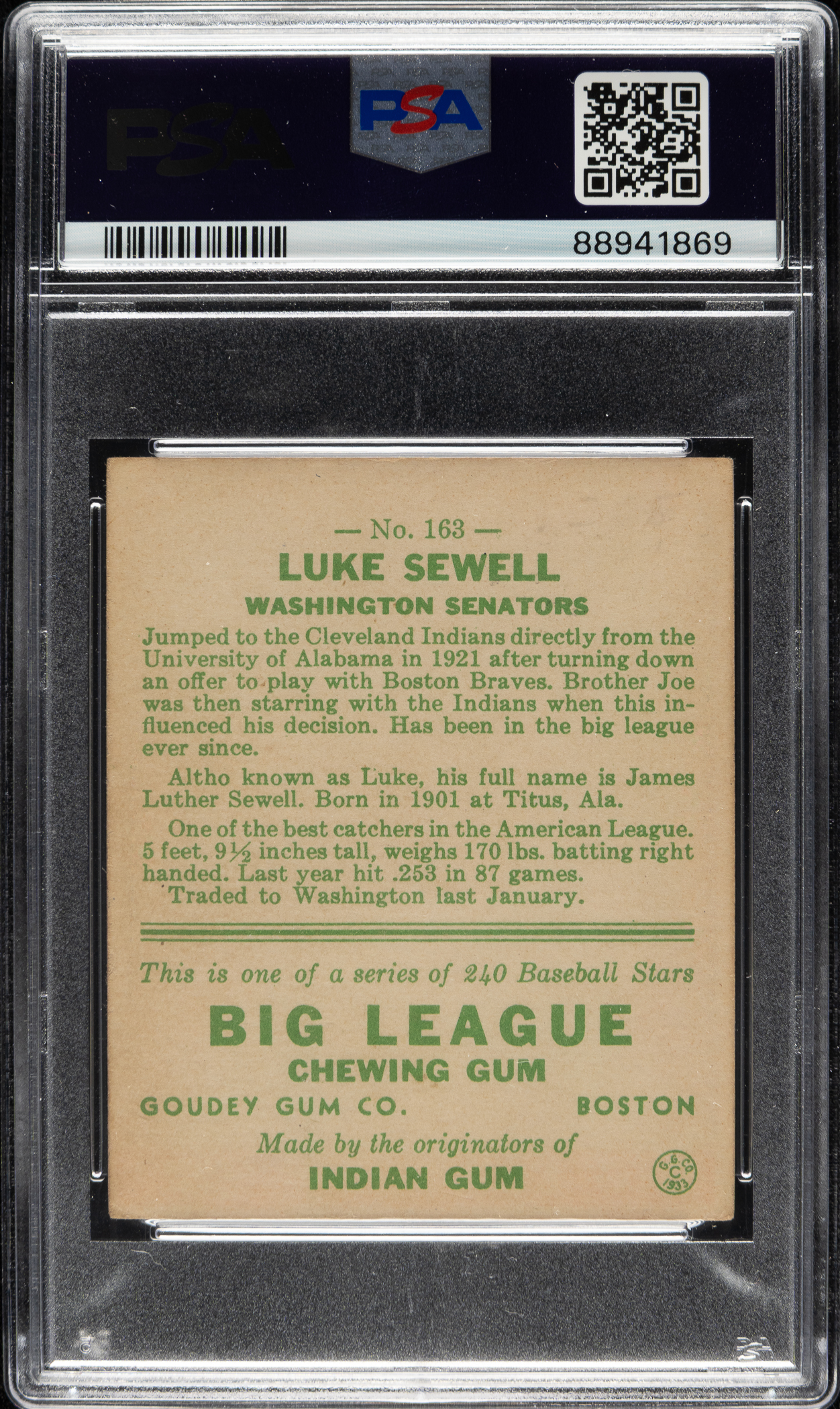 Lot # 1027: 1933 R319 Goudey #163 Luke Sewell PSA VG-EX 4