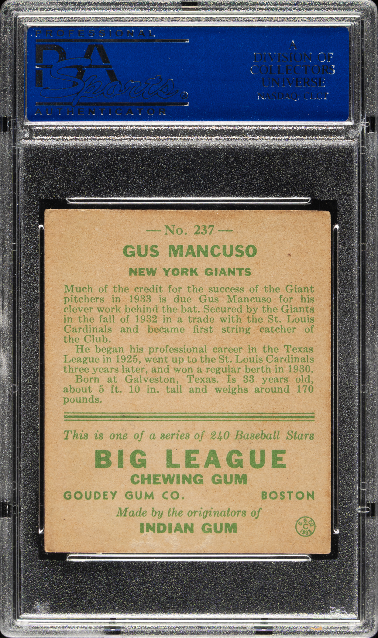 Lot # 1070: 1933 R319 Goudey #237 Gus Mancuso PSA VG-EX 4