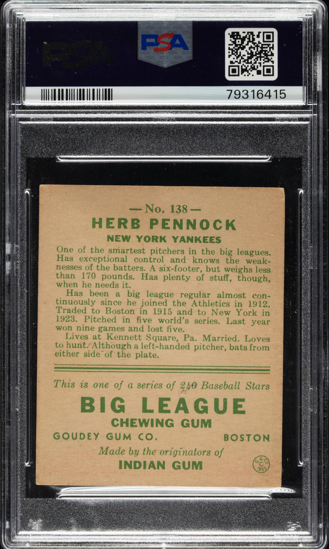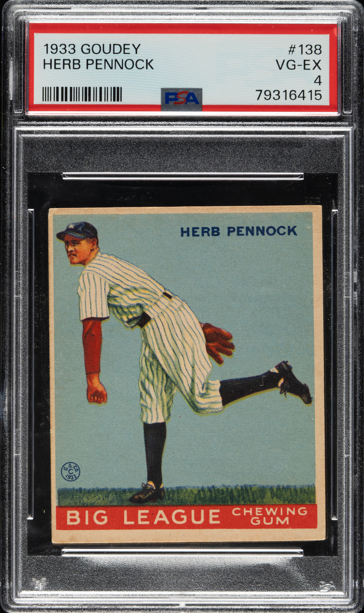 Graded VG-EX 4 by PSA. New York Yankees Hall of Famer Herb Pennock.