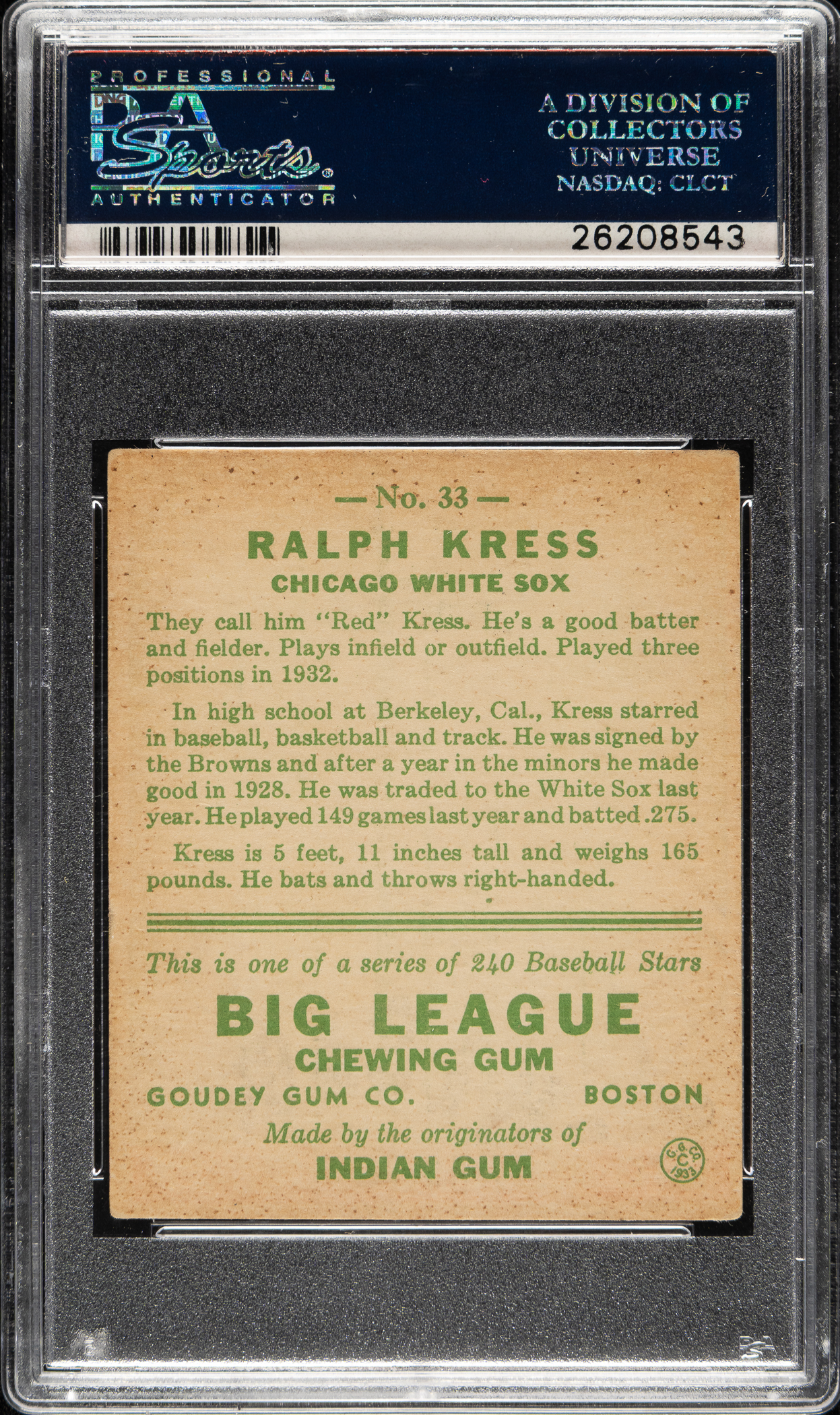 Lot # 1082: 1933 R319 Goudey #33 Ralph Kress PSA VG-EX 4