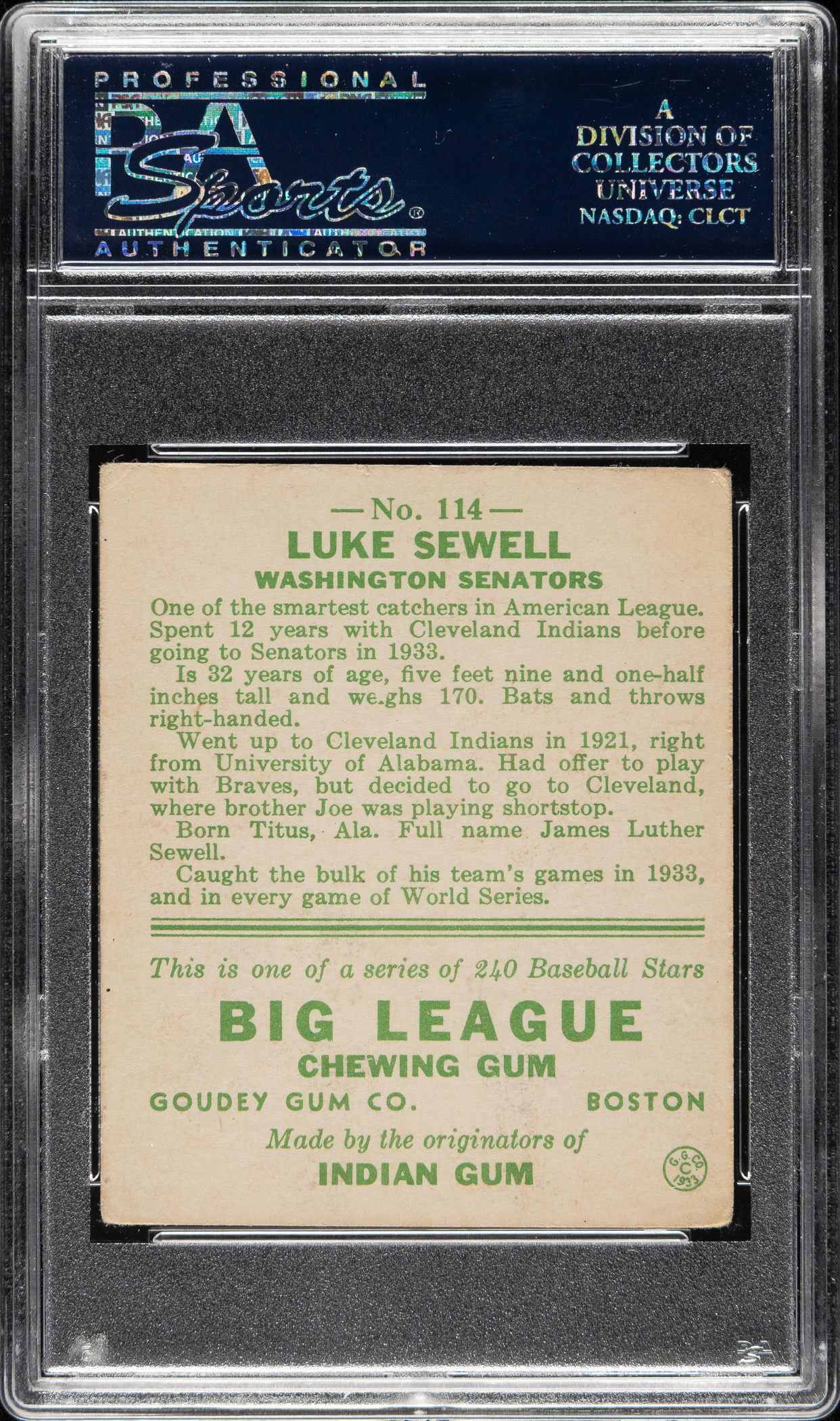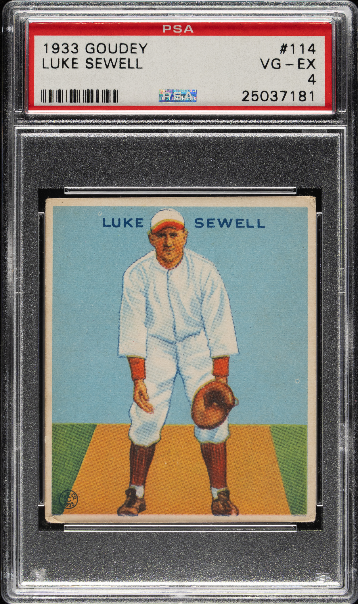 Lot # 995: 1933 R319 Goudey #114 Luke Sewell PSA VG-EX 4