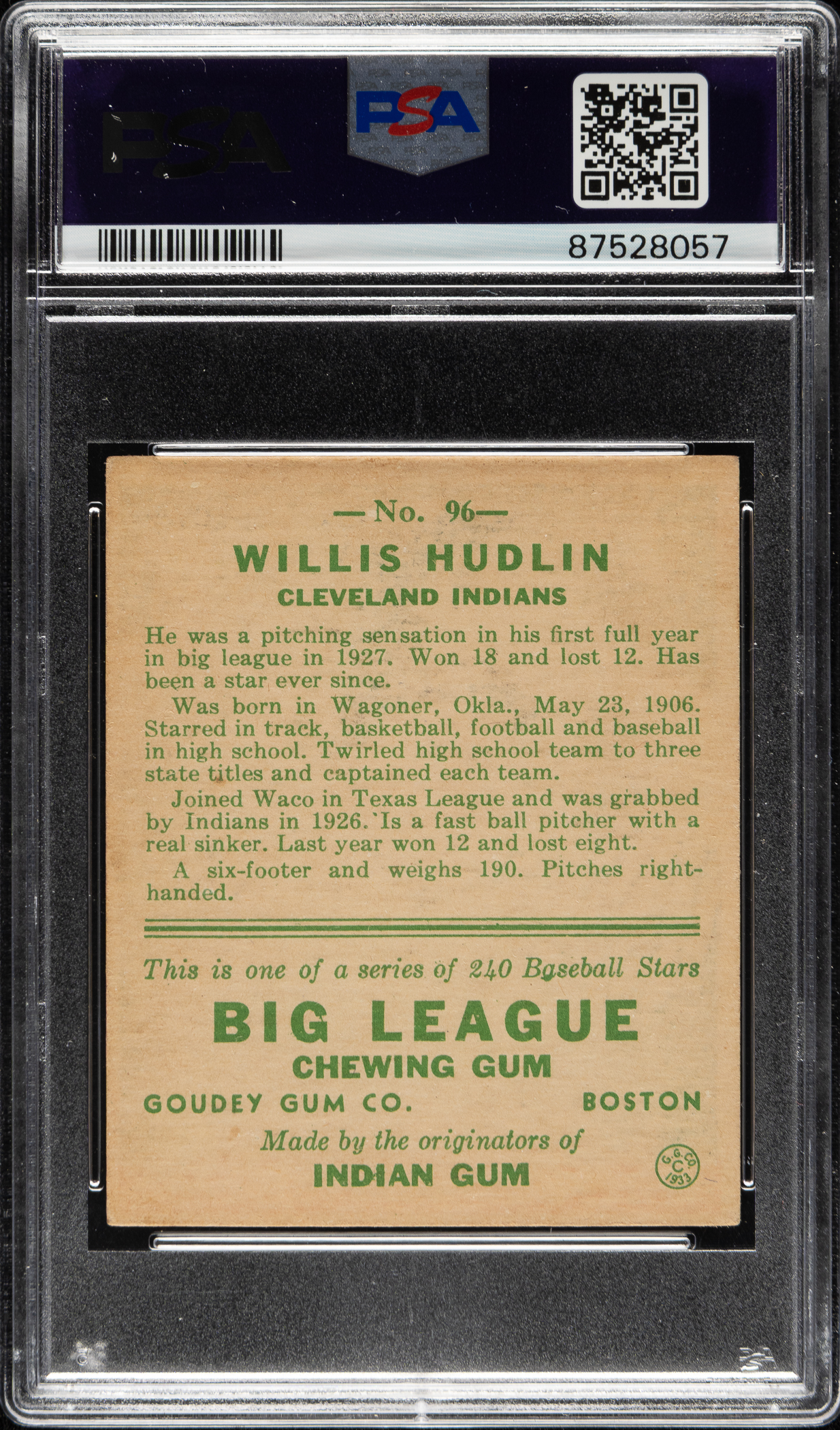 Lot # 1114: 1933 R319 Goudey #96 Willis Hudlin PSA VG-EX 4