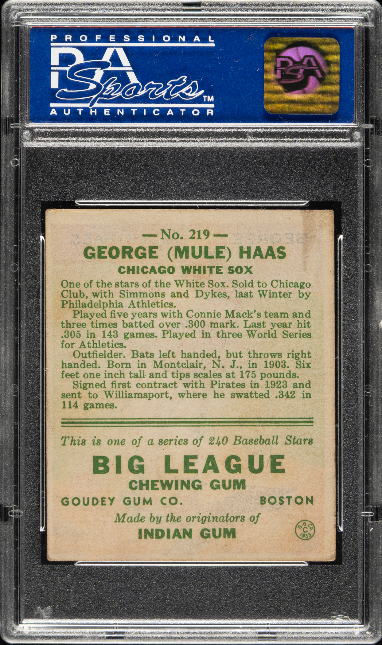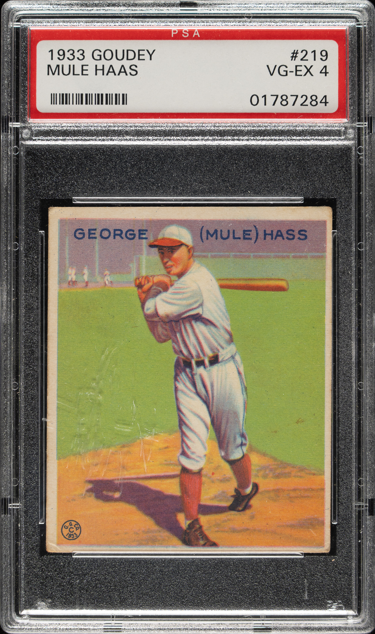 Lot # 1063: 1933 R319 Goudey #219 Mule Haas PSA VG-EX 4