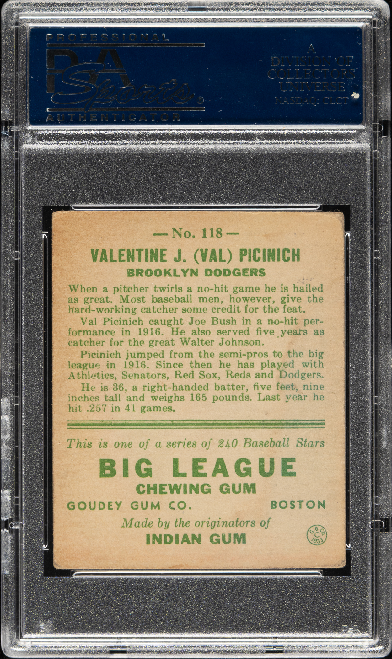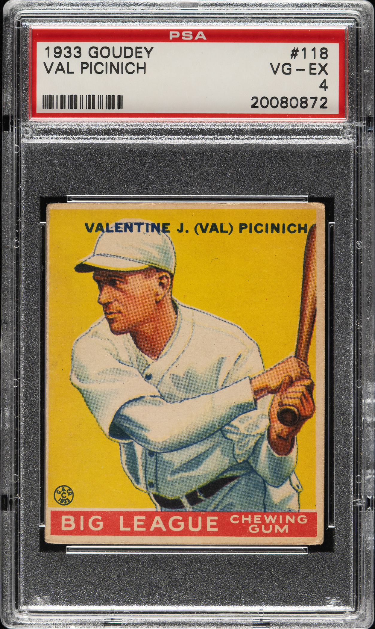 Lot # 998: 1933 R319 Goudey #118 Val Picinich PSA VG-EX 4