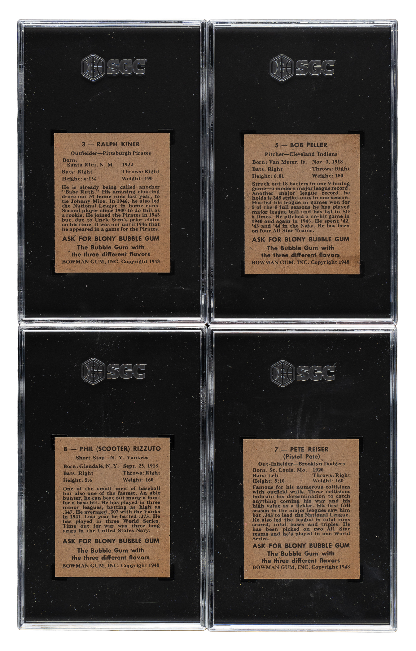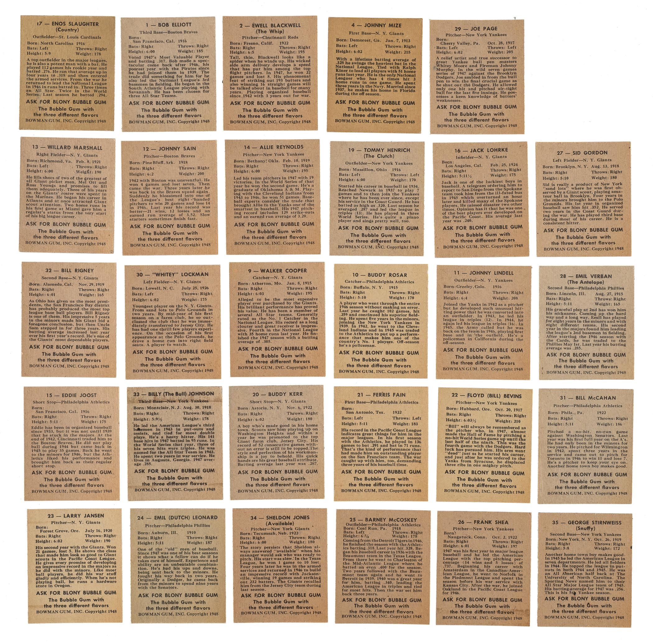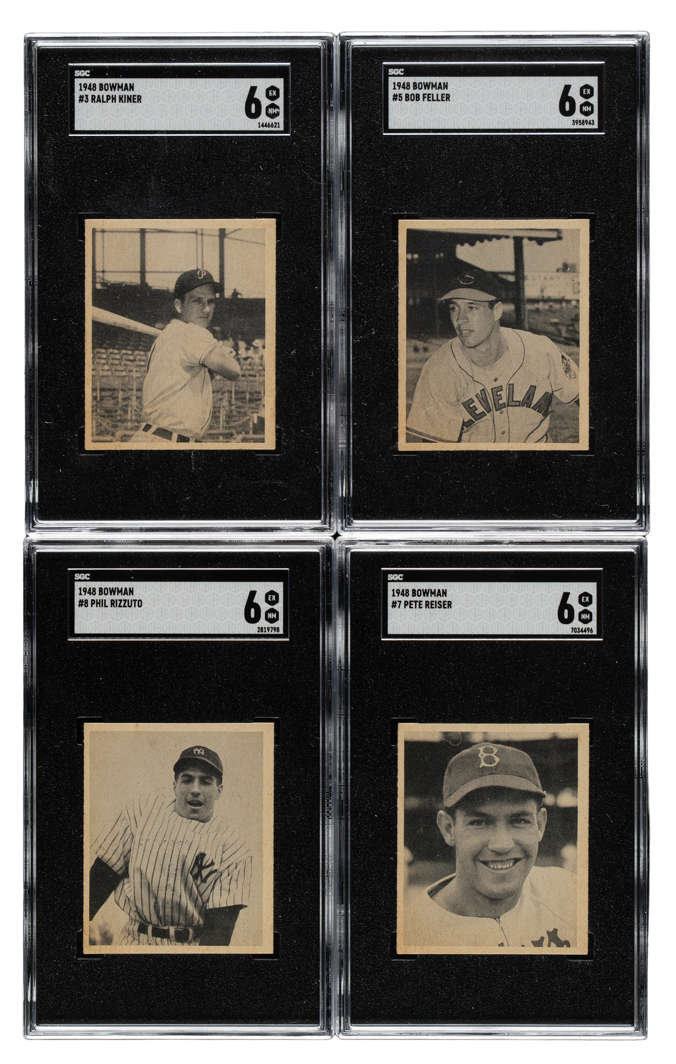 Offered is a partial set of thirty-three different cards (out of forty-eight) from the 1948 Bowman series, the first baseball-card set issued by Bowman Gum. This collection is highlighted by several key cards, including Bob Feller and rookie cards of Phil Rizzuto and Ralph Kiner. Missing the following fifteen cards for completion: #6 Berra, 18 Spahn, 36 Musial, 37, 38 Schoendienst, 39, 40 Marion, 41, 42, 43, 44, 45 Sauer, 46, 47 Thomson, and 48. Condition is 21% Nr/Mt or slightly better, 54% Ex to Ex-Mt, and 25% Vg to Vg-Ex (including three lesser). We have selected four cards for grading and encapsulation by SGC. Keys: #1 Elliott RC (Vg), 2 Blackwell (Vg-Ex), 3 Kiner RC (EX/NM 6), 4 Mize (Gd), 5 Feller (EX/NM 6), 7 Reiser SP (EX/NM 6), 8 Rizzuto RC (EX/NM 6), 12 Sain RC (Nr/Mt), 14 Reynolds RC (Ex), 17 Slaughter RC (Vg-Ex), 19 Henrich (Ex+), 29 Page RC (Nr/Mt), and 30 Lockman SP (Ex+). An outstanding opportunity to acquire an extremely attractive mid- to high-grade partial set of this landmark Bowman issue. Total: 33 cards. The size/weight of this item requires that there will be an additional shipping charge for this lot.