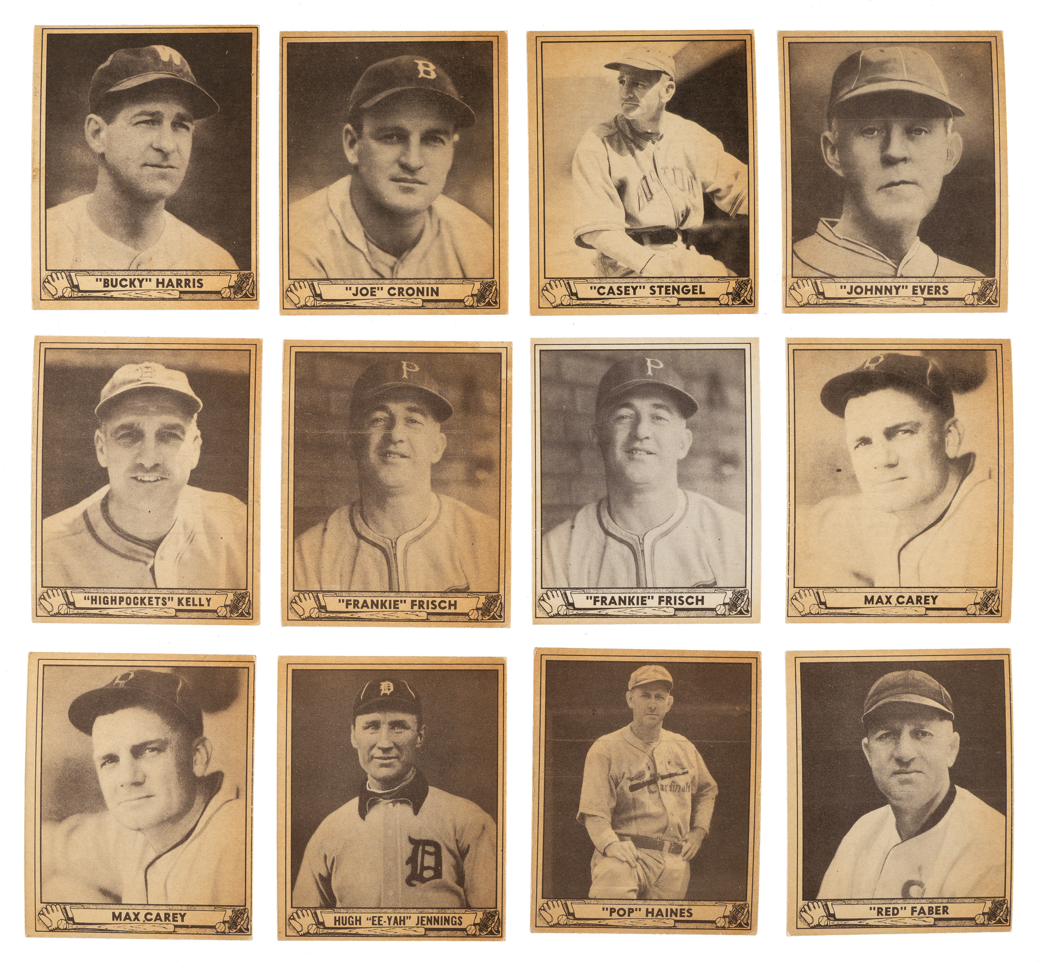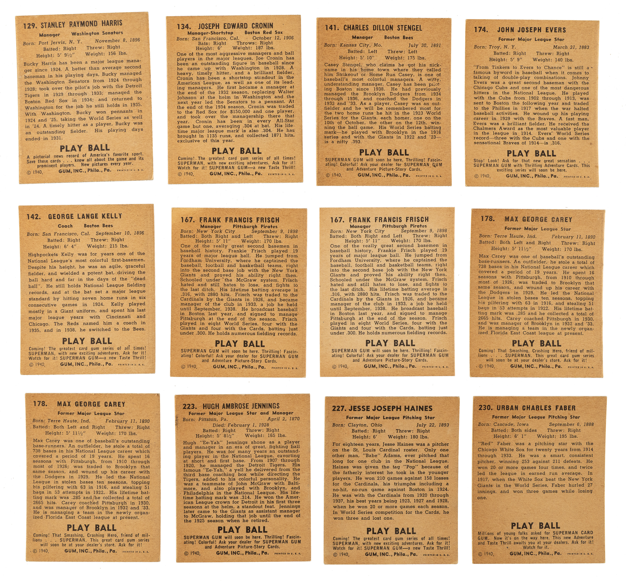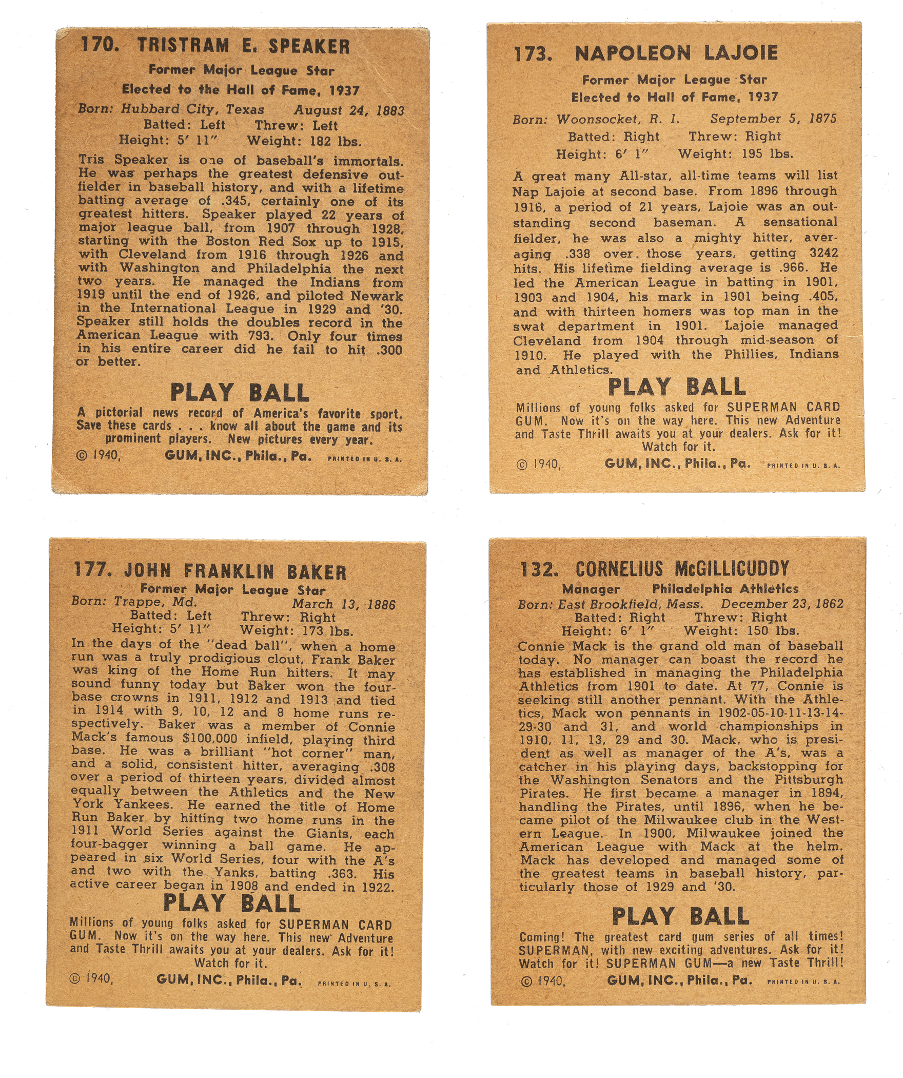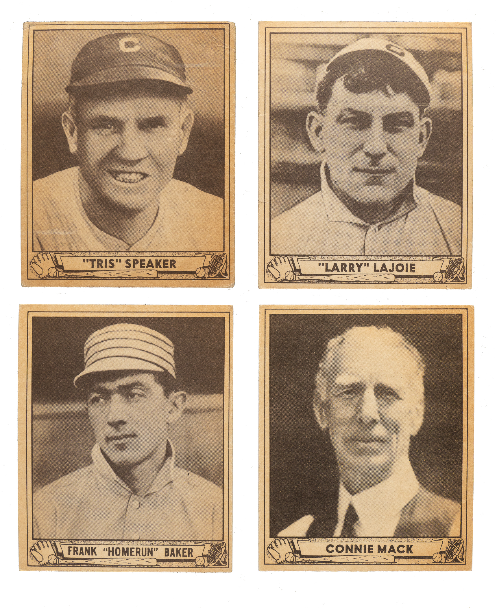 Collection of fifty-five (fifty-two different) 1940 R335 Play Ball baseball cards highlighted by sixteen Hall of Famers, including Speaker, Mack, Stengel, and Lajoie. Condition is 18% Ex, 72% Vg to Vg-Ex (including some due to very small edge tears), and 10% lesser. This collection consists of the following: #14, 51, 53, 55, 121, 122, 123, 127, 128, 129 Harris (Vg-Ex), 131, 132 Mack (Ex), 134 Cronin (Ex), 136, 137, 138, 139, 140, 141 Stengel (Vg-Ex+), 142 Kelly (Vg), 144, 147, 148, 152, 156, 157, 159, 160, 162, 163, 165, 166, two 167 Frisch (both Vg), 170 Speaker (Gd), 173 Lajoie (Vg), 174 Evers (Ex), 177 Baker (Vg-Ex+), two 178 Carey (Vg/Vg-Ex and Vg), 184, 185, 194, 195, 197, two 202, 219, 220, 222, 223 Jennings (Vg-Ex+), 227 Haines (Vg-Ex), 228, 229, and 230 Faber (85/15 L/R, otherwise Ex). Total: 55 cards.