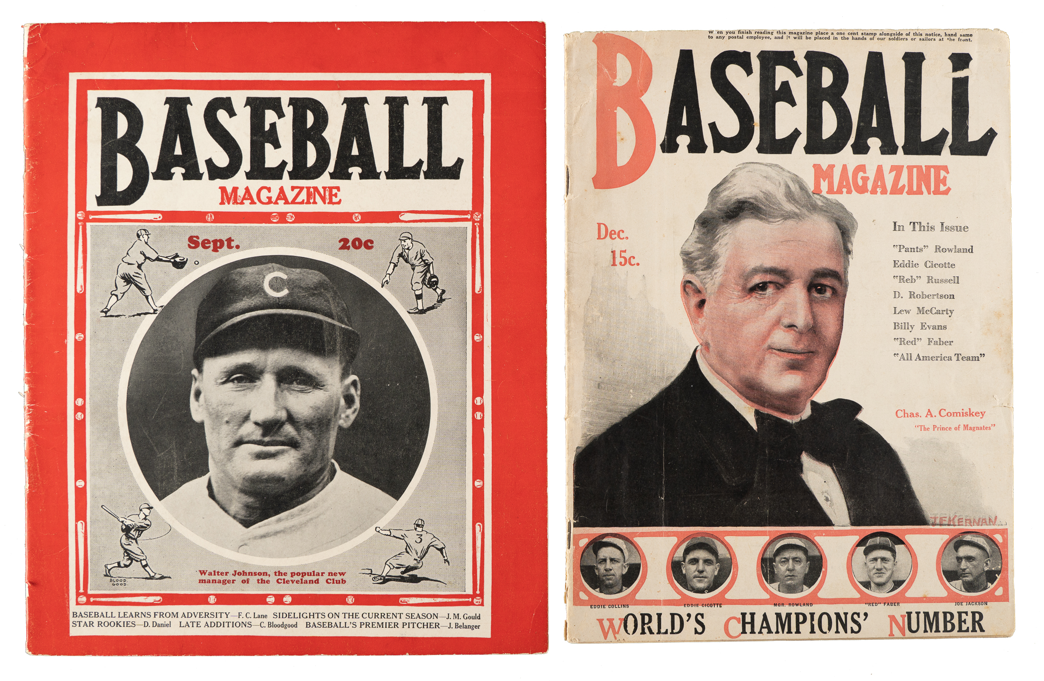 Pair of issues of Baseball Magazine from 1917 and 1933. For over 50 years, beginning in 1908, Baseball Magazine was the voice of the National Pastime, documenting every nuance of the game and its history in word and photographs. Today, Baseball Magazine is no longer published, but old issues open a window to history that is unrivaled, providing information and photos that often can be found nowhere else. Its research value aside, collectors have always prized the magazine for the tremendous display value of its classic covers. 1) December 1917 (featuring Charles Comiskey, Eddie Collins, Eddie Cicotte, Red Faber, and Joe Jackson on the front cover). Fr. 2) September 1933 (featuring Walter Johnson on the front cover). Gd. Total: 2 magazines.
