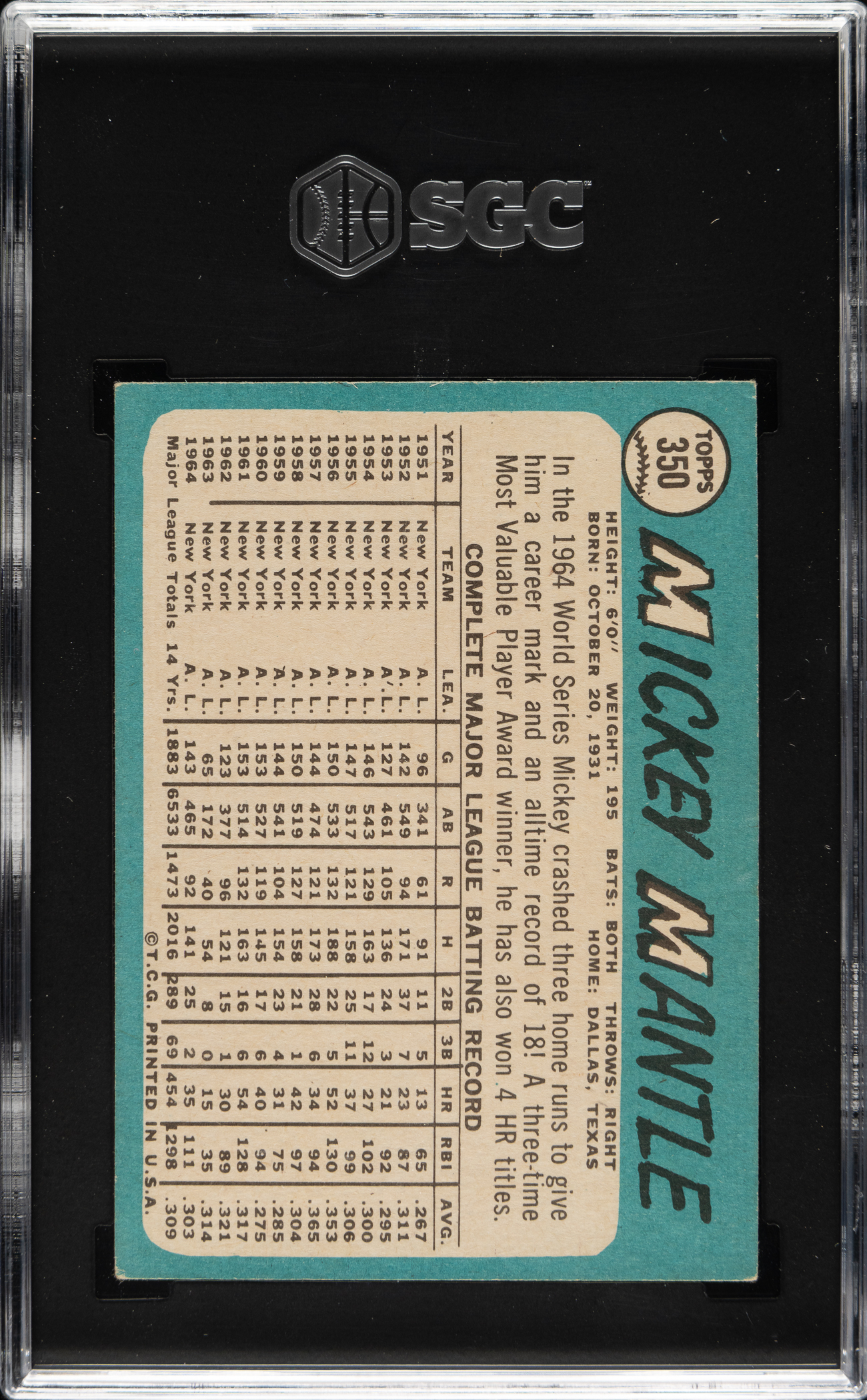 Lot # 2004: 1965 Topps #350 Mickey Mantle SGC VG 3