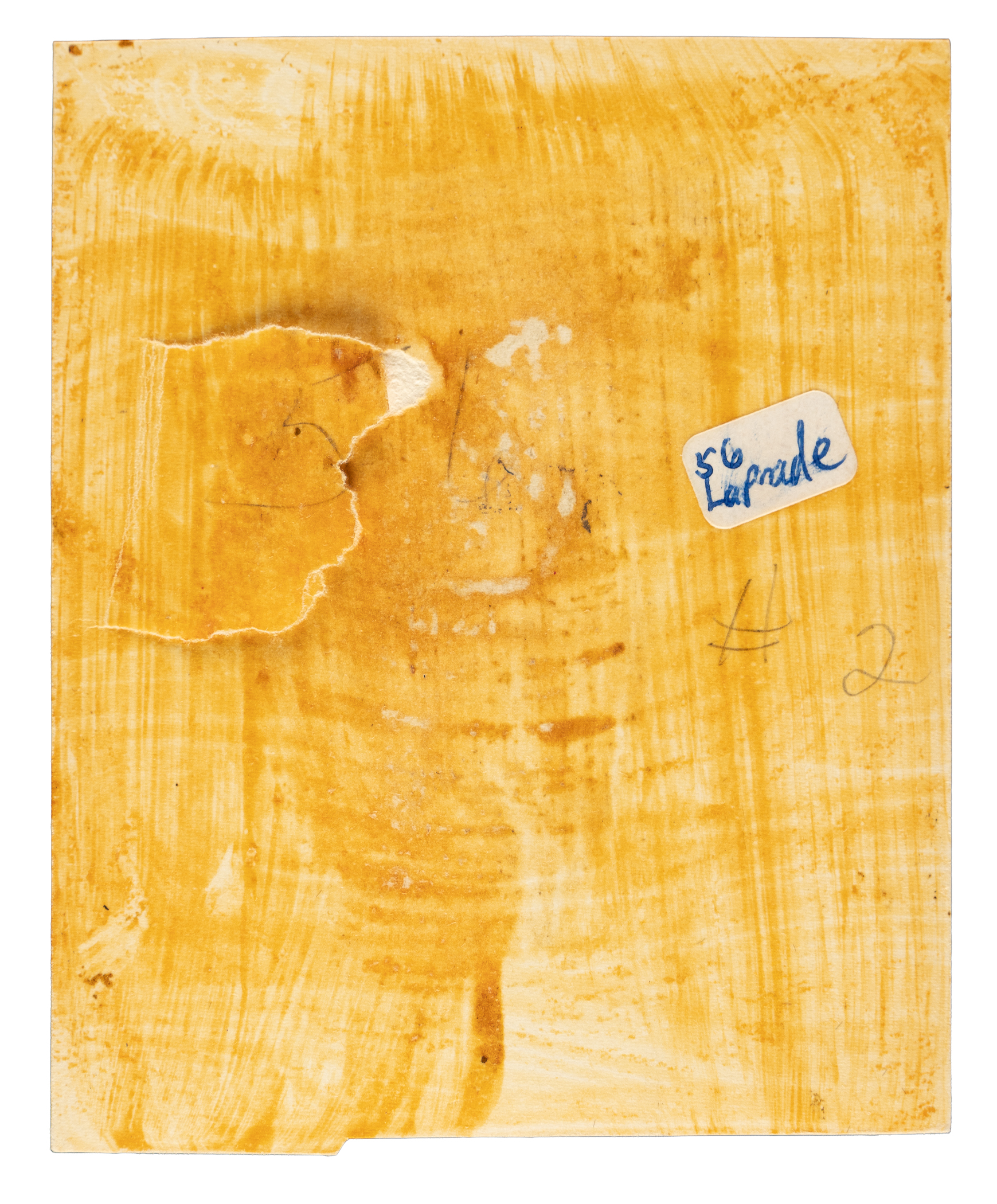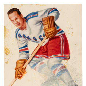 Offered is the actual original Flexichrome artwork used to produce card #56 Edgar Laprade of the New York Rangers from the 1954-1955 Topps Hockey set. All 1950s Topps Hockey card artworks are rare and significant, but examples from the 1954-1955 set are of special note as this was the very first hockey set ever issued by Topps. This original Flexichrome artwork measures 3-1/2 by 4-1/4 inches. The artwork has several production-related glue stains on the front, otherwise is in overall Excellent condition. The reverse bears standard production-related remnants along with a white sticker reading "56 Laprade" and a few pencil notations. This is a rarely offered original 1954-1955 Topps hockey card artwork. (Amazingly, we have two different examples in this current auction.)