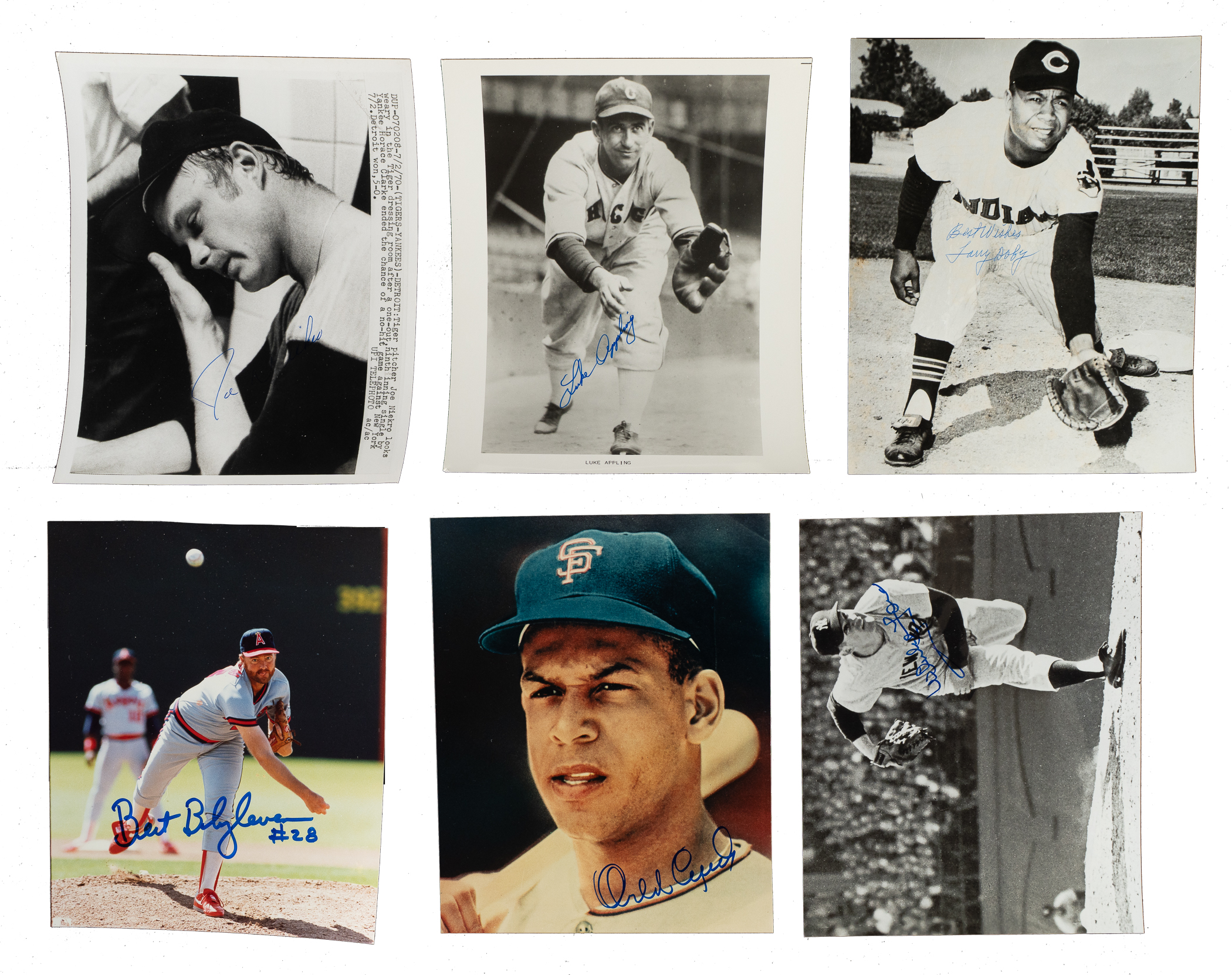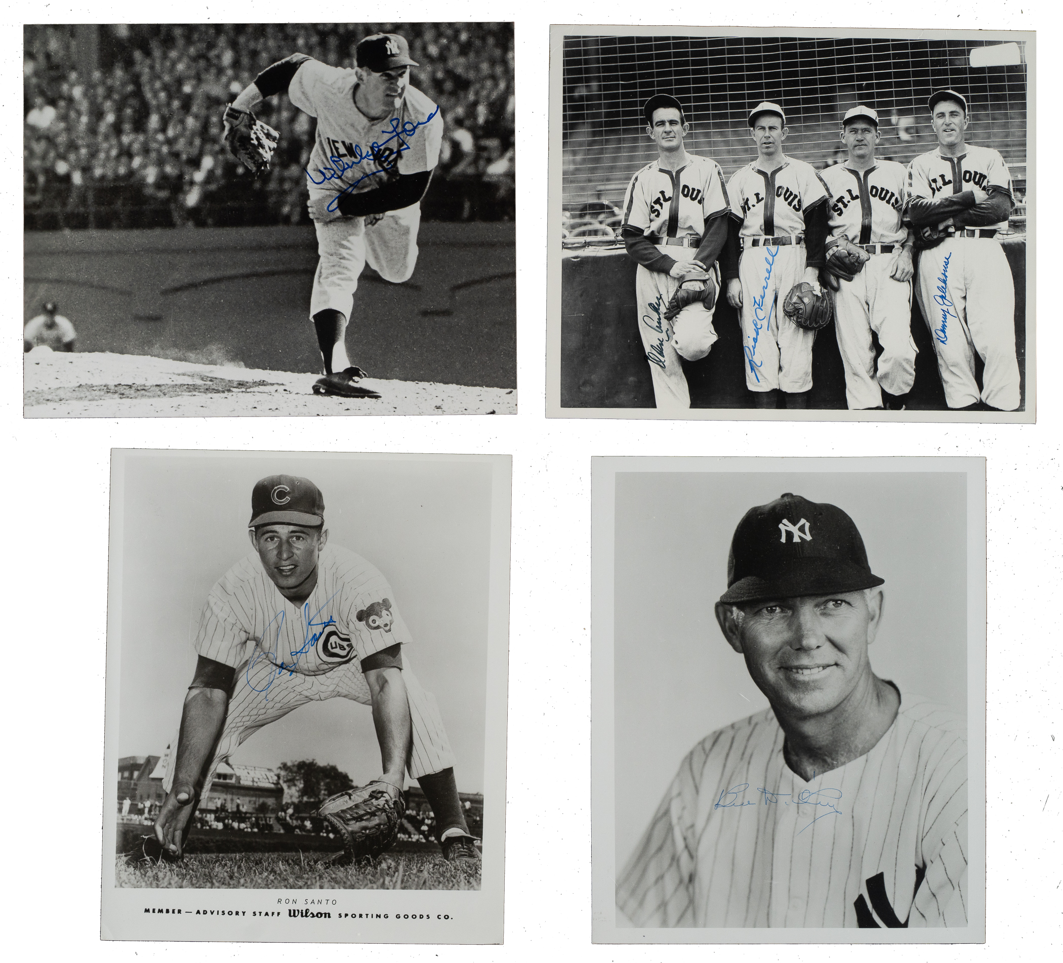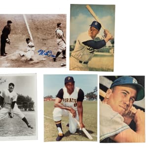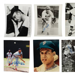 Sizeable collection of 85 photographs, each signed on the front by the player pictured (in some cases more than one player or a broadcaster or umpire), including the signatures of 23 Hall of Famers. The signatures are scripted in a variety of inks. The photographs are mostly vintage (including a few press photos), measure 8 x 10 inches (with some smaller), and range from Good to Excellent, averaging Very Good (includes a few lesser). This collection consists of the following: Sparky Adams, Dewey Adkins, B. Allison (personalized), Joe Amalfitano, Paul Andrews, Appling (HOF), Bartell, Ewell Blackwell, Blass, V. Blue, Blyleven (HOF), Joe Buck (personalized), Caligiuri, Harry Caray ("Holy Cow"), Cepeda (HOF), B. Chapman, two Bob Costas (one personalized), Shag Crawford (umpire), Rod Dedeaux (USC baseball coach), Dickey (HOF), Doby (HOF), Durocher (HOF, personalized), Jesse Flores, Ford (HOF), Deb Garms, Gentry, Gerheauser (personalized), T. Harper, Ernie Harwell, Hubbell (HOF), Irvin (HOF), Bill Johnson, Kibler (umpire, personalized), Kuhn (HOF), Lafata (personalized), Lemon (HOF), two J. Lonborg (both personalized), Lum, two Marichal (HOF, one is magazine page), G. McDougald, F. Millan, two J. Niekro, Piniella, V. Power (personalized), Doug Rader, Raines (HOF), A. Reynolds (personalized), two Rizzuto (HOF, one personalized), Clarence Roland, Santo (HOF, Wilson Advisory Staff Photo), Scarborough (signed twice), two H. Schumacher (both "New York Giants, 1931-42, 46"), D. Segui, Sims, Skowron (personalized), two Snider (HOF, both are magazine pages), Stargell (HOF), Staub, R. Stephenson, John Stevens (umpire, personalized), Dick Stuart, Swoboda, Vander Meer, P. Vaughan (personalized), Wambsganss, Wasdell (personalized), Westrum, Wills, and Joe Wood (personalized). Multi-Signed (9): Ferrell (HOF)/Auker/Galehouse, Raines (HOF) with 3 others (1979 Memphis Chicks AA Team, all 4 signed on reverse), Joe Cronin (HOF, signed on back)/M. Vernon (personalized) with JFK, Doug Rader (personalized)/Ken Boswell, Al Dark/one other unidentified, Ferris Fain/Eddie Robinson, Toto Fuentes/Johnny Callison, Hank Leiber/George Davis, and B. Thomson/A. Dark/W. Lockman. Total: 85 signed photographs. Auction LOA from James Spence/JSA.