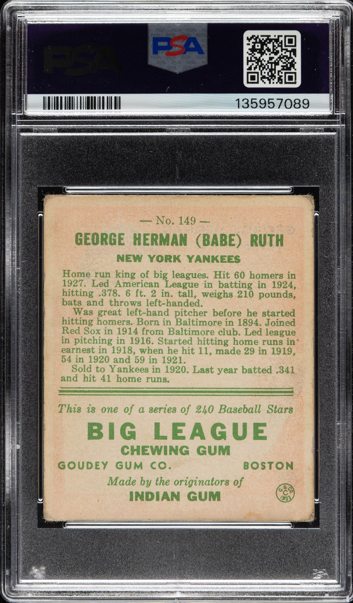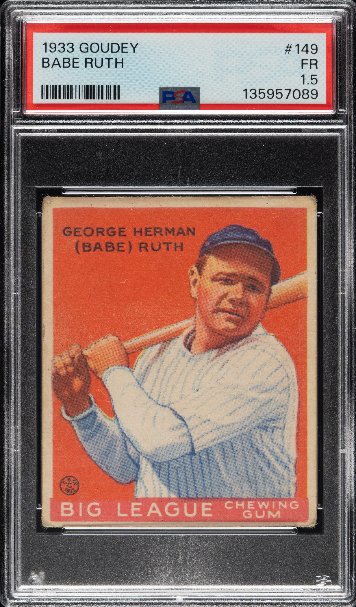 Graded FAIR 1.5 by PSA (submitted by REA). Very appealing example of one of Babe Ruth's classic cards: #149, red background, from the 1933 Goudey series. This example has a bright red background, outstanding registration, and honest corner wear. A light crease on the lower left (more noticeable on back) contributes to the assigned grade. This is a very attractive low-grade example of one of Babe Ruth's classic cards from the popular 1933 Goudey Gum series.