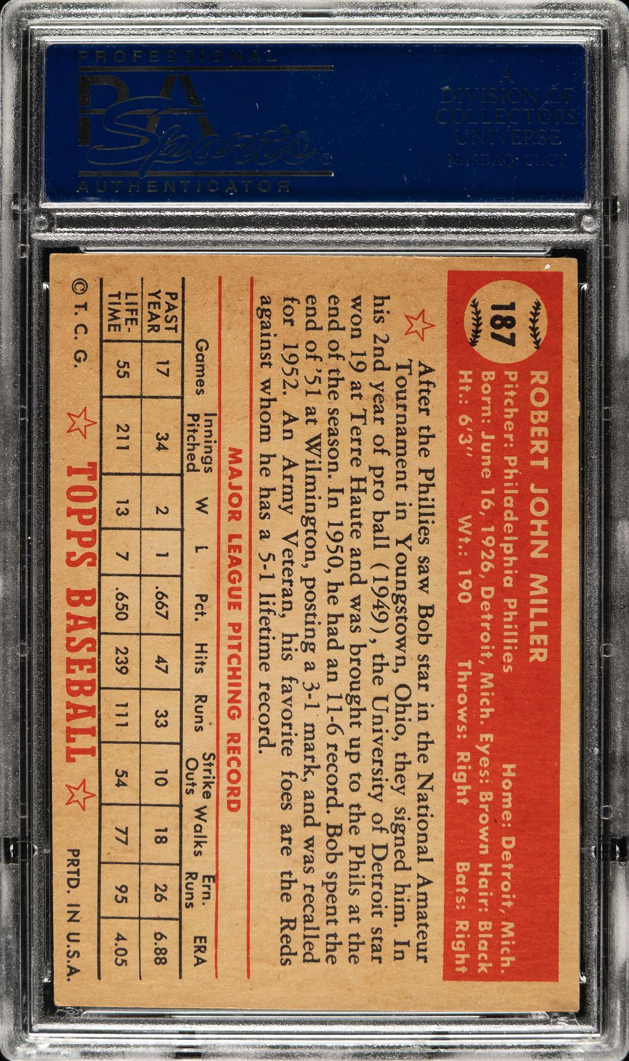 Lot # 1447: 1952 Topps #187 Bob Miller PSA EX-MT 6