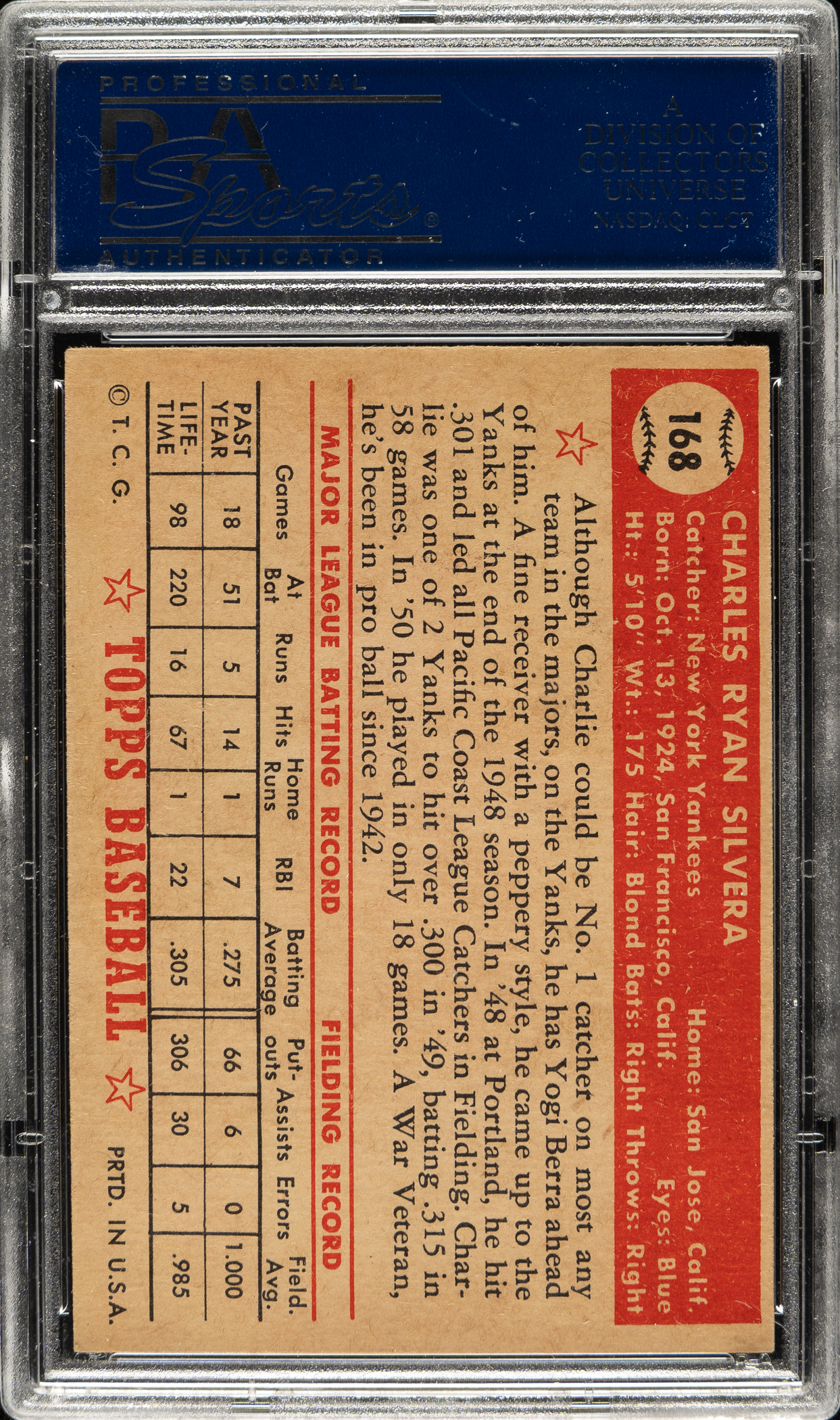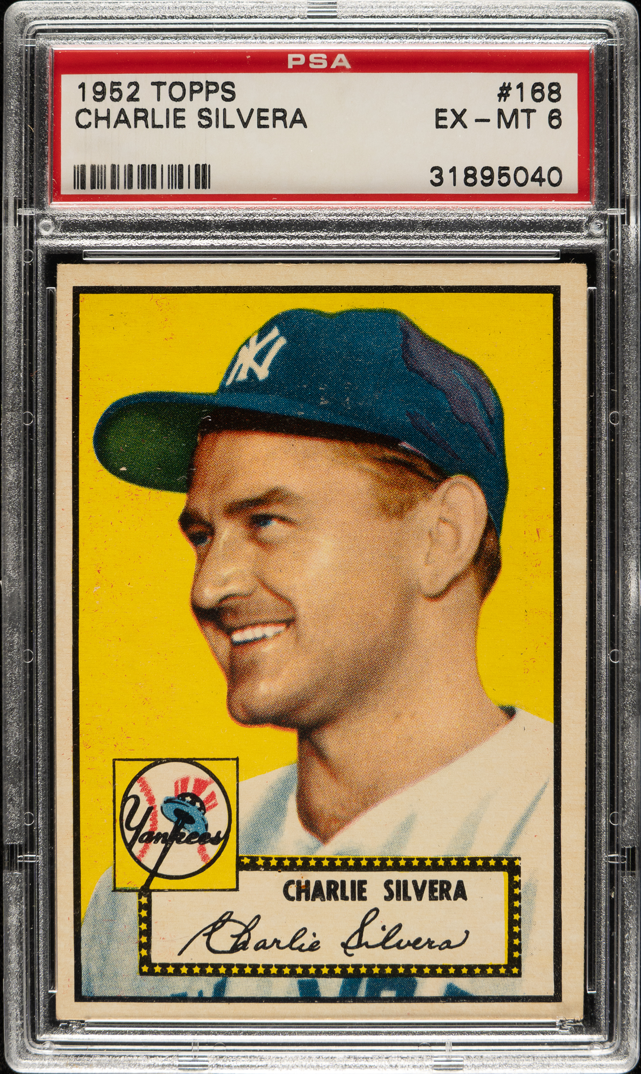 Lot # 1443: 1952 Topps #168 Charlie Silvera PSA EX-MT 6