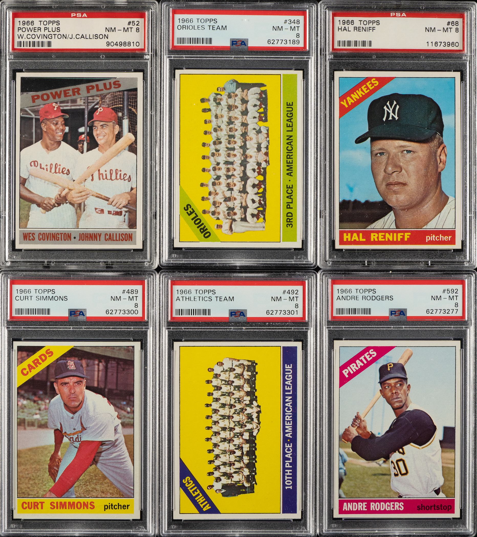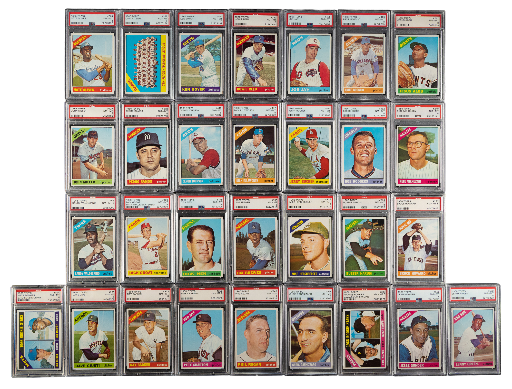Collection of thirty-six 1966 Topps cards, each graded and encapsulated NM-MT 8 by PSA. This collection consists of the following: #52, 56, 68, 103, 149, 158, 236 242, 248, 258, 274, 281, 323, 329, 347, 348, 364, 379, 385, 387, 406, 423, 427, 439, 440, 447, 454, 462, 489, 492, 497, 498, 502, 528, 574, and 592. Total: 36 cards. The size/weight of this item requires that there will be an additional shipping charge for this lot.