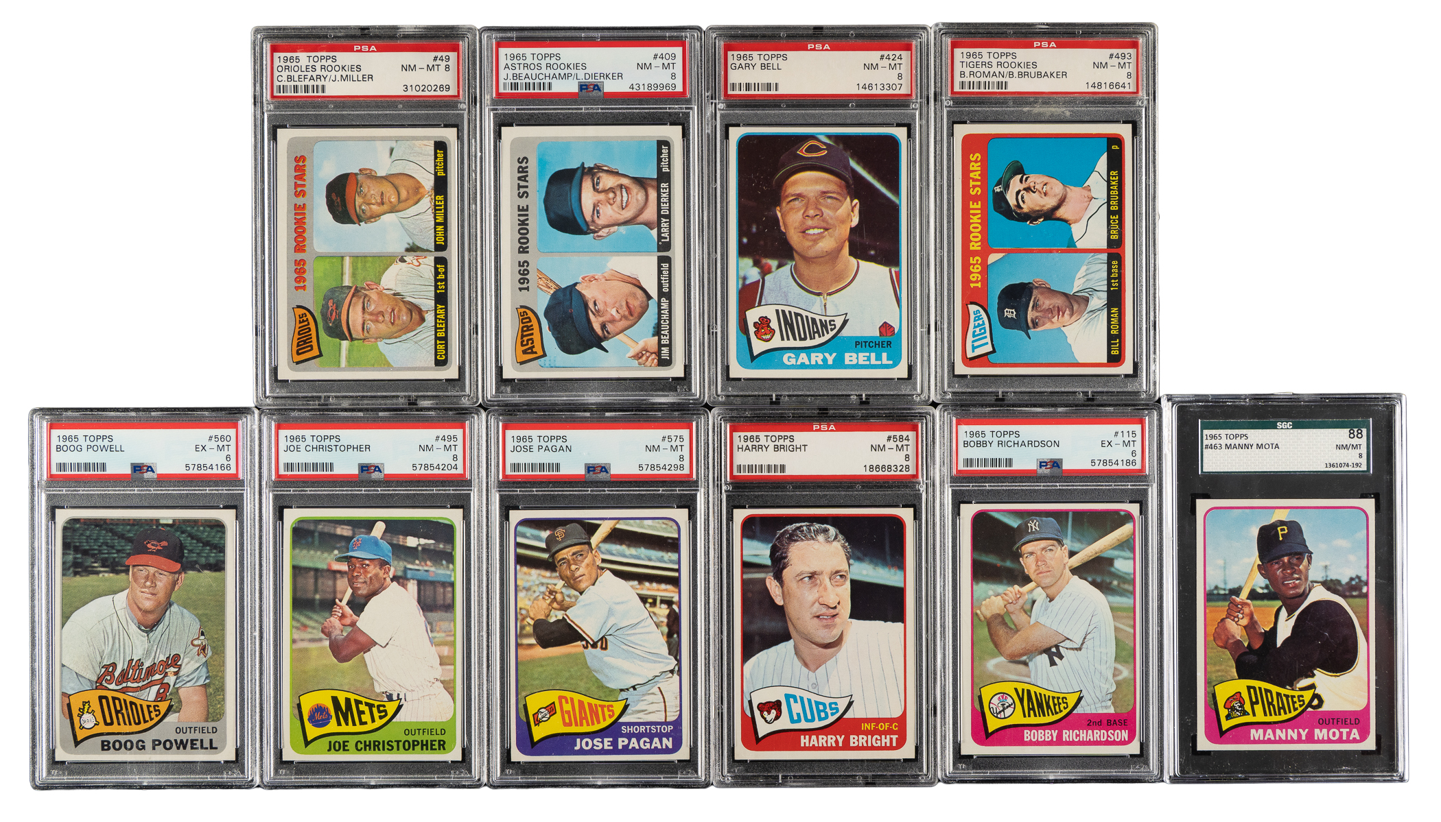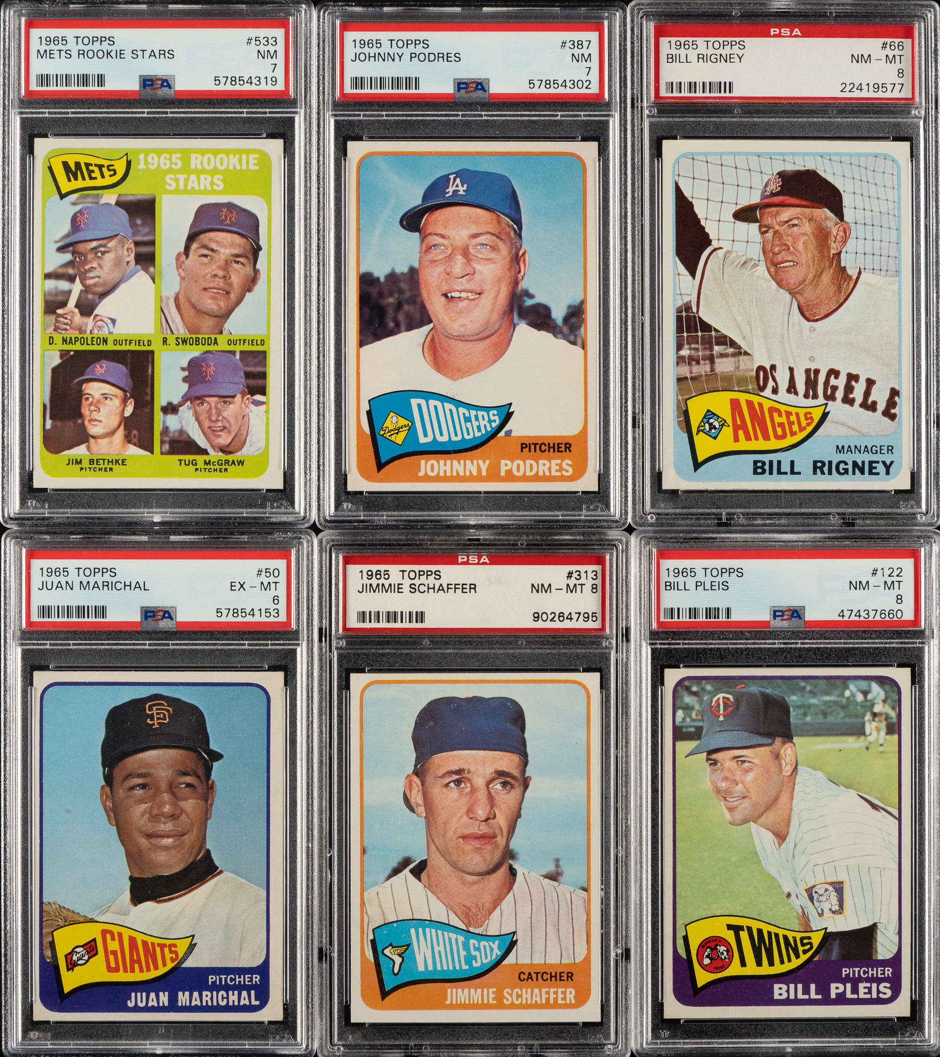 Collection of sixteen 1965 Topps cards, featuring San Francisco Giants Hall of Famer Juan Marichal. Each card has been graded and encapsulated by PSA (15) or SGC (1). PSA Grading Composite: NM-MT 8 (11 cards): #49, 66, 122, 313, 409, 424, 463 (SGC NM/MT 88), 493, 495, 575, and 584. NM 7 (2 cards): #387 and 533. EX-MT 6 (3 cards): #50 Marichal, 115, and 560. Total: 16 cards. The size/weight of this item requires that there will be an additional shipping charge for this lot.