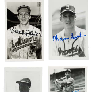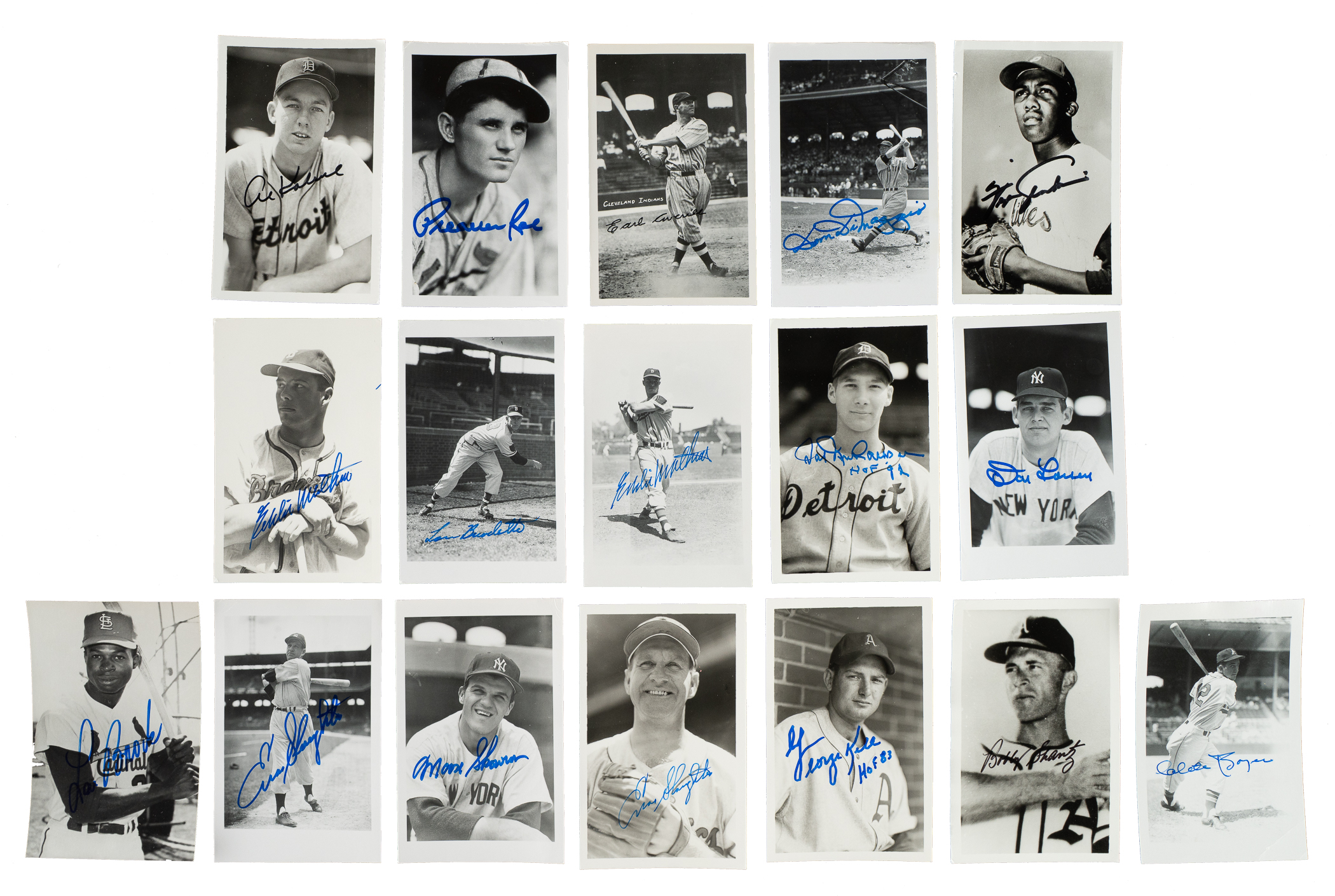 Tremendous collection of 275 George Brace B&W photographs, each signed on the front by the player pictured. This group represents player's careers that spanned from the 1930s through the 1960s. The signatures are scripted in a variety of inks. The photographs, which measure 3-1/2 x 5-1/2 inches, are in Excellent condition overall (with some slightly lesser). Each of the Brace photographs features a handwritten identifier on the reverse. This collection consists of the following: G. Anderson (HOF), Arft, L. Arroyo, two Ashburn (HOF), J. Astroth, Aust, two Averill (HOF, both real-photo postcards), Babich, Badgro, F. Baker, Basgall, Basinkski, Bauer, Baumholtz, E. Bauta, R. Beard, Bella, Bertoia, Blanchard, Blasingame, B. Blattner, Blaylock, M. Bolling, Bollweg, Boone, two Bordagaray, Borowy, Boyer, Branca, two H. Brecheen, Brock (HOF, real-photo postcard), Brosnan, Bobby Brown, Brucker, Burbrink, Burdette, T. Byrne, Calderone, T. Carroll (1955-1959), Castigilone, C. Chambers (personalized), Chapman, two A. Clark, P. Clark, Clifton, G. Coan, R. Cole, J. Coleman, Collum, Coscarart, Crandall, J. Cunningham, H. Danning, Dark, C. Davis, V. Davis, two Delsing, DeMaestri, C. Dempsey, S. Dente, two Diering, B. Dillinger, D. DiMaggio, Dittmer, Dumpert, Duren, Erautt, Erskine, S. Esposito, Essegian, two Fain, two H. Franks, J. Frazier, E. Freese, Friend, Gardella, N. Garver, Gionfriddo, Glaviano, Glynn, Grammas, D. Gray, Del Greco, Groat, Gromek, R. Gumpert, Gutteridge, Hacker, I. Hall, C. Harmon, G. Hatton, Hayworth, Hearn, two S. Hemus, two Henrich, Hermanski, Hoop, Houk, Howerton, Jim Hughes (1952-1957), two Billy Hunter, two S. Jacobs, L. Jansen, J. Javier, H. Jeffcoat, Jenkins (HOF), Jethroe, three Bill Johnson, Darrell Johnson, two E. Collins Jr., two Jurges, Kaline (HOF), Kasko, Keegan, G. Kell (HOF 83), S. Kell, B. Kennedy, N. King, Kretlow, Kucks, two W. Kurowski, Labine, M. Lanier, P. LaPalme, Larsen, Lasorda (HOF), Lawrence, J. Lemon, B. Lewis, Duffy Lewis, two Limmer, R. Lint, Littlefield, Lodigiani, Logan, V. Lombardi, Lonnett, H. Lopez, Lumpe, J. Lynch, Mahaffey, Mantilla, M. Marrion, Marshall, two M. Martin, Masterson, three Mathews (HOF), G. Mauch, C. Maxwell, M. May, McDougald, L. Merriman, L. Merritt, Merullo, R. Meyer, Miksis, S. Miller, Mizell, Moon, J. Moore, two B. Morgan, L. Moss, B. Muffett, R. Murray, two L. Myers, Narleski, Neeman, R. Nelson, Newhouser (HOF 92), W. Nixon, I. Noren, Nuxhall, Ostowski, Outlaw, Pafko, A. Parker, Pesky, B. Pierce, Pignatano, Podres, Pyburn, Ramazzotti, Renna, B. Robinson (HOF), H. Robinson, two Roe, two B. Rogell (one '1935 World Champs Detroit Tigers'), Roseboro, Rosen, B. Rush, two Russo, Sain, R. Sanchez, Sauer, W. Schmidt, J. Schmitz, Score, Shantz, Shantz, B. Shepard, N. Sherry, E. Shore, Sisti, Skowron, three Slaughter (HOF), J. Small, Smalley, Hal Smith (1956-1965), Spahn (HOF), Speake, G. Staley, Stanky, Stobbs, Strickland, Strunk, two Suder, Sukeforth, H. Sullivan, Tebbetts, C. Templeton, Thomson, F. Torre, two C. Travis, Trucks, Turley, Tuttle, Vander Meer, B. Virdon, B. Wade, C. Walker, W. Westlake, D. Whitman, Wietelmann, Wilber, Wilhelm (HOF), D. Williams (HOF), R. Wilson, K. Wood, Woodling, B. Wright, Whit Wyatt, Wyse (personalized), Yvars, and C. Travis/B. Lewis (dual signed).Total: 275 signed photographs. Auction LOA from James Spence/JSA.