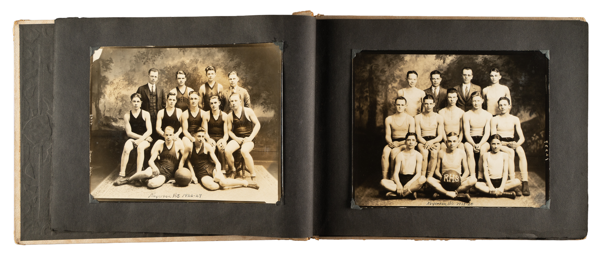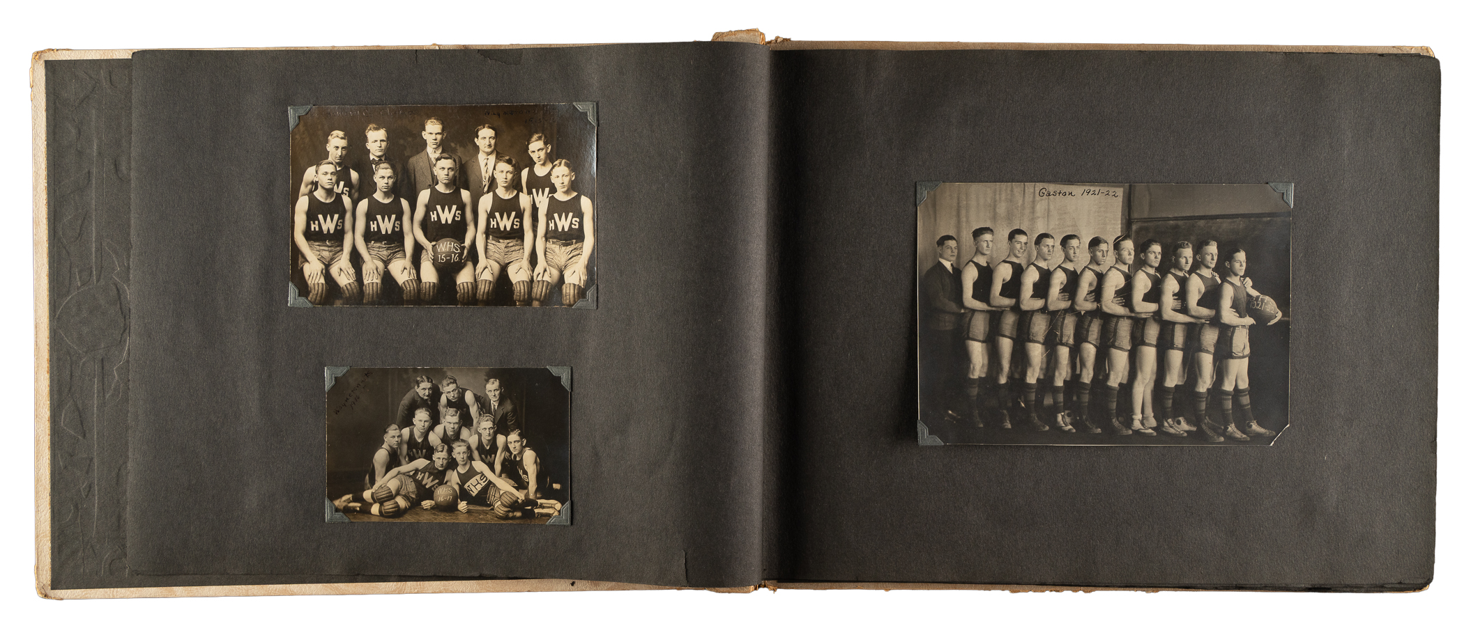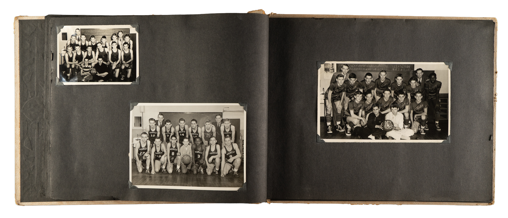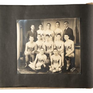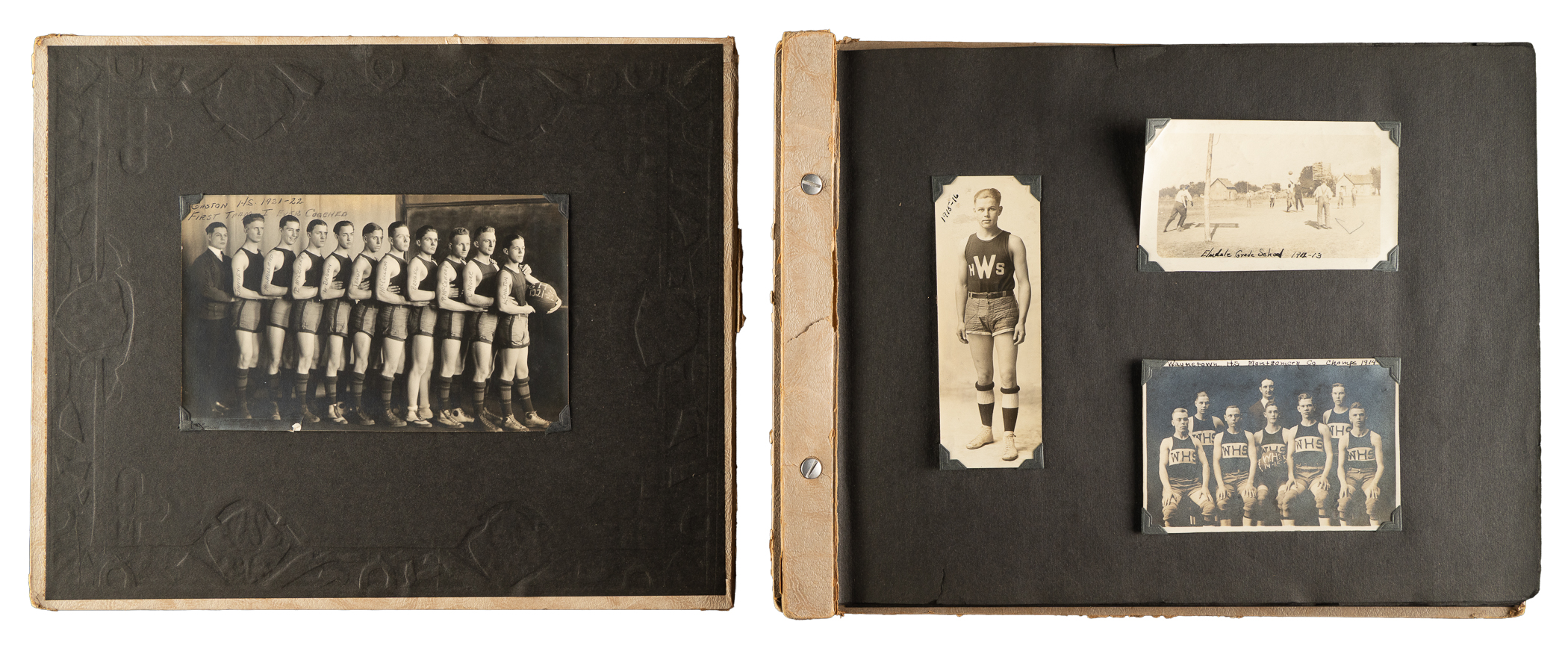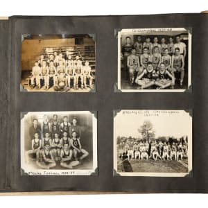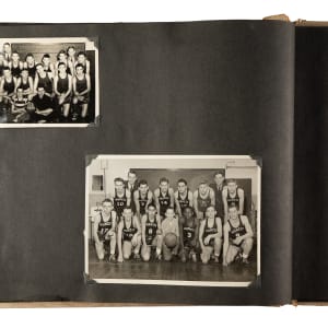 Collection of 48 photos housed in a vintage photo album largely featuring Indiana high school baseball and basketball teams from the 1910s to the 1940s. Each photo is affixed to the album via photo corners, with the exception of a cabinet photo (10 x 9 inches, Vg) capturing a basketball team from 1916. Most of the photos bear handwritten notations identifying the year and/or the high school. While some of the photo corners are loose, the photos are in Excellent condition overall. The album's (15 x 11) front cover is completely detached, but included. The album's spine covering is missing entirely. Fair condition overall. Total: 48 photographs.