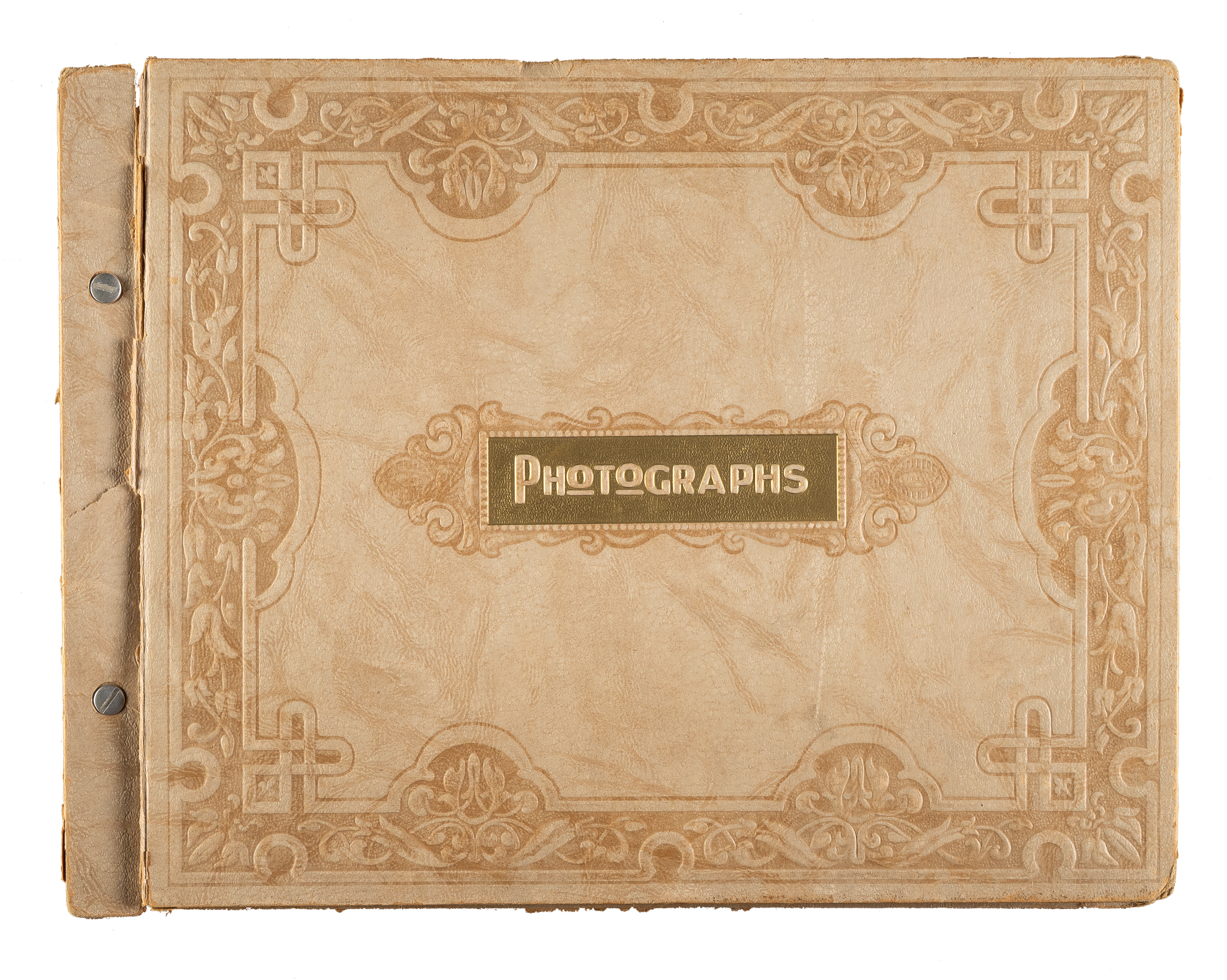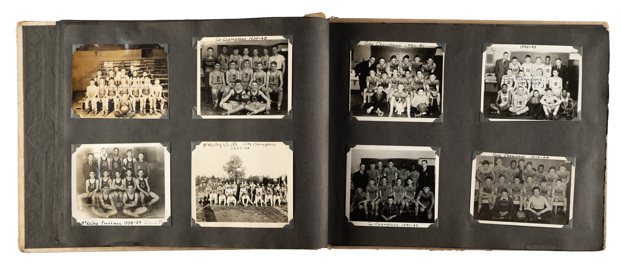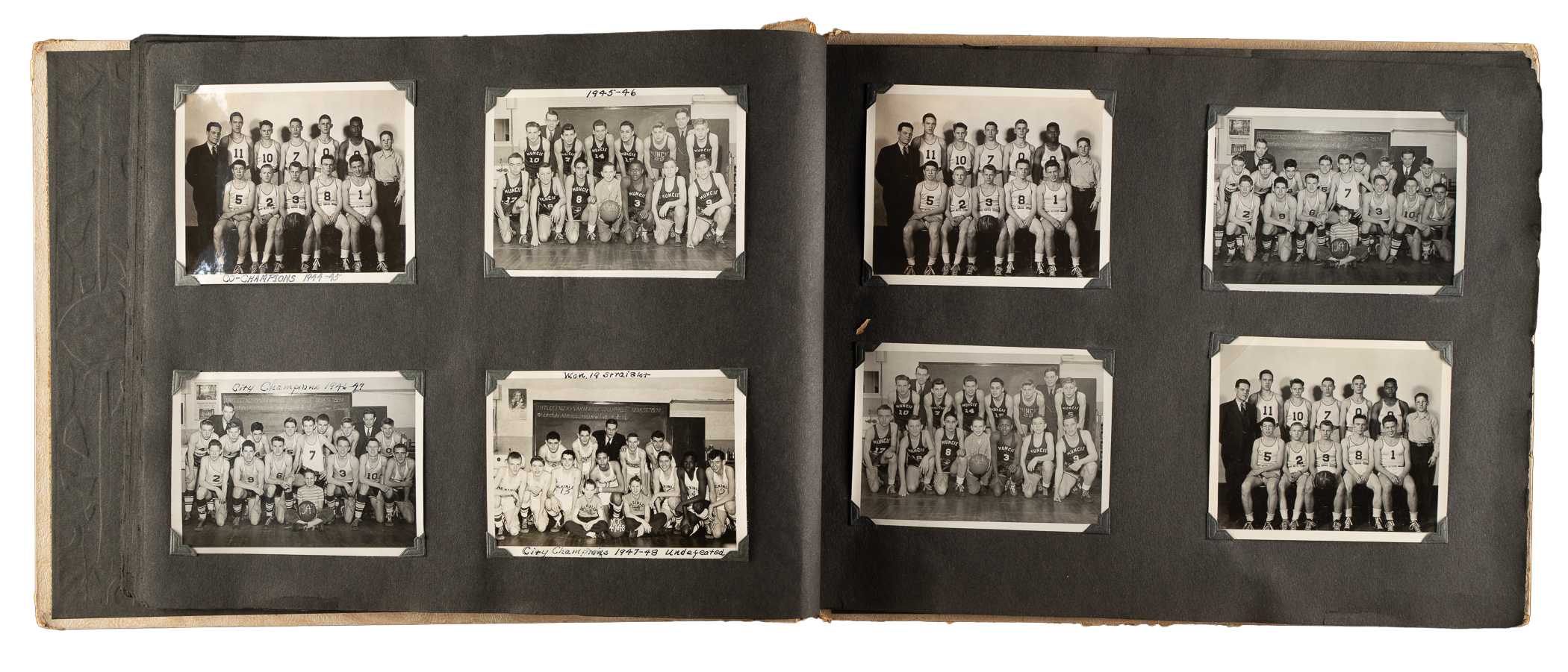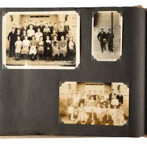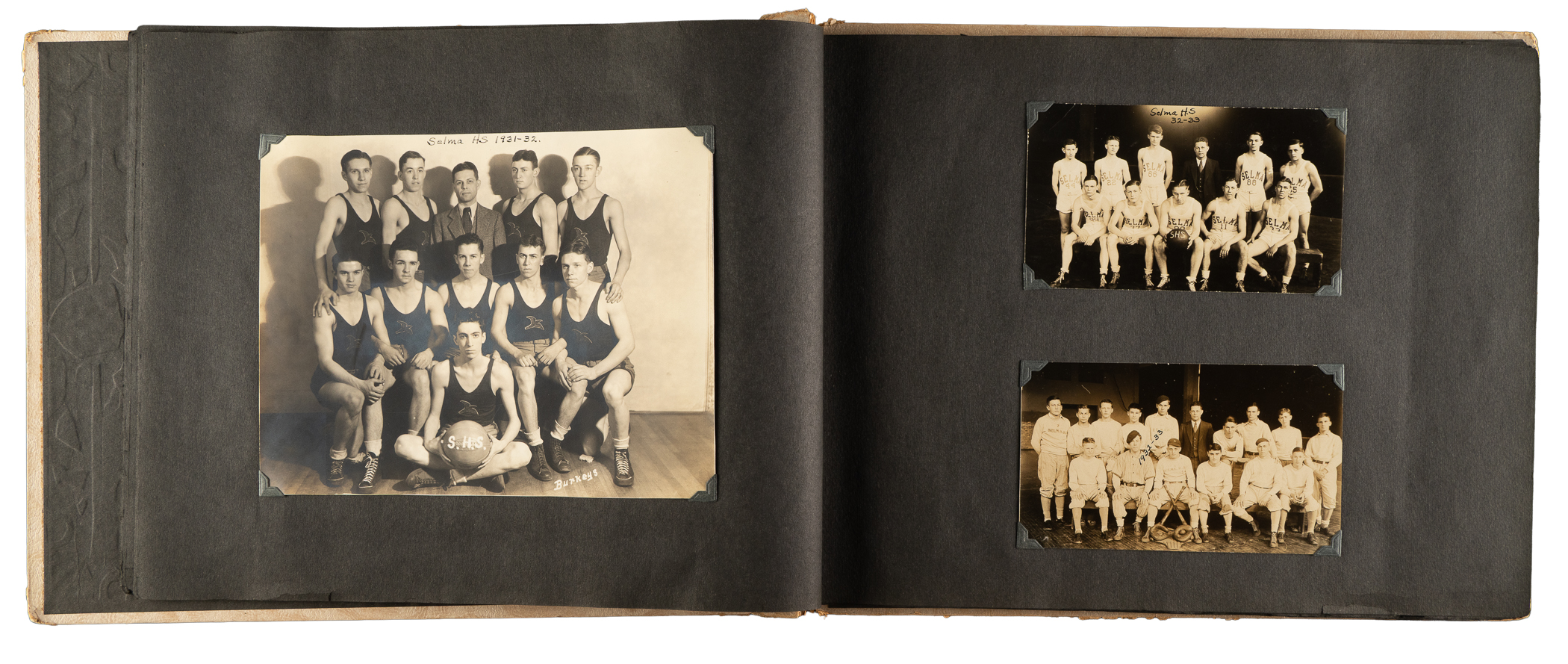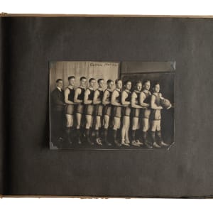 Collection of 48 photos housed in a vintage photo album largely featuring Indiana high school baseball and basketball teams from the 1910s to the 1940s. Each photo is affixed to the album via photo corners, with the exception of a cabinet photo (10 x 9 inches, Vg) capturing a basketball team from 1916. Most of the photos bear handwritten notations identifying the year and/or the high school. While some of the photo corners are loose, the photos are in Excellent condition overall. The album's (15 x 11) front cover is completely detached, but included. The album's spine covering is missing entirely. Fair condition overall. Total: 48 photographs.