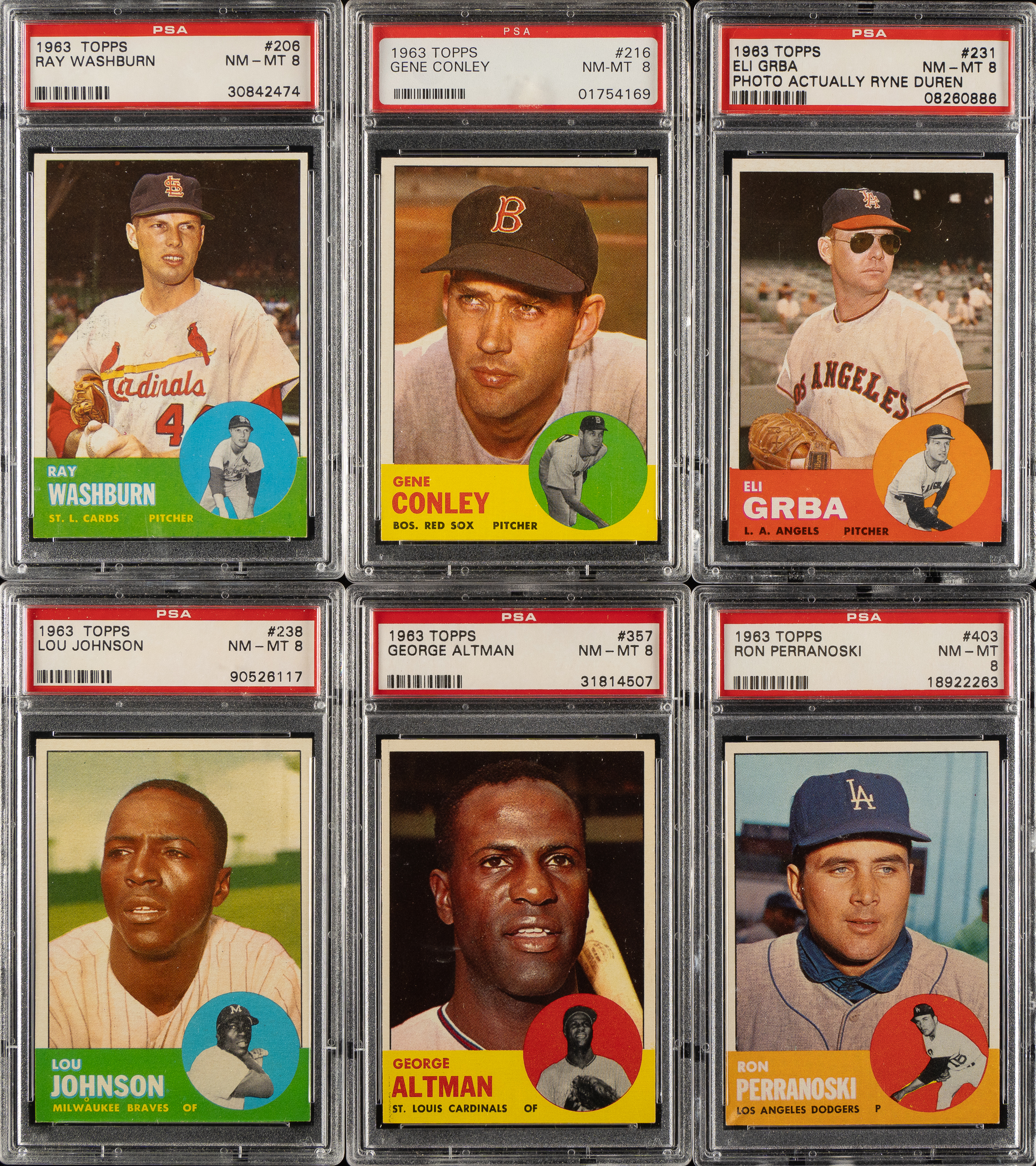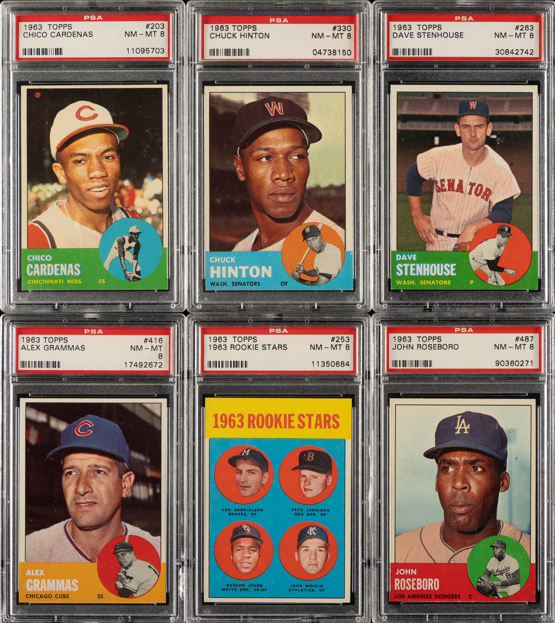 Collection of twelve 1963 Topps cards, each graded and encapsulated NM-MT 8 by PSA. This collection consists of the following: #203, 206, 216, 231, 238, 253, 263, 330, 357, 403, 416, and 487. Total: 12 cards. The size/weight of this item requires that there will be an additional shipping charge for this lot.