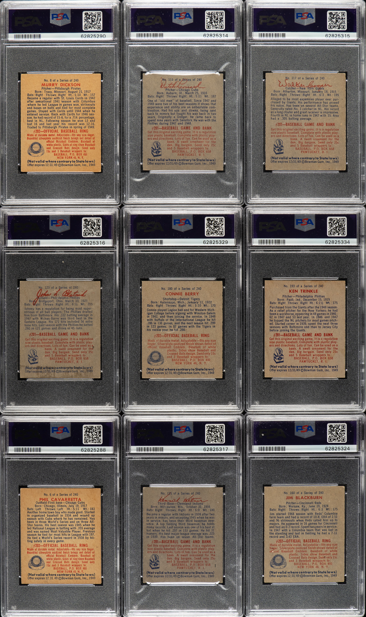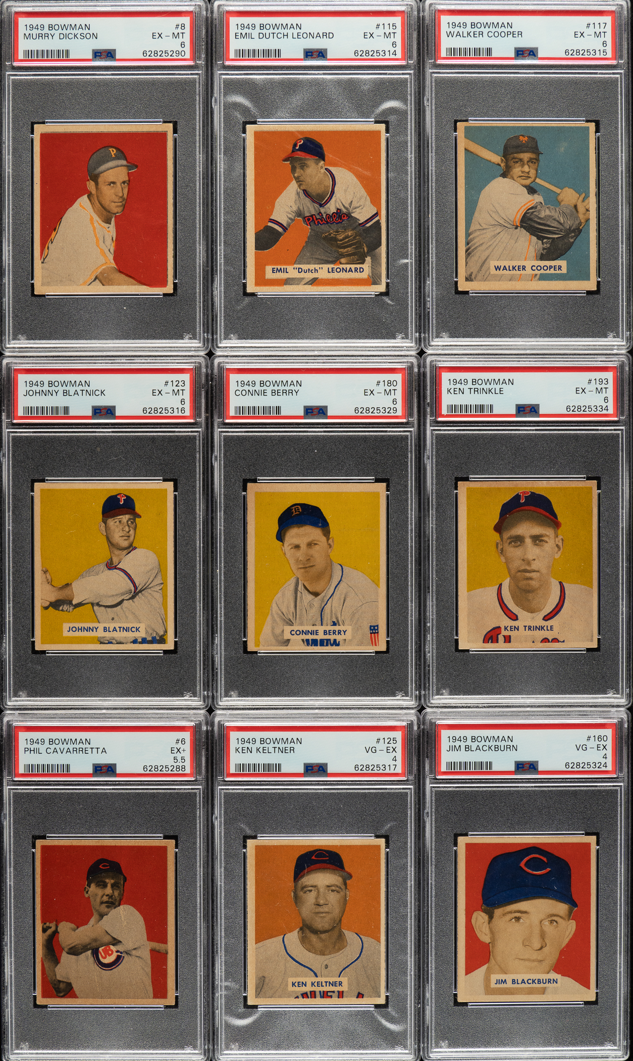 Collection of nine 1949 Bowman cards, each graded and encapsulated by PSA. PSA Grading Composite: EX-MT 6 (6 cards): #8, 115, 117, 123, 180, and 193. EX+ 5.5 (1 card): #6. VG-EX 4 (2 cards): #125 and 160. Total: 9 cards.