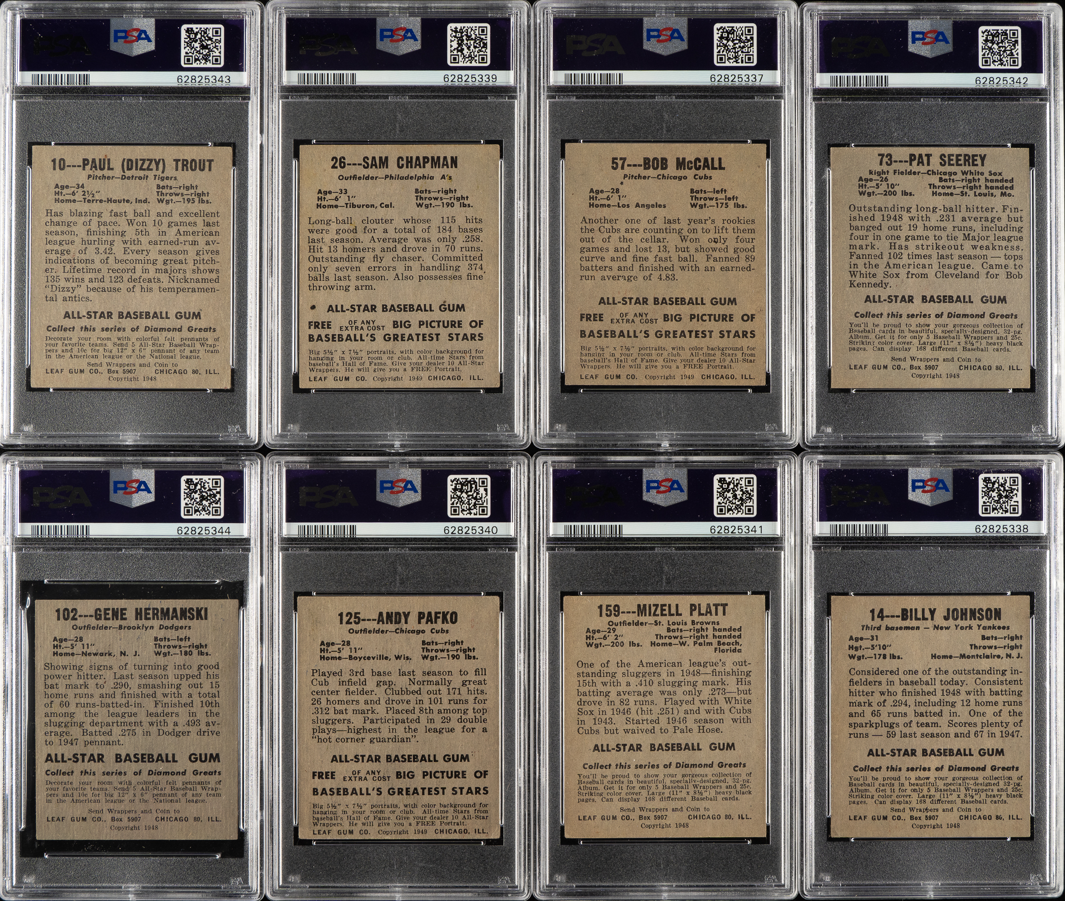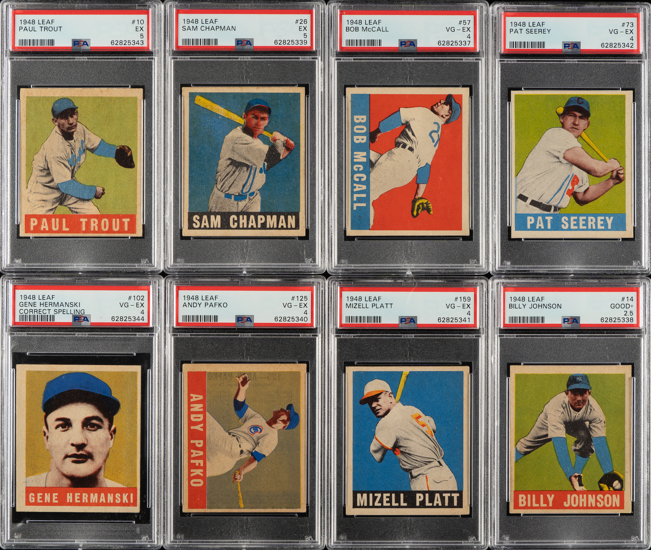 Collection of eight 1948-1949 Leaf cards, each graded and encapsulated by PSA. PSA Grading Composite: EX 5 (2 cards): #10 and 26. VG-EX 4 (5 cards): #57, 73, 102, 125, and 159. GOOD+ 2.5 (1 card): #14. Total: 8 cards.