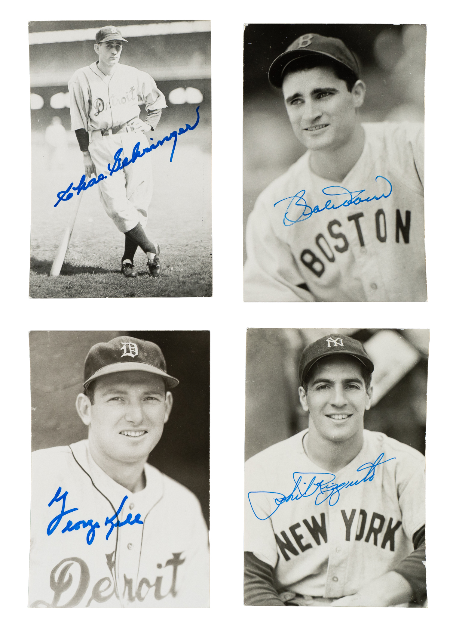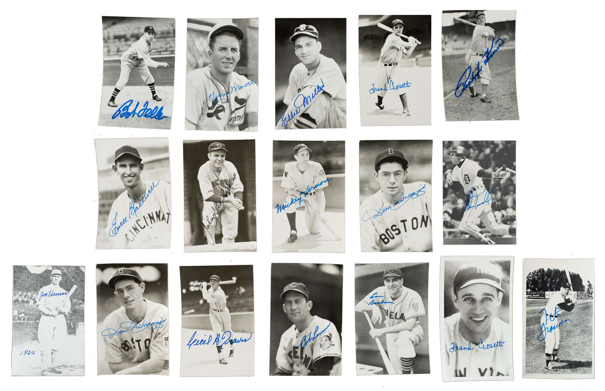 Collection of 159 black-and-white photographs, each signed on the front by the player pictured (134 different players/coaches), including the signatures of nine Hall of Famers. These photos are printed on a glossy heavy stock paper (approximately 3.5 x 5.5 inches), with each player's name handwritten on the reverse. The majority of the players featured in the collection played between the years 1930 and 1950. The signatures are scripted in a variety of inks and the photos are in Excellent to Mint condition overall (with a few lesser). This collection consists of the following: Adams, Batts, Benge, Blackwell, Blattner, two Bordagaray, Boudreau (HOF), Branca, Brancato, Brecheen, M. Brown, Buchek, Bucher, Byerly, two Camilli, Carty, Cavaretta, Chapman, M. Clark, Coscarart, six Crosetti, Cross, A. Cuccinello, T. Cuccinello, six Cunningham, Danning, Dark, Delker, two D. DiMaggio, Doerr (HOF), Dorish, Endicott, two English, Epps, Feller (HOF), Ferris, seven Francona, Franks, Galehouse, Garagiola, Garrison, Gaston, Gehringer (HOF), Gillenwater, Groat, Grodzicki, Gromek, Gumbert, Gutteridge, Haas, Harder, Harmon (personalized), G. Harris, Hartung, Hassett, J. Hauser, Hearn, Hermanski, B. Hitchcock (personalized), Hodgin, T. Holmes (signed twice), Hopp, Hudlin, Jarvis, N. Jones, Joost, Jorgenson, E. Collins Jr., Jurges, Kasko, Kell (HOF), Kennedy, Kimball, Kiner (HOF), King, Kurowski, Kurowski, Lake, C. Leibrandt, Lemon (HOF), Lewis, Linzy, Lipon, Litwhiler, Logan, Lupien, Marshall, S. Martin, May, McDaniel, McLish, E. Miller, Monaco, Moore, Morde, Mullin, Myers, Narron, Olson, A. Parker, Peel, Pesky, G. Pipgras, Raffensberger, Repass, Rigney, Rizzuto (HOF), Roe, five Rogell (two '1935 World Champs Detroit Tigers'), C. Ryan, Sain, Sauer, Scheib, Semenick, Sessi, Sinston, Sisti, Stewart, two D. Stone, Suhr, Sunkel, Thomson, Trammell (HOF), two C. Travis, Valo, Vander Meer, Vernon, Voiselle, Watson, Westlake, Wilbur, Wood, Wyatt, and Zuverink. Total: 159 signed photographs. Auction LOA from James Spence/JSA.