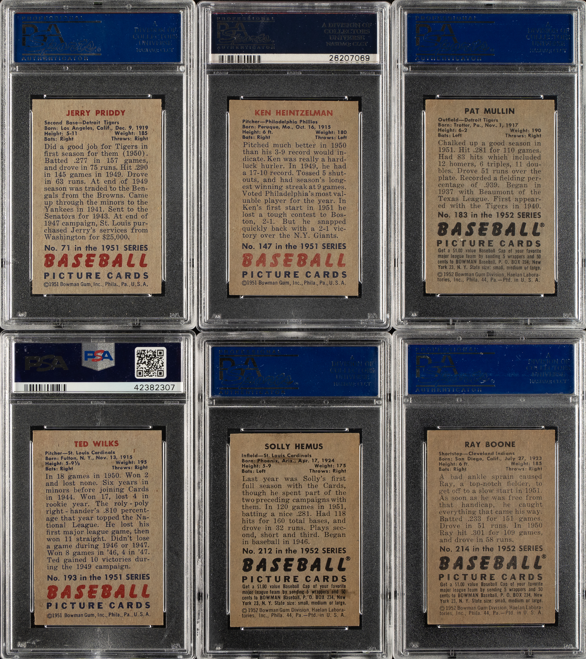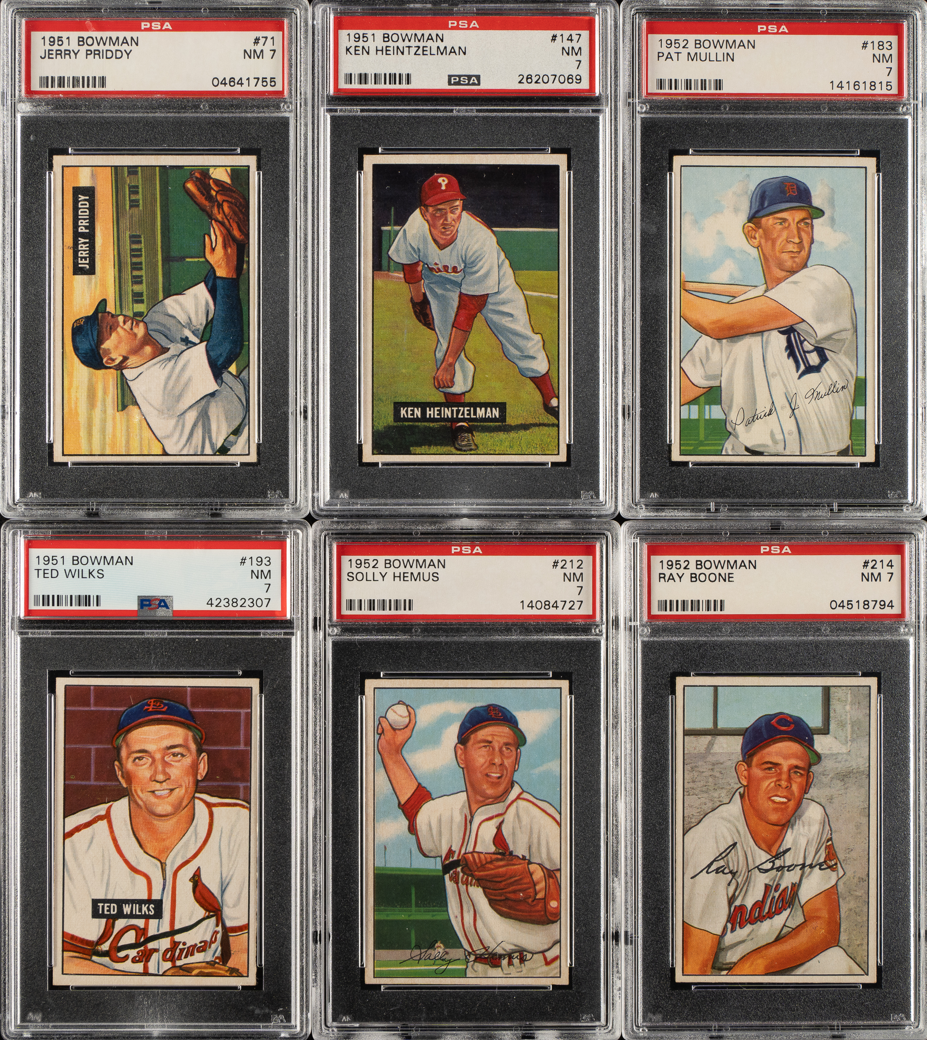 Collection of six 1951 Bowman cards, each graded and encapsulated NM 7 by PSA. This collection consists of the following: #71, 147, 183, 193, 212, and 214. Total: 6 cards.
