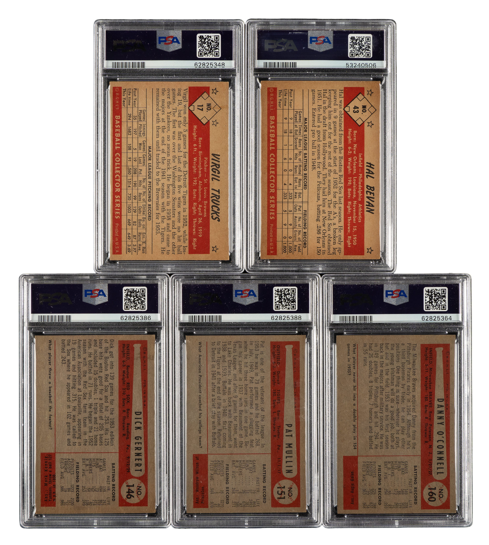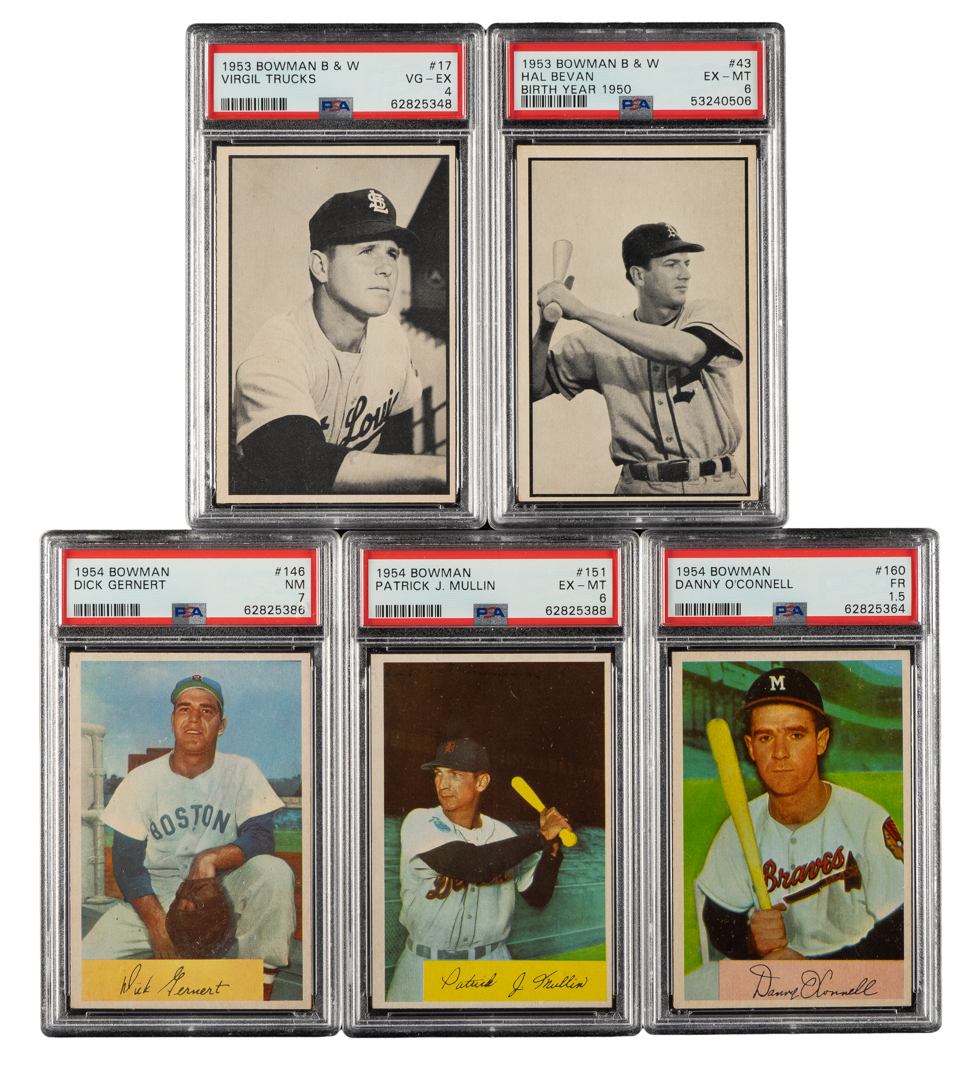 Collection of five 1953 and 1954 Bowman cards, each graded and encapsulated by PSA. This collection consists of the following: 1) 1953 Bowman Black & White (2 cards): #17 (VG-EX 4) and 43 (EX-MT 6). 2) 1954 Bowman (3 cards): #146 (NM 7), 151 (EX-MT 6), and 160 (FAIR 1.5). Total: 5 cards.