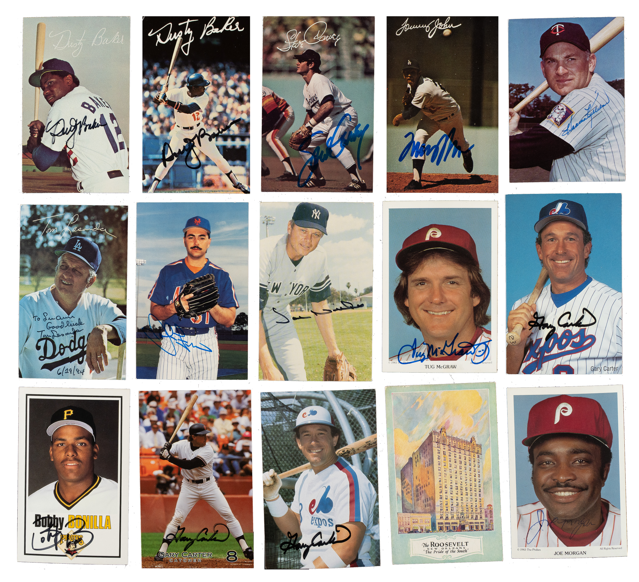 Collection of 89 assorted (75 different players/coaches) team-issued postcards and photographs, each signed on the front by the respective player. Highlighted by Harmon Killebrew and Gary Carter. Condition of the items are Excellent overall (with twelve lesser, Fr condition). This collection consists of the following: Amalfitano, three Appier, Bailey (signed on reverse), two Baker, Basgall, Bonilla, Brenly, Bumbry, Burkett, four Carter (HOF), Cey, W. Clark, Crandall, Dawson (HOF), J. Edwards, Franco, Friend, two Gamble, Gardner, Garr, Garvey, two Grace, Gruber, Haller, Hayes, Hooton, Incaviglia, G. Jefferies, John, A. Johnson, two Killebrew (HOF), two N. King, two Kline, Krukow, Kuiper, Lasorda (personalized, HOF), Law ('1960 Cy Young Award'), T. Lee, Locker ('wrong side of town'), Lopes, Magadan, T. McGraw, McRae, Merced, Michael, Morgan (HOF), Neiman, J. Niekro, O'Dell, Odom, Oester, Palmer (HOF), Raschi (The Roosevelt Hotel Postcard, signed on reverse), Roenicke, S. Rogers, Rosboro, two Rudi, B. Russell, Samuel, P. Schourek, Shantz (The Roosevelt Hotel Postcard, signed on reverse), Sheets, Sherry, Slaughter (The Roosevelt Hotel Postcard, signed on reverse, HOF), Van Slyke, R. Smith, two Sutcliffe, Tenace (signed on reverse), Teufel, Torborg, Virdon, Watson, Welch, Wills, T. Wilson, and Wynn (HOF). Total: 89 signed items (team-issued photographs and postcards). Auction LOA from James Spence/JSA.