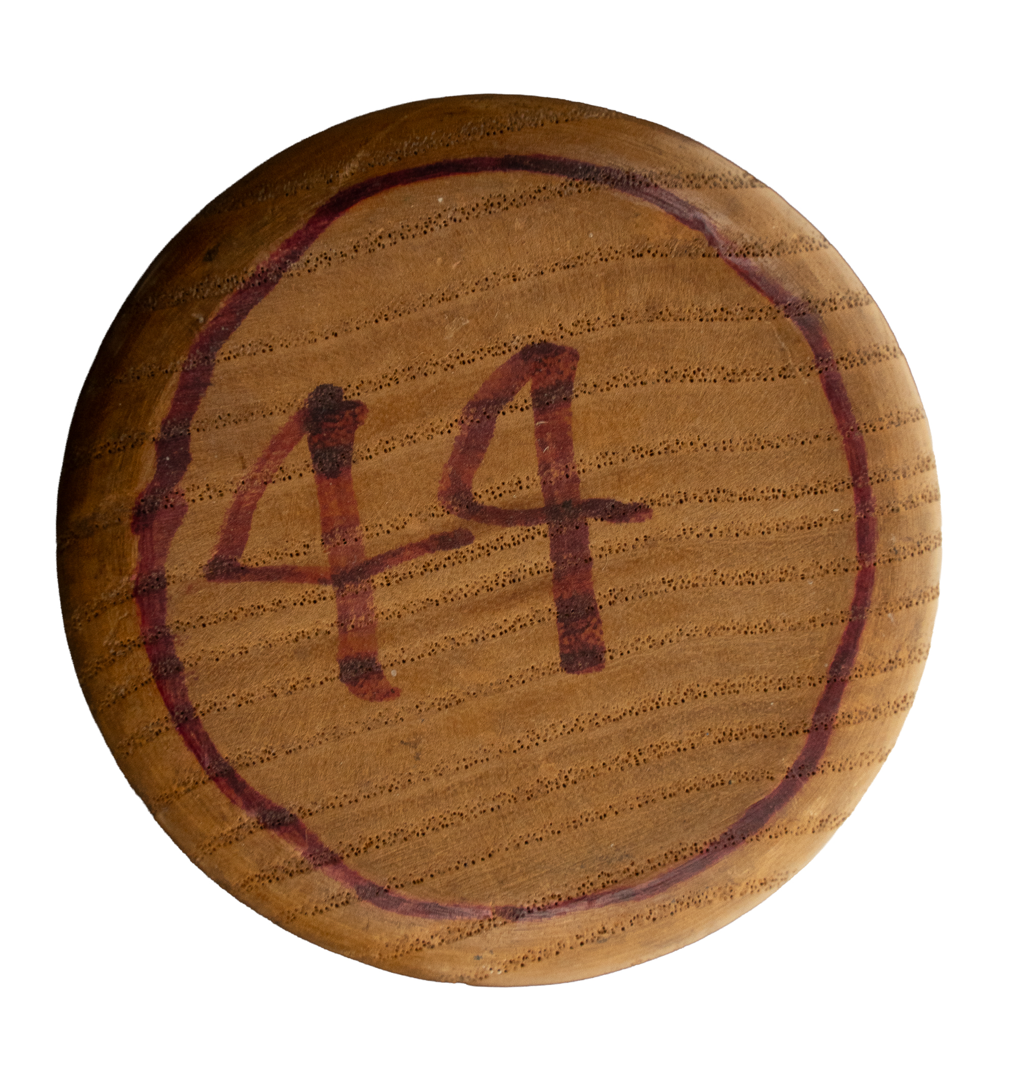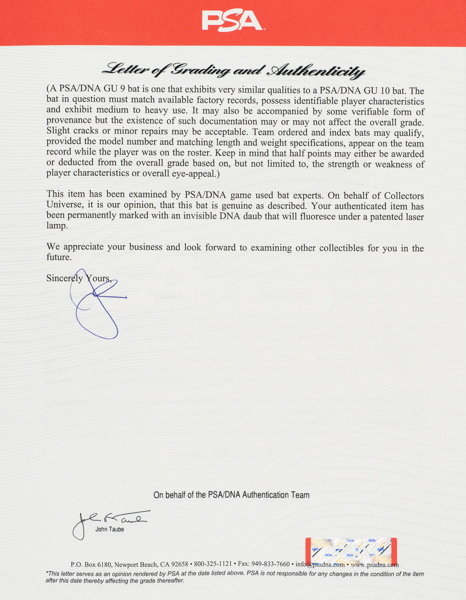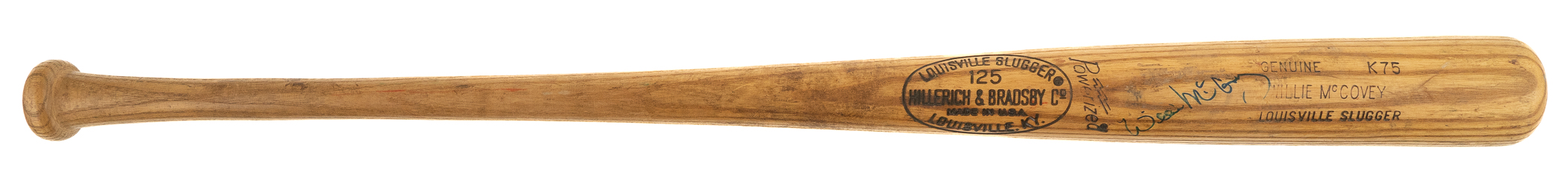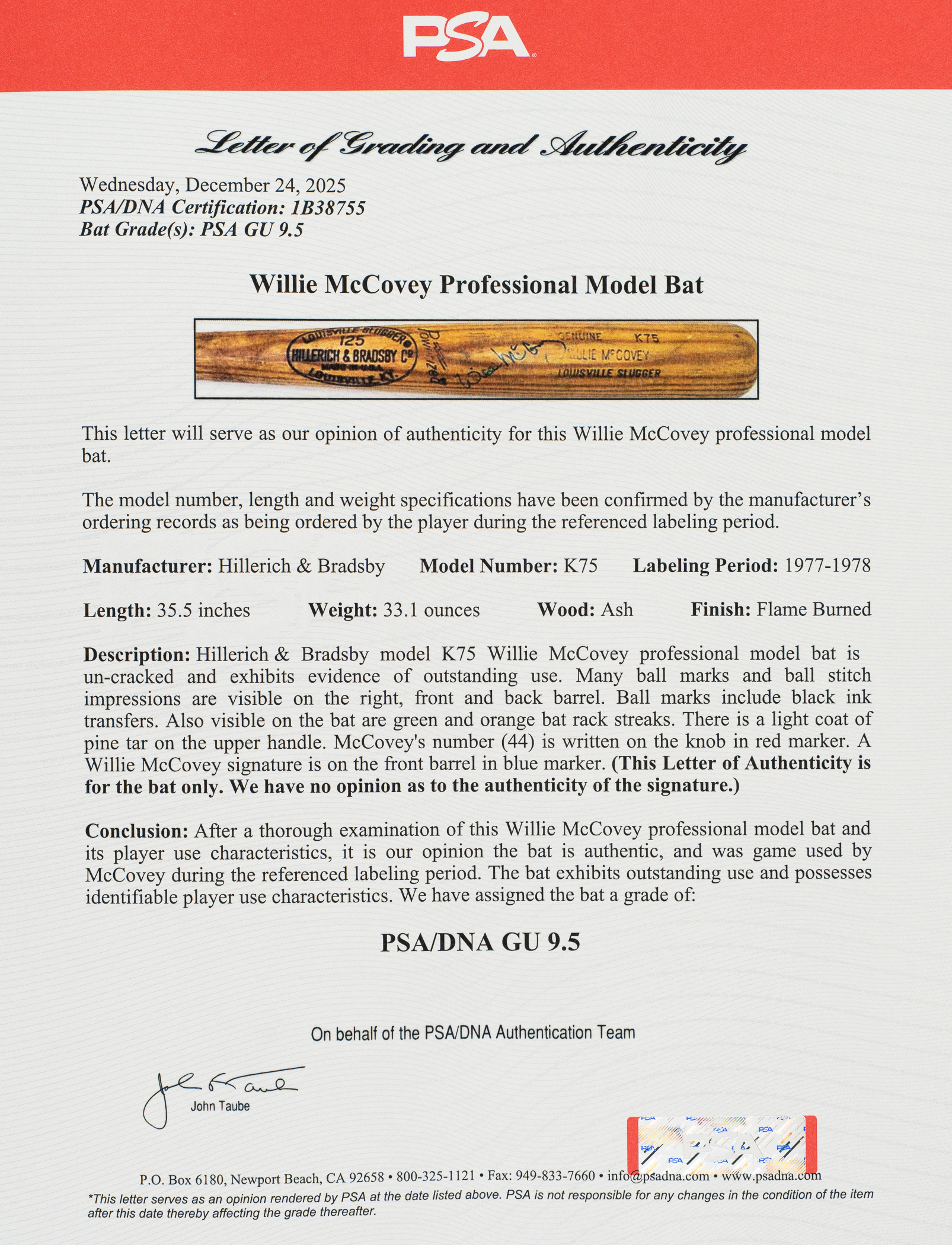 Willie McCovey H&B signature-model ("K75") bat dating from the 1977-1978 labeling period. Graded GU 9.5 by PSA/DNA. The bat, which is not cracked, displays evidence of heavy use along its entire length, including numerous ball marks (with black ink transfers), ball-stitch impressions, green and orange bat rack streaks, and a light application of pine tar on the upper handle. McCovey's number ("44") is written on the knob in red marker. McCovey has signed the bat in marker on the barrel. McCovey began his Major League career in 1959 with the Giants, and even though he appeared in only 52 games that year, his 13 home runs, 38 RBI, and .354 average earned him the Rookie of the Year Award. Over the course of the next 21 seasons, McCovey was one of the game's greatest sluggers, and his lifetime total of 521 home runs ties him for 20th on the all-time list with Ted Williams and Frank Thomas. Included among many individual achievements are three home-run titles (1963, 1968, and 1969) and one MVP Award (1969). McCovey was elected to the Hall of Fame in 1986. Length: 35.5 inches. Weight: 33.1 ounces. Full LOA from John Taube of PSA/DNA (bat only, corresponding sticker affixed to the knob end). Auction LOA from James Spence/JSA (autograph only). The size/weight of this item requires that there will be an additional shipping charge for this lot.