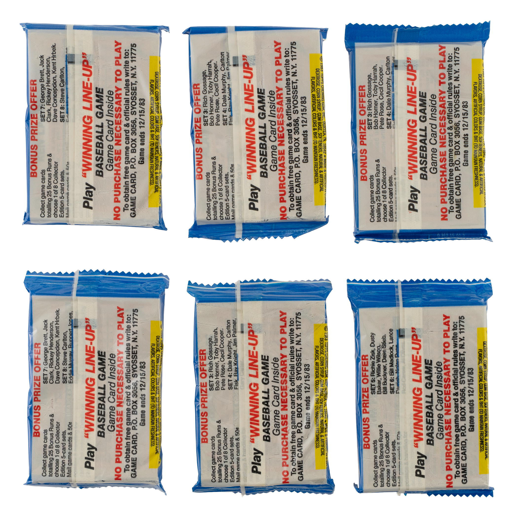 Collection of six 1983 Topps "Michigan Test" unopened wax packs. Steve Hart of the Baseball Card Exchange (the leading authority on unopened material) has personally reviewed this pack, and in his opinion, it is original and unopened. The size/weight of this item requires that there will be an additional shipping charge for this lot.