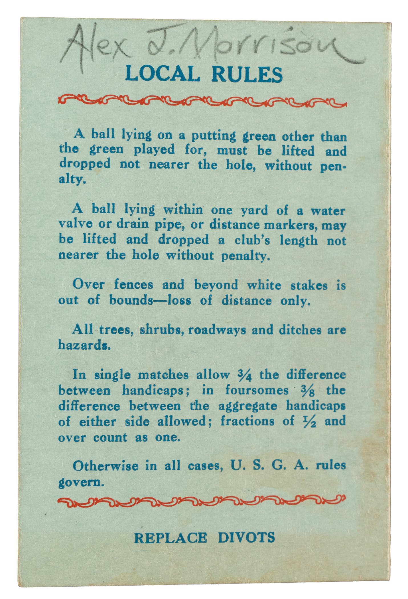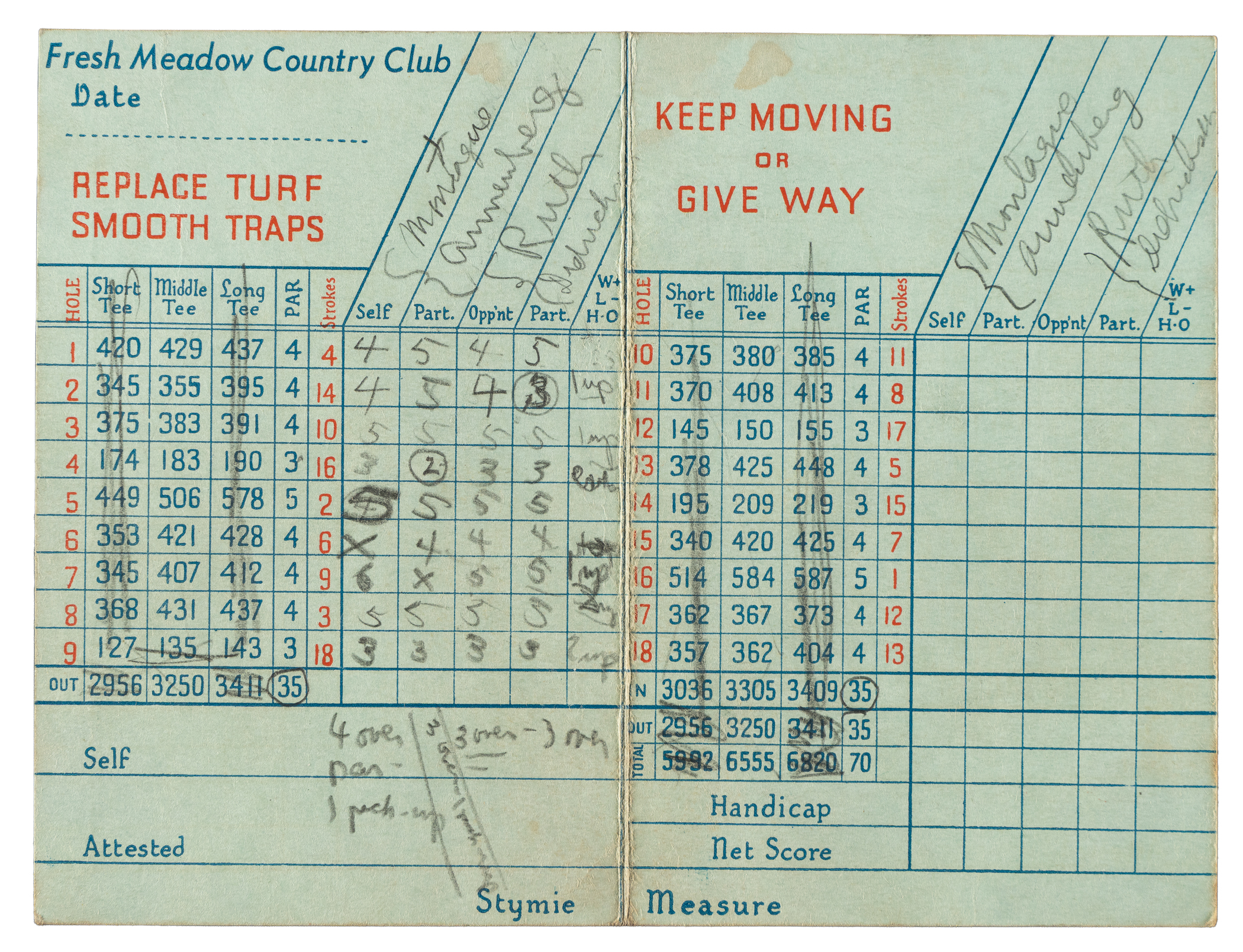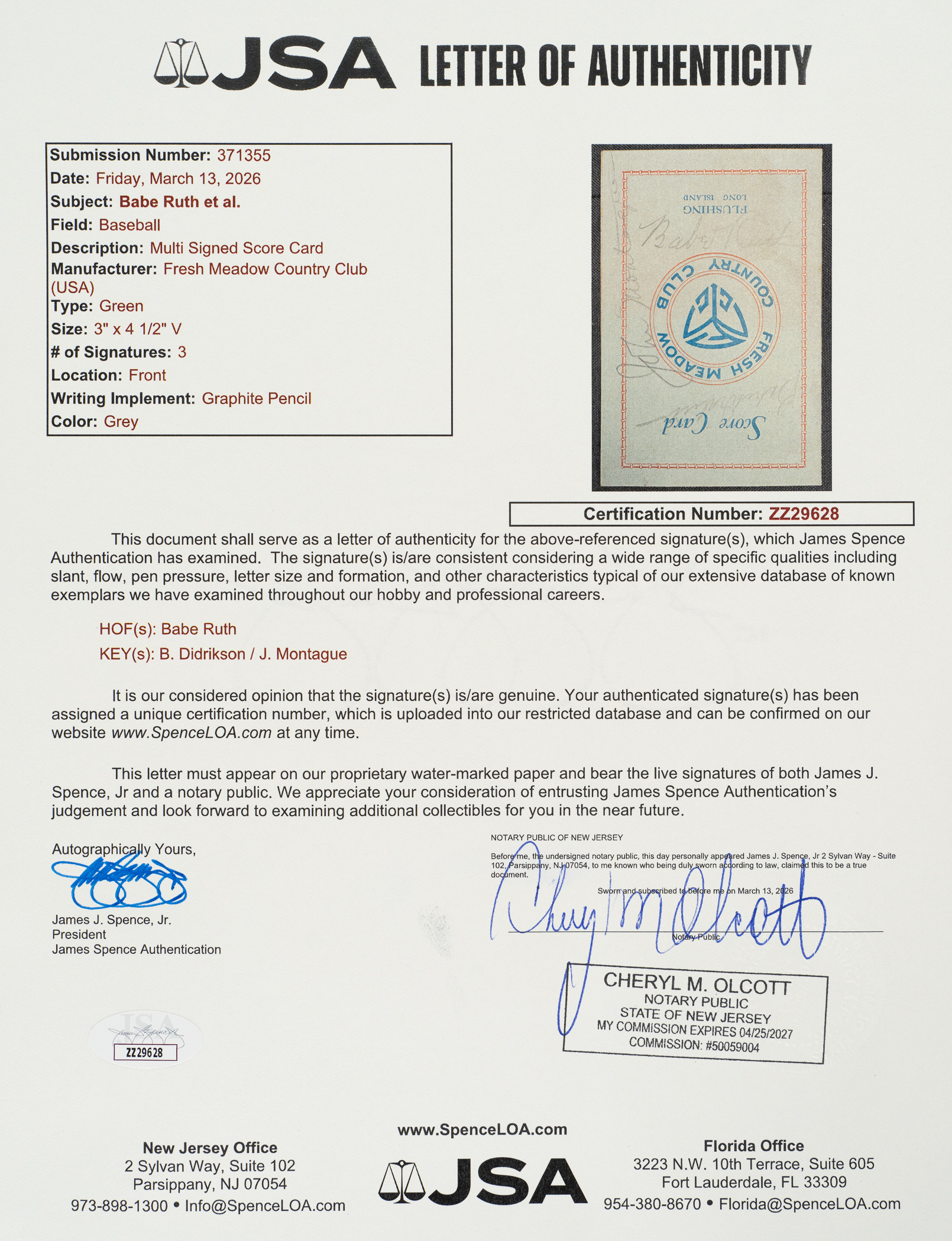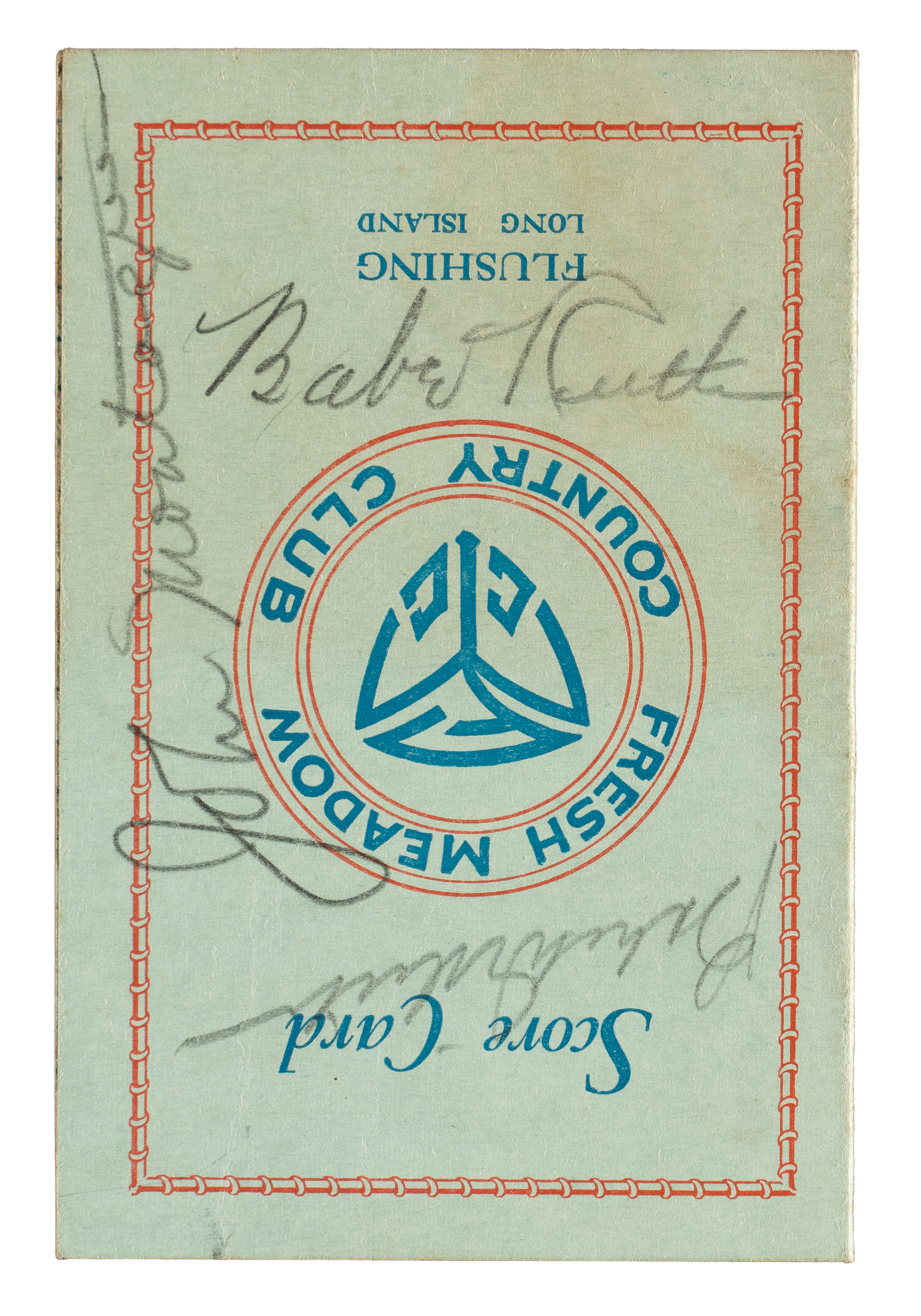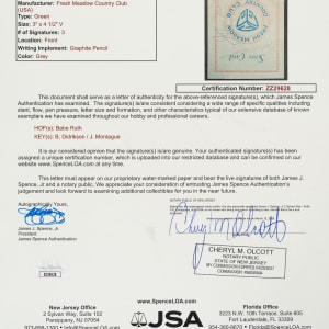 The signatures of the two greatest "Babes" in sports history, Babe Ruth and Babe Didrikson, are featured on the front cover of a golf scorecard from the Fresh Meadow Country Club in Flushing, New York. On November 14, 1937, the two legendary athletes paired up to participate in a golf charity event to be played against American golfers John Montague (birth name LaVerne Moore) and Sylvia Annenberg (one of the top female players of the era). Considered one of the most unusual charity events ever assembled, the spectator turnout was so massive for the event that they actually had to cancel the play of the back nine due to the uncontrollable crowd on the ninth hole, who began taking the balls as souvenirs. The offered scorecard is from this historical event. In addition to Ruth and Didrikson signing their names in pencil on the front cover, John Montague scripted his as well. It is interesting to note that at the time of this event, Montague was wanted in upstate New York for a 7-year old robbery charge. The name "Alex J. Morrison" (a famous golf instructor) is printed in pencil on the back cover of the scorecard. Whoever filled out the scorecard kept strokes for every participant. Whether Ruth was the one keeping strokes or was having the strokes recorded is unclear. Ruth was an avid golfer, especially after his retirement, and this is one of a number of Ruth signed golf score cards we have handled over the years. Babe Didrikson was known as one of the top female athletes in the country. As a young girl, Didrikson excelled at a number of sports, including volleyball, tennis, baseball, basketball, and swimming. It was in her youth that she acquired the nickname, "Babe," after her hero, Babe Ruth, for her hitting prowess on the ball field. Didrikson achieved early fame as a basketball star and, in 1932, made national headlines by winning two gold medals for track and field at the Summer Olympics in Los Angeles. In the mid-1930s, she focused her talents on golf and quickly became the top female player in the country. It was on the golf course, in 1938, that she met professional wrestler George Zaharias, and they married one year later. Today, she is widely regarded as the greatest female athlete in history and in 1950, six years before her death, she was named Woman Athlete of the First Half of the 20th Century by the Associated Press. The fold-over card (3 x 4.5 inches) displays minor creasing and light foxing on the interior. In Very Good condition overall. Full LOA from James Spence/JSA.