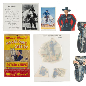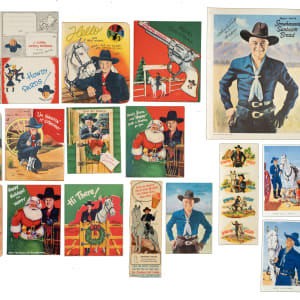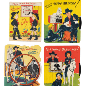 Presented is a collection of thirty-one 1950 "Hopalong Cassidy" birthday and greeting cards. Additionally included are 12 various "Hopalong Cassidy" items (postcards, photos, decals, etc.) including "Hoppy's favorite Stroehmann's Sunbeam Bread" photo and three Valentine & Sons Ltd. (UK) postcards. Condition of birthday and greeting cards is Excellent, with a few slightly lesser. Total: 43 items.