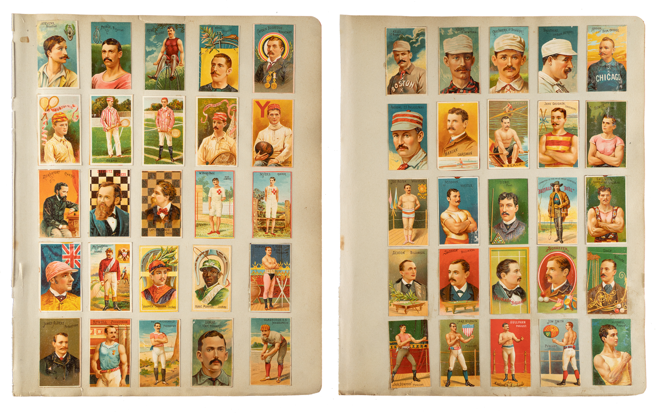 Extraordinary pair of pages featuring images of all 50 cards from the spectacularly colorful N162 Old Judge & Gypsy Queen series. Each of these images was cut out from an 1888 A36 Goodwin & Company premium album and carefully mounted. Baseball players include Anson, Kelly, Keefe, Brouthers, Glasscock, Caruthers, Dunlap, and Andrews. Also included are the additional 42 stars of the sporting world. The N162 Old Judge & Gypsy Queen tobacco cards are universally regarded as among the most beautiful and desirable of all pre-1900 tobacco issues. The cutouts on each page (10.5 x 13 inches) present beautifully with vibrant colors and flawless registration. Total: 2 pages. The size/weight of this item requires that there will be an additional shipping charge for this lot.