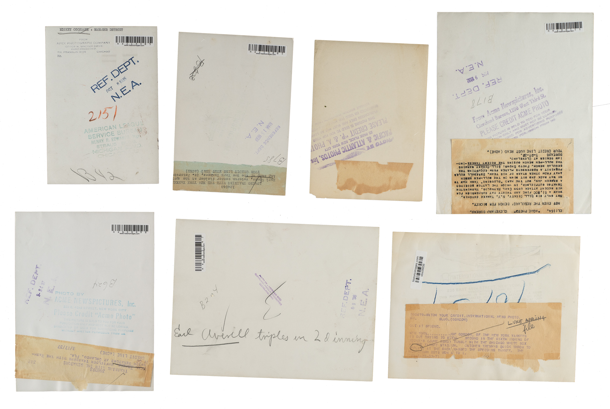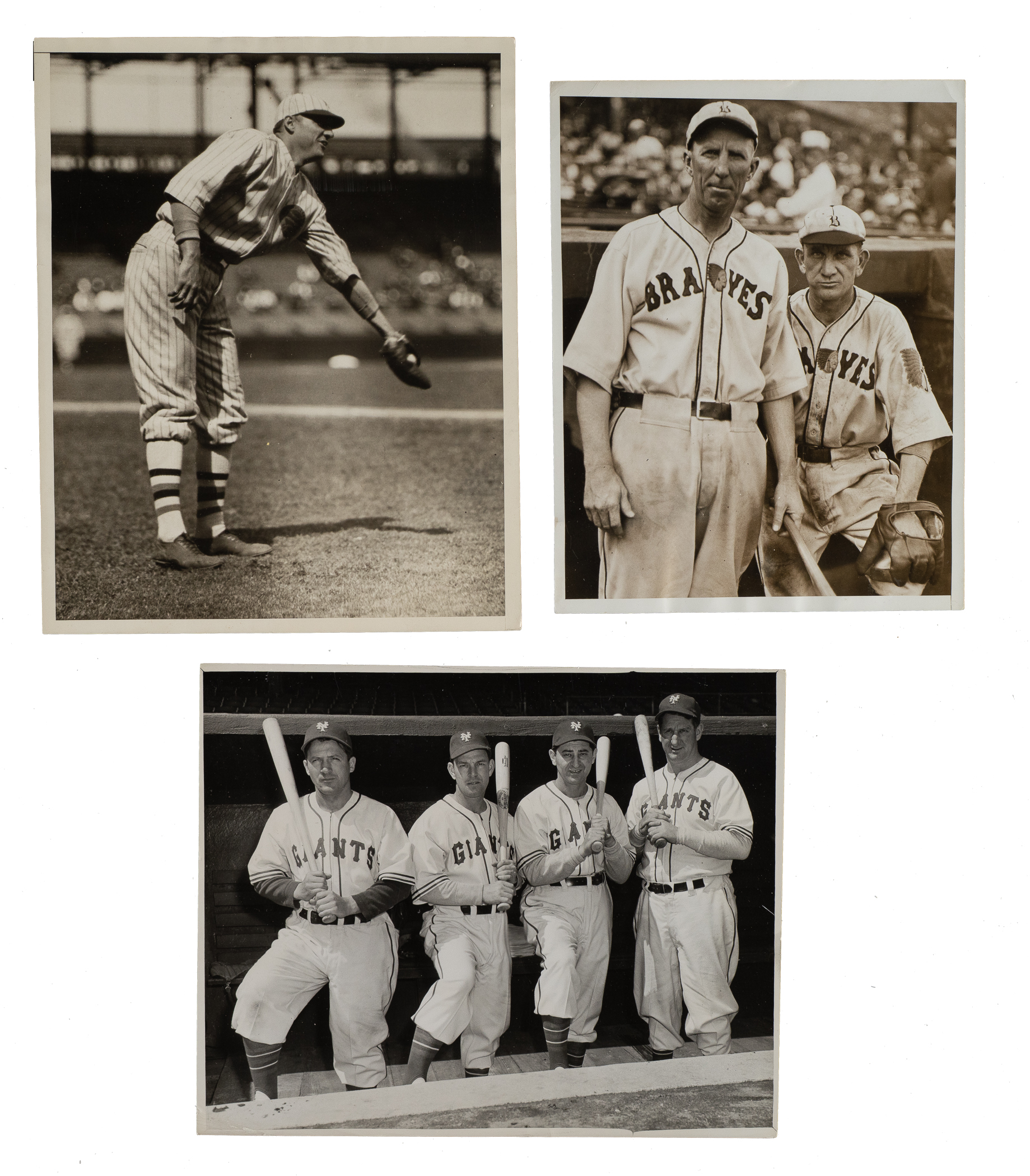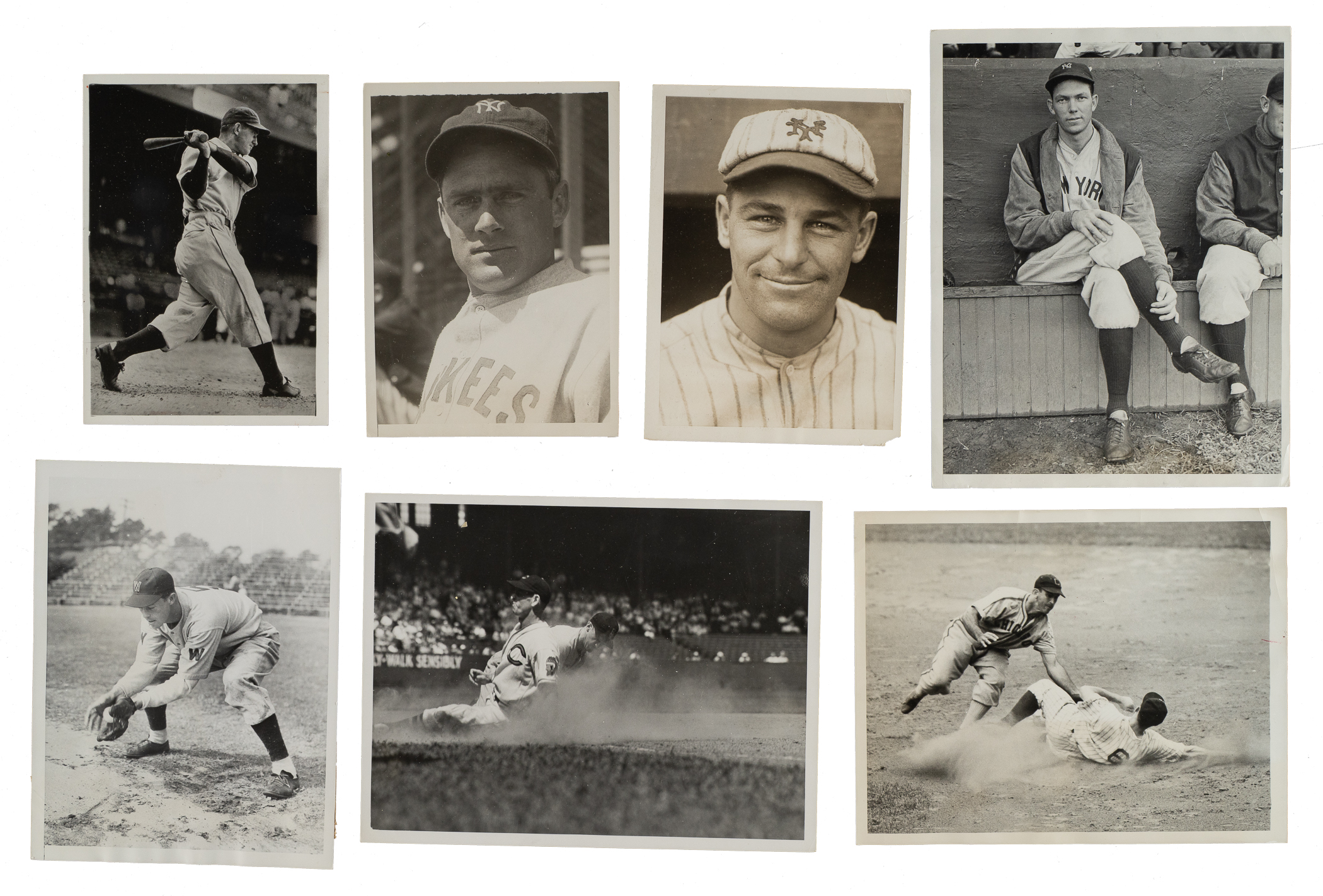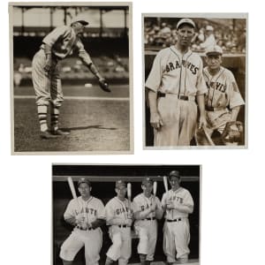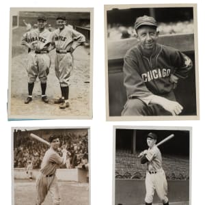 Collection of twenty vintage news photos dating from the 1920s to the 1940s, all but two picturing a member of the Baseball Hall of Fame. Sizes range from 5 x 7 inches to 8 x 10 inches, with fourteen of the photos having a "historicimages.com" sticker affixed to the reverse. Each photo displays a news service credit stamp on the reverse. All the photos display flaws common to news photos, including (but not limited to), edge tears, creases, and editorial markings on the front and/or reverse. In Good to Very Good condition overall. The players represented in this collection, with the number of photos for each player (if more than one) noted in parentheses, are as follows: Appling (action shot tagging Joe Gordon), Averill (sliding photo), Cochrane, E. Collins (wearing a one-year style uniform in 1926), Combs, Dickey (2), Gehringer (4), Gordon (action shot tagging Rudy York), Hornsby and Sisler (pictured together with the Braves in 1928), T. Jackson, G. Kelly, Maranville (pictured together with Hank Gowdy), Mize, C. Travis, New York Giants sluggers (Medwick, Ott, Weintraub, and Lombardi), and one unidentified Giants player. Total: 20 photos. Please note that these photos have not been reviewed for type designations so no guarantees as to exact type classification can be made.