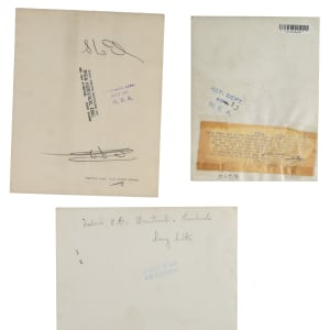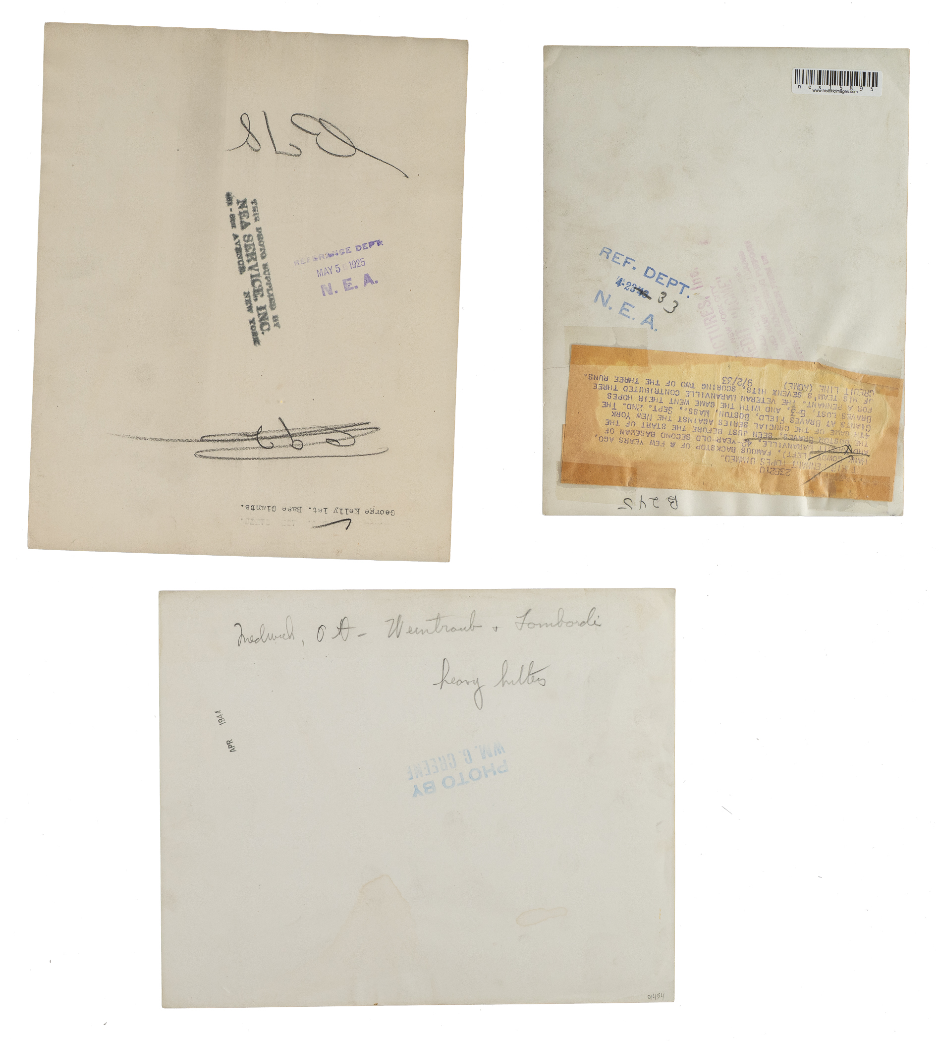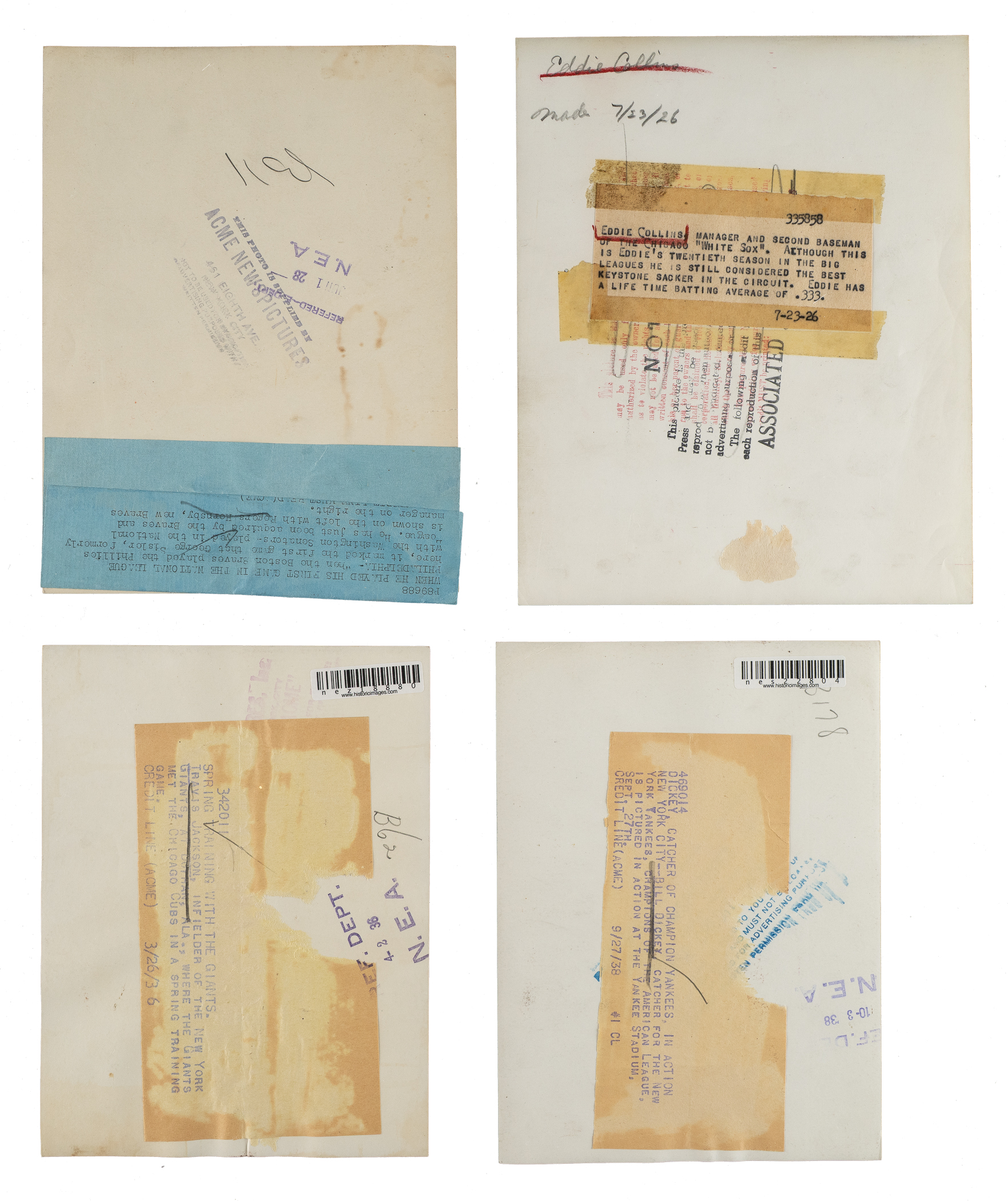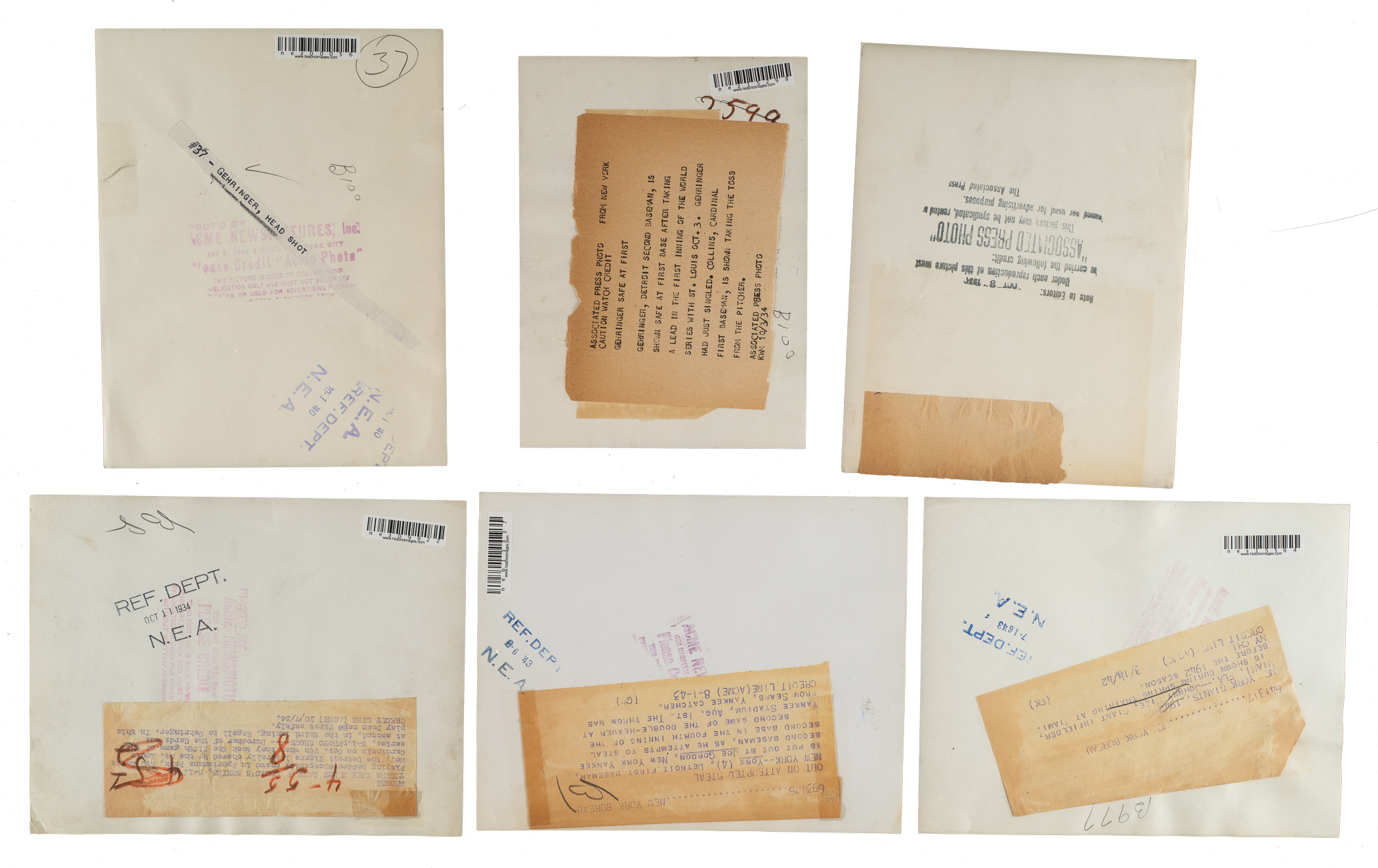 Collection of twenty vintage news photos dating from the 1920s to the 1940s, all but two picturing a member of the Baseball Hall of Fame. Sizes range from 5 x 7 inches to 8 x 10 inches, with fourteen of the photos having a "historicimages.com" sticker affixed to the reverse. Each photo displays a news service credit stamp on the reverse. All the photos display flaws common to news photos, including (but not limited to), edge tears, creases, and editorial markings on the front and/or reverse. In Good to Very Good condition overall. The players represented in this collection, with the number of photos for each player (if more than one) noted in parentheses, are as follows: Appling (action shot tagging Joe Gordon), Averill (sliding photo), Cochrane, E. Collins (wearing a one-year style uniform in 1926), Combs, Dickey (2), Gehringer (4), Gordon (action shot tagging Rudy York), Hornsby and Sisler (pictured together with the Braves in 1928), T. Jackson, G. Kelly, Maranville (pictured together with Hank Gowdy), Mize, C. Travis, New York Giants sluggers (Medwick, Ott, Weintraub, and Lombardi), and one unidentified Giants player. Total: 20 photos. Please note that these photos have not been reviewed for type designations so no guarantees as to exact type classification can be made.
