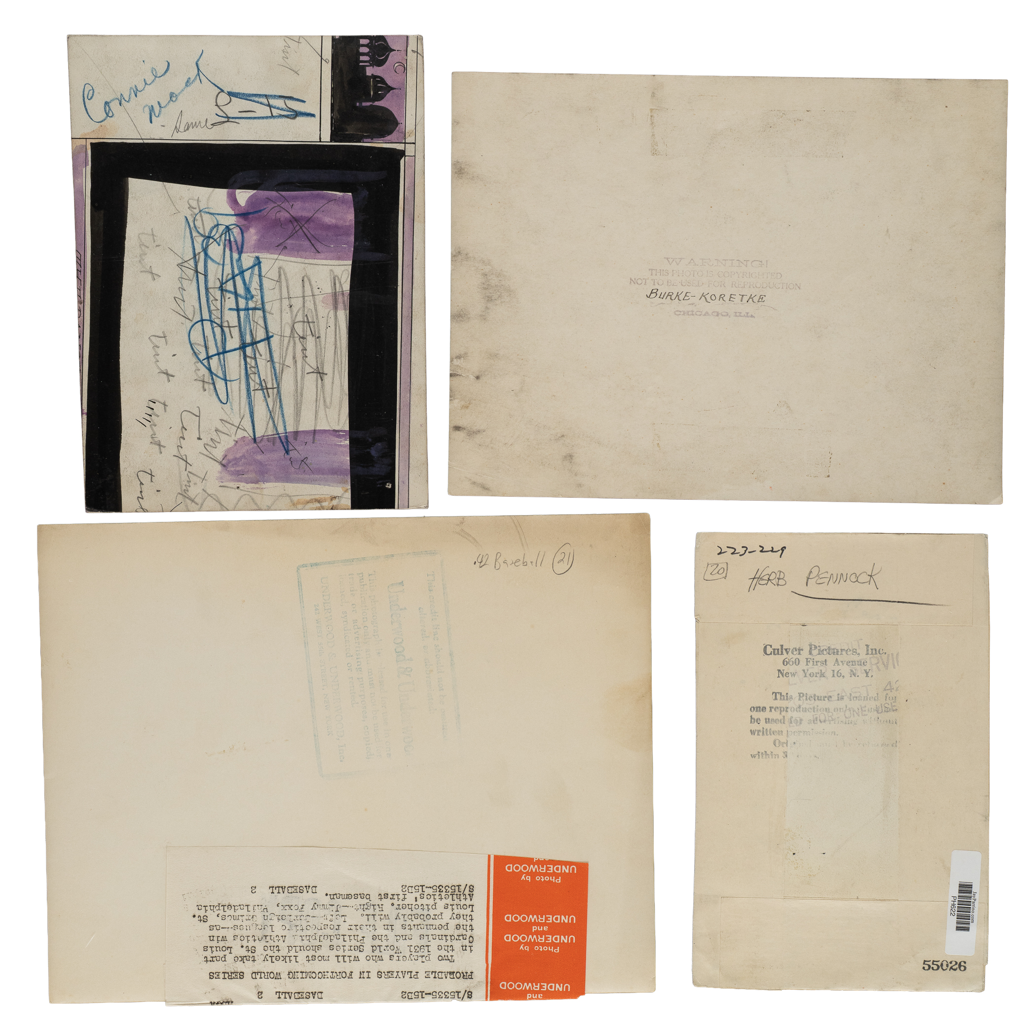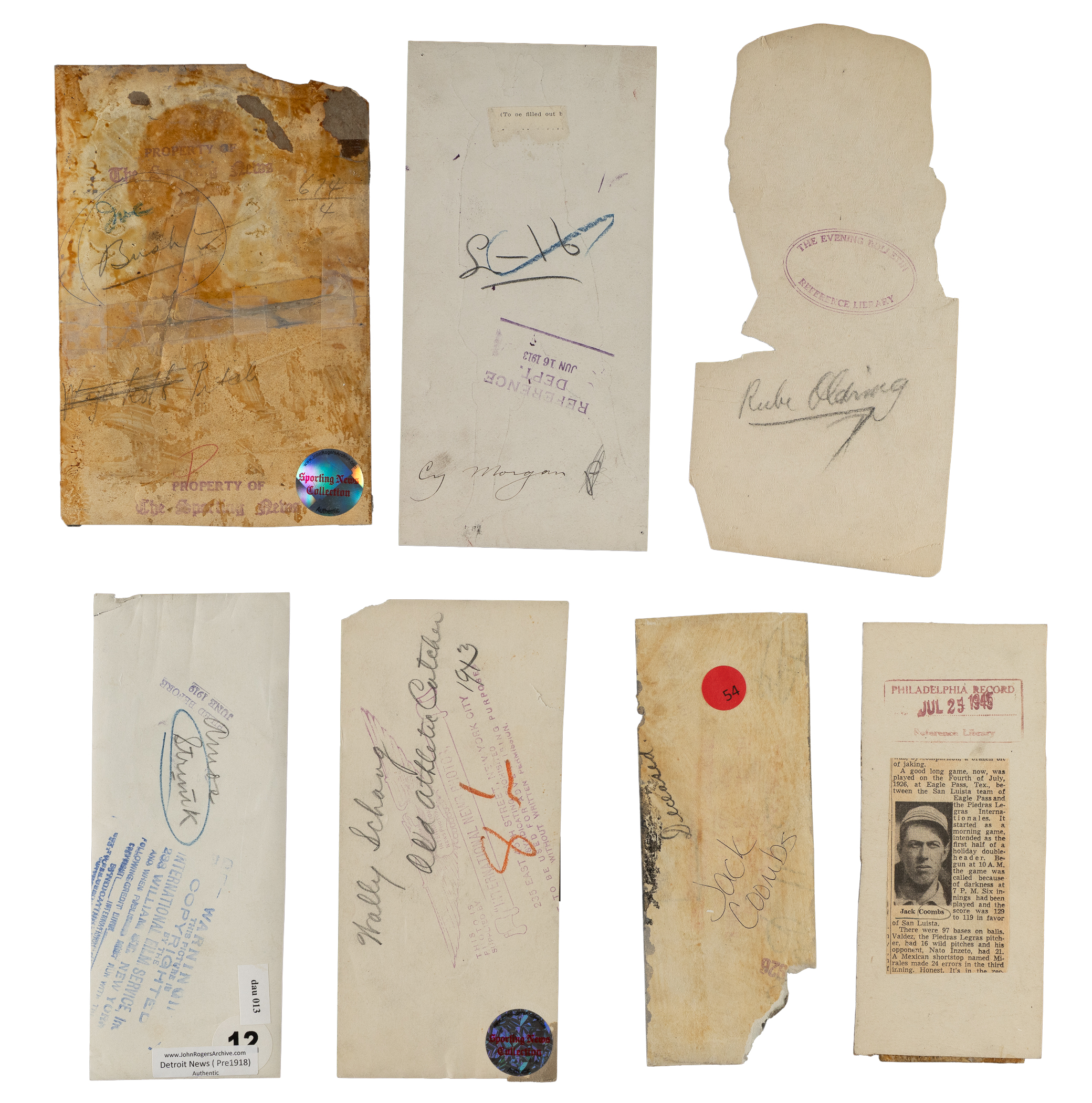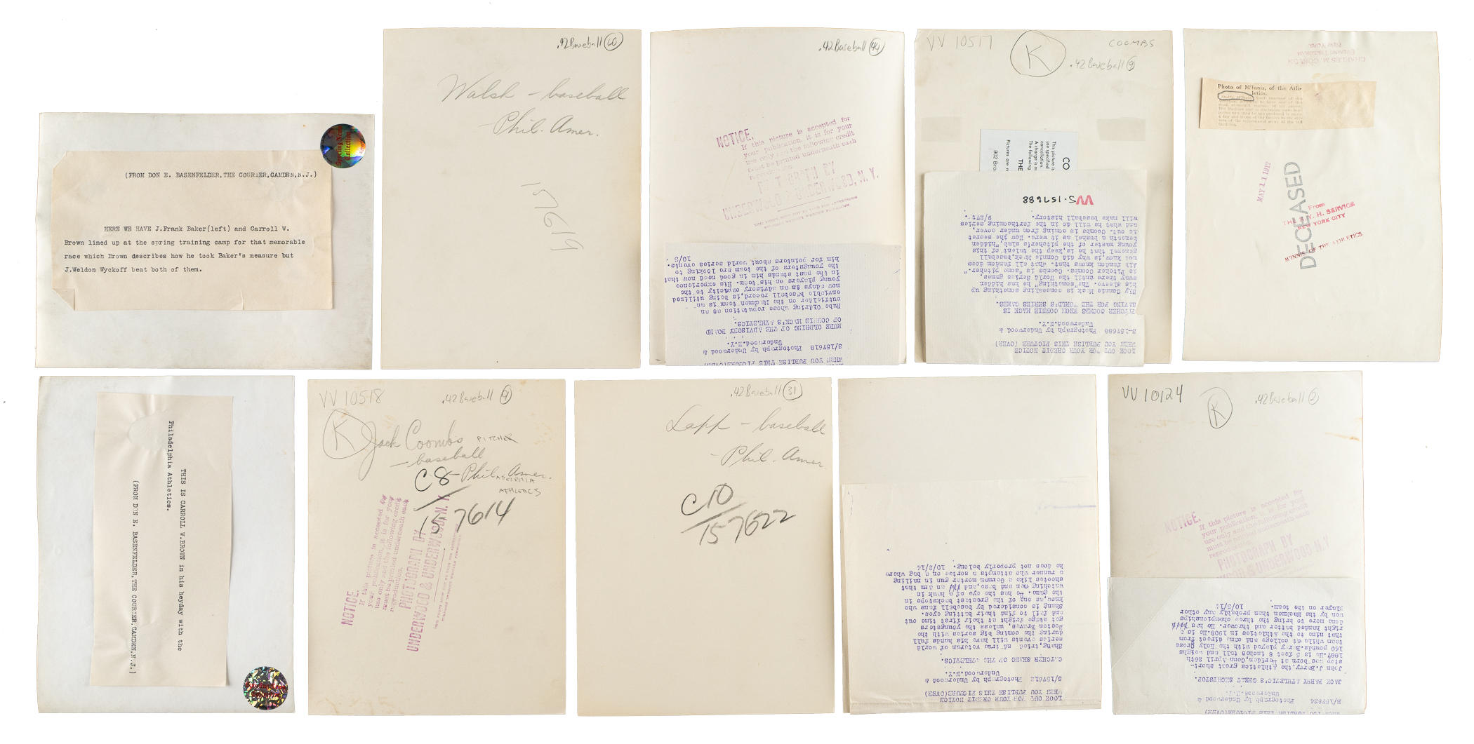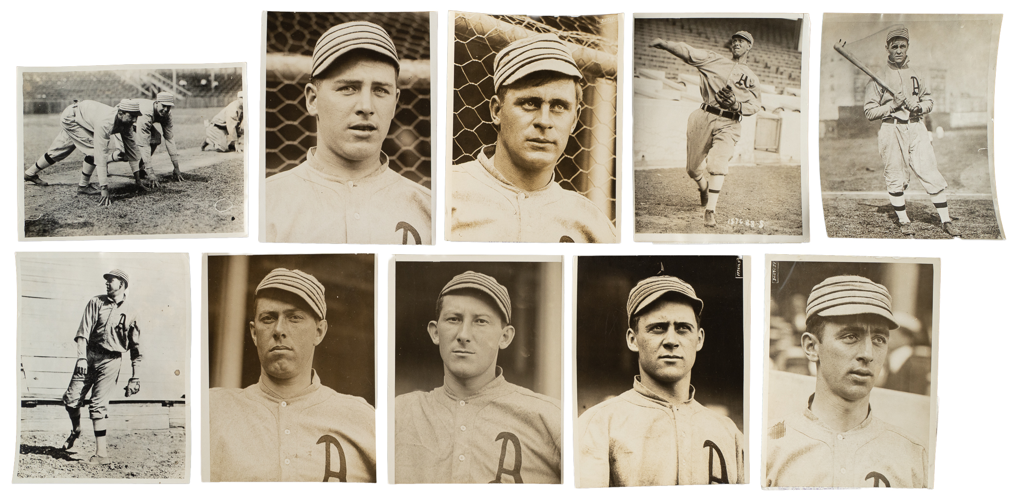 Collection of 34 vintage news photos dating from the 1910s to the 1940s, each capturing one or more members of the Philadelphia Athletics. Sizes range from 3 x 7 inches to 8 x 10 inches, with 12 of the photos having been noticeably trimmed. The vast majority display news service credit stamps on the reverse. One of the photos (McInnis) displays a Charles Conlon credit stamp on the reverse. All the photos display flaws common to news photos, including (but not limited to) edge tears, pinholes, creases, and editorial markings/shadings on the front and/or reverse. Condition ranges from Poor to Good, averaging Fair overall (with a few better). The players represented in this collection, with the number of photos for each player (if more than one) noted in parentheses, are as follows: Baker and C. Brown (Sporting News Collection sticker affixed to reverse), Barry (2), C. Brown (Sporting News Collection sticker affixed to reverse), Bush (2, one with Sporting News Collection sticker affixed to reverse), E. Collins (2), Coombs (6, one with Sporting News Collection sticker affixed to reverse), Lapp, Mack (affixed to thicker backing), McInnis, Morgan, Murphy, Oldring (2), Pennock, Plank (copy of original photo with Sporting News Collection sticker affixed to the reverse), Schang (2, one with Sporting News Collection sticker affixed to reverse), Strunk (2, one with Sporting News Collection sticker affixed to reverse), J. Walsh, Baker with McInnis/Murphy/Baker, 1910 Athletics team image ("Burke & Koretke" credit stamps appear on front and back), 1914 Athletics team image, and two 1931 World Series publicity photos (one with Foxx and Grimes, while the second pictures Bishop and Hafey). Total: 34 photos. Please note that these photos have not been reviewed for type designations so no guarantees as to exact type classification can be made.