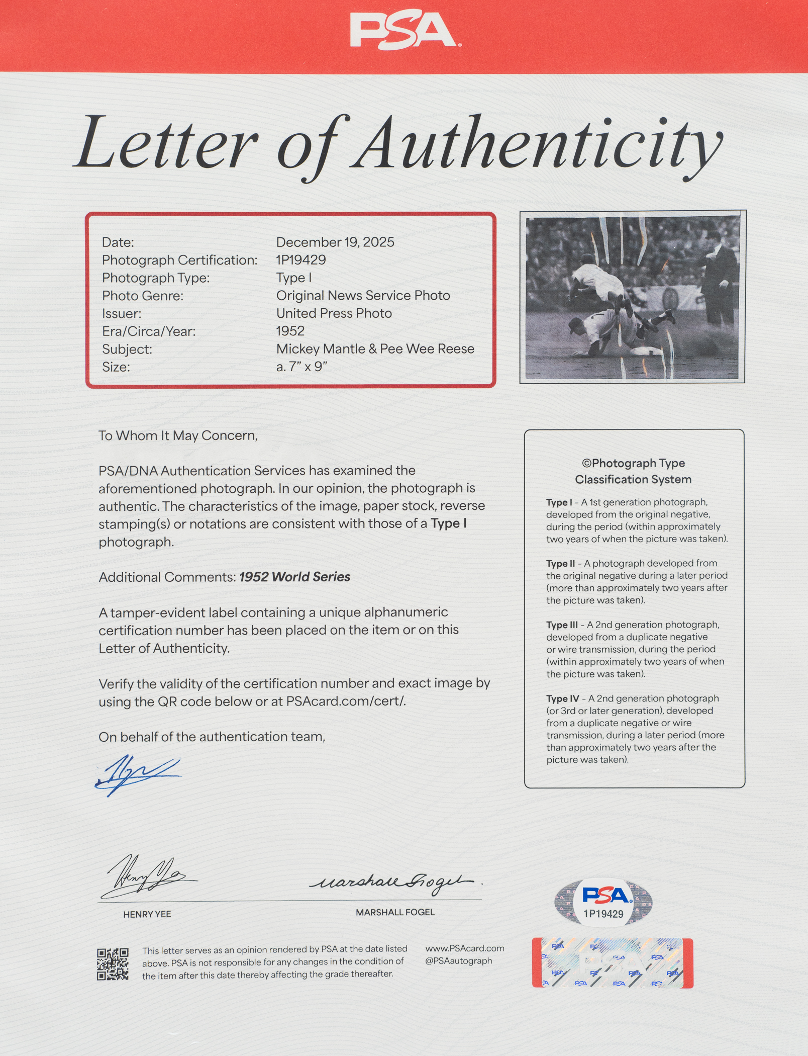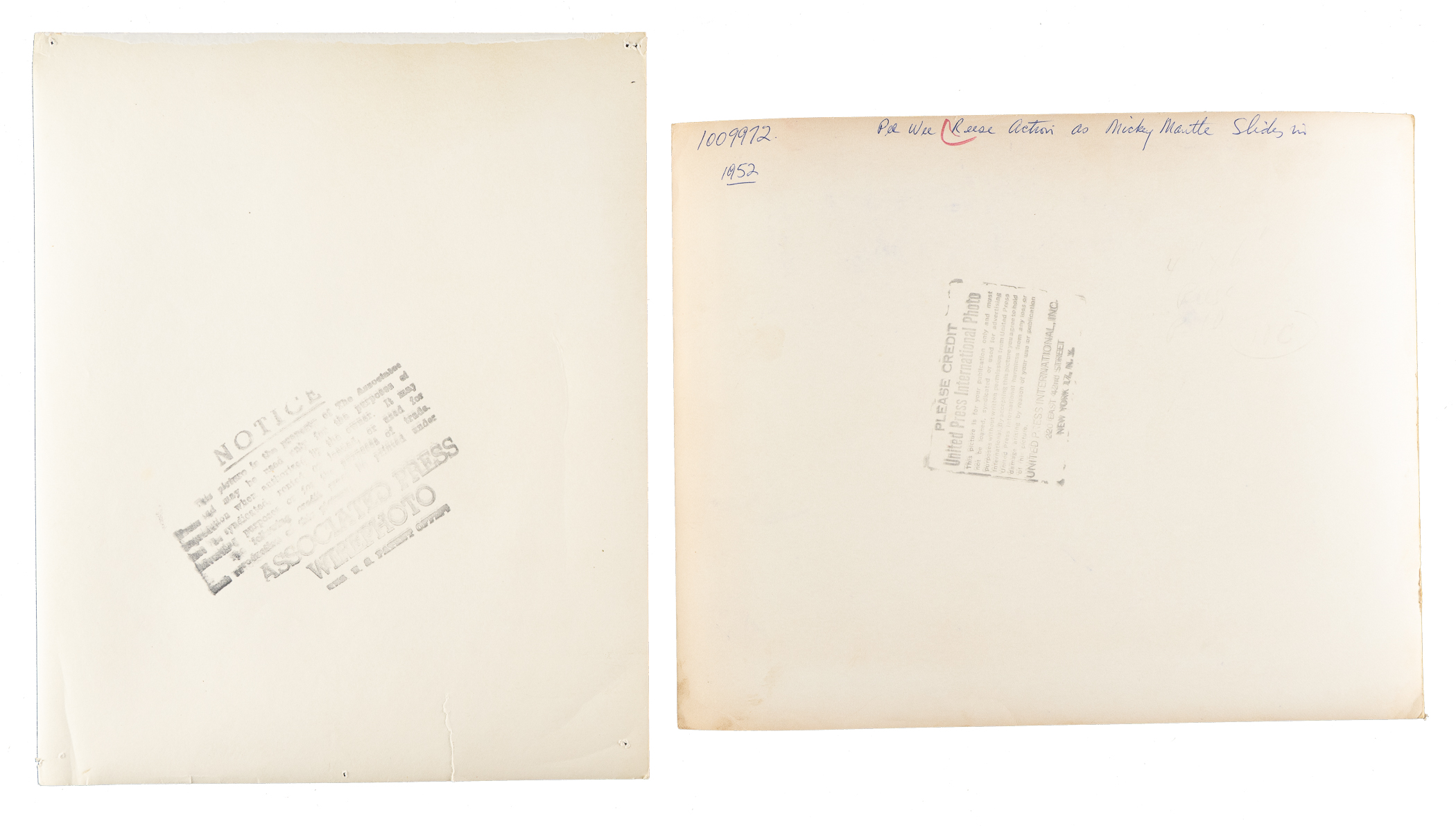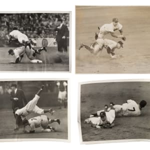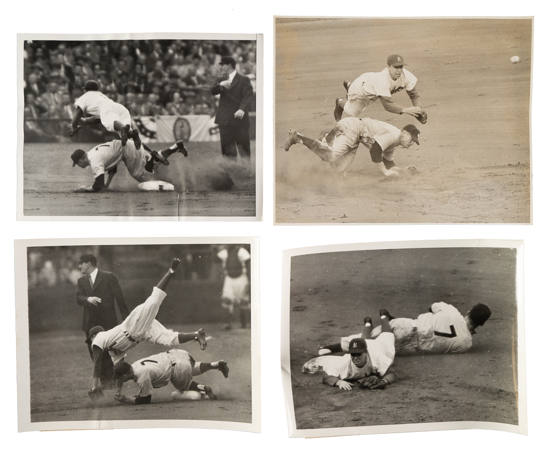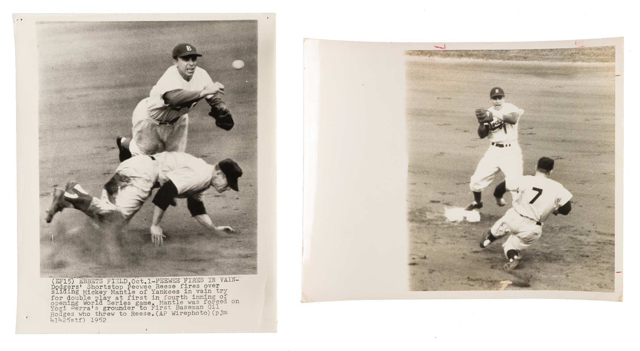 Collection of six vintage photos, each capturing a different moment as Mickey Mantle slides into second base against the Brooklyn Dodgers during the fourth inning of Game 1 of the 1936 World Series. Dodgers shortstop Pee Wee Reese is seen applying the tag in one photo, while the others show him getting taken out by Mantle and the immediate aftermath. The photos, which range in size from 7 x 9 inches to 10 x 8 inches, all bear one or multiple of the following on the reverse: photo service credit stamp(s), and/or editorial markings. The condition of the photos ranges from Fair to Very Good. Please note that one photo is accompanied by a full LOA from PSA/DNA, which has deemed it to be an original Type I example. Total: 6 photos.