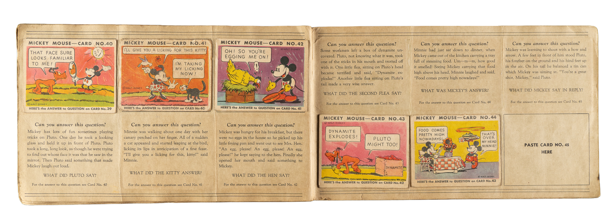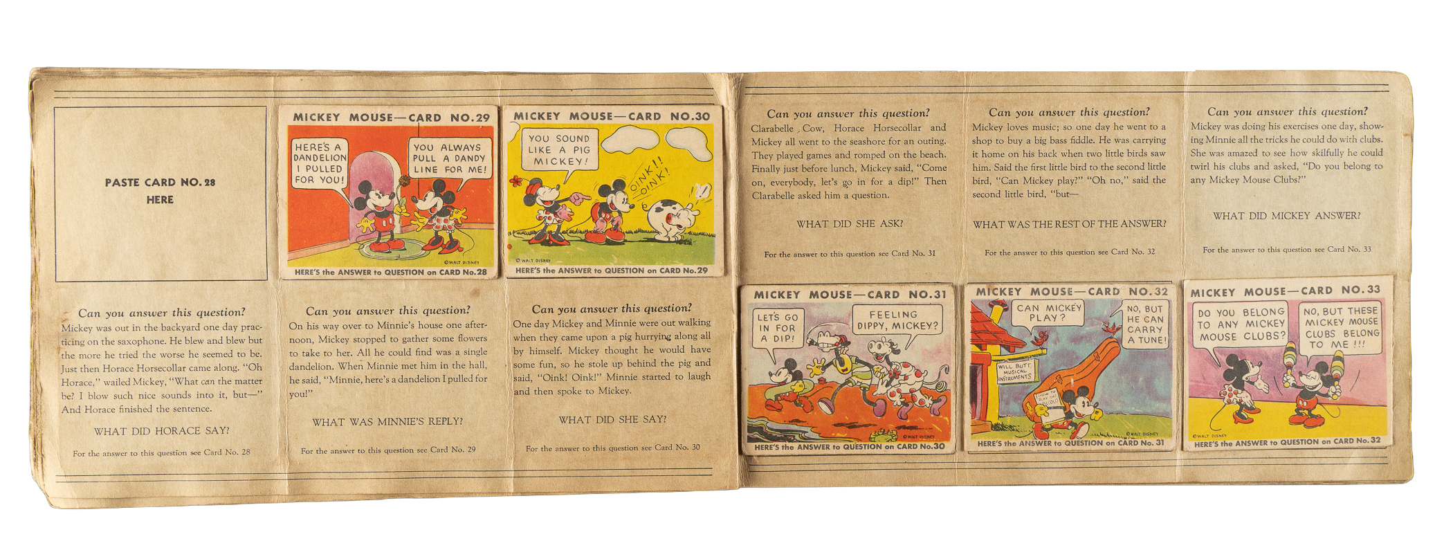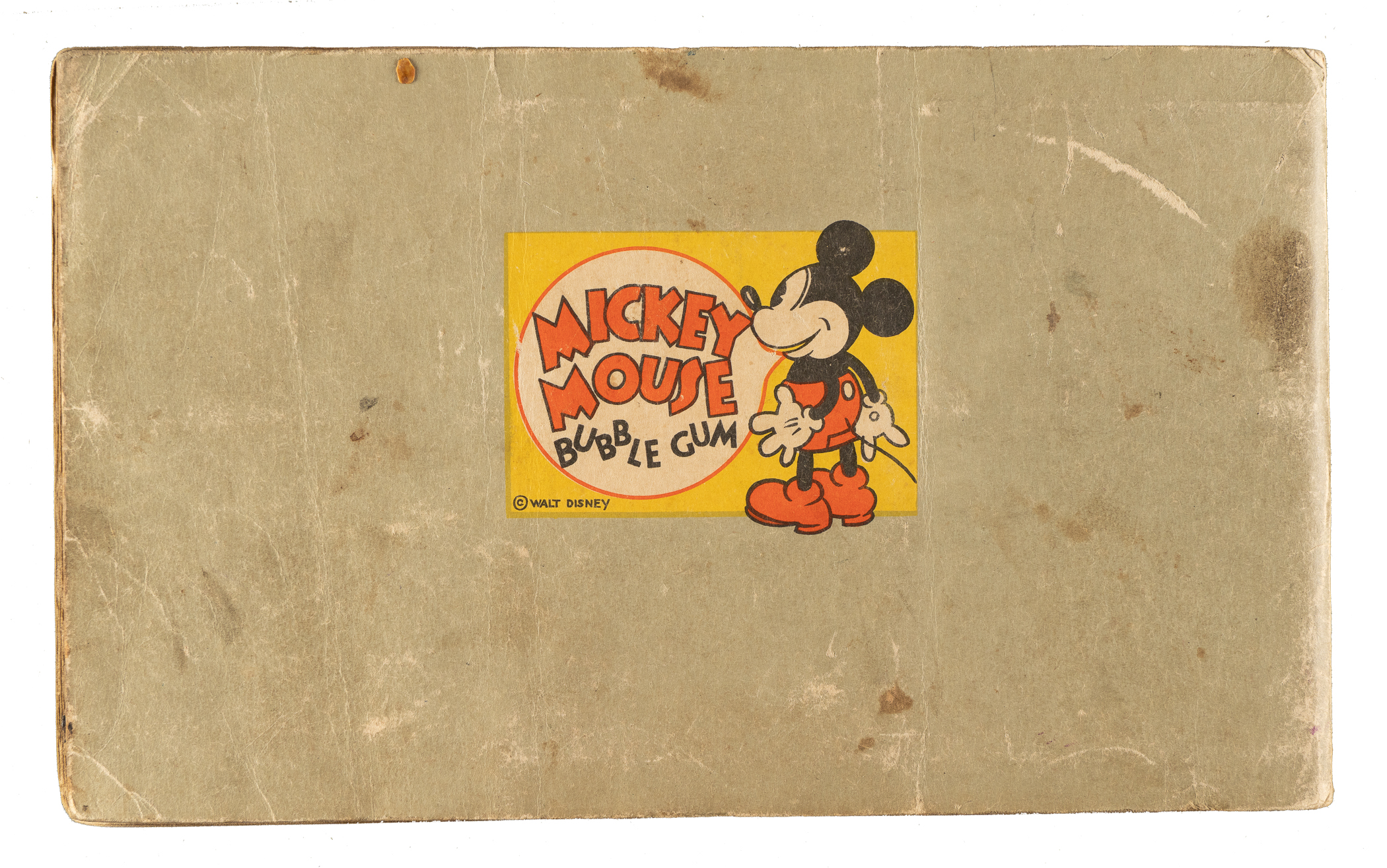 Collection of thirty-three different 1935 R89 "Mickey Mouse" Bubble Gum cards issued by Gum, Inc. Each card is housed in the original album (affixed with glue) and presents as Gd to Vg-Ex, including four Pr. The collection consists of the following: #3, 4, 8, 10, 11, 12, 13, 14, 16, 18, 19, 21 "He's Sure a Handy..."w/ Walt Disney (Vg-Ex appearance from the front), 23, 26, 27, 29, 30, 31, 32, 33, 34, 35, 36, 37, 38, 40, 41, 42, 43, 44, 46, 47, and 48. The original "Vol. 1" album (earlier Type 1 variation) in which the cards are mounted is in Poor condition because of heavy creasing, surface wear, and writing on the front cover. Mickey Mouse Bubble Gum cards are an iconic 1930s nonsport bubble-gum card set. The brilliant colors, high-quality artwork, and popular subject matter make this set a favorite with collectors. It is worth noting that cards from this set are much scarcer than most collectors realize and far more difficult to find than most baseball cards of the era. This is a relatively affordable yet still attractive group of one of the most popular of all 1930s gum-card sets with tremendous crossover appeal to both card collectors and Mickey Mouse collectors. Total: 33 cards mounted in original album.