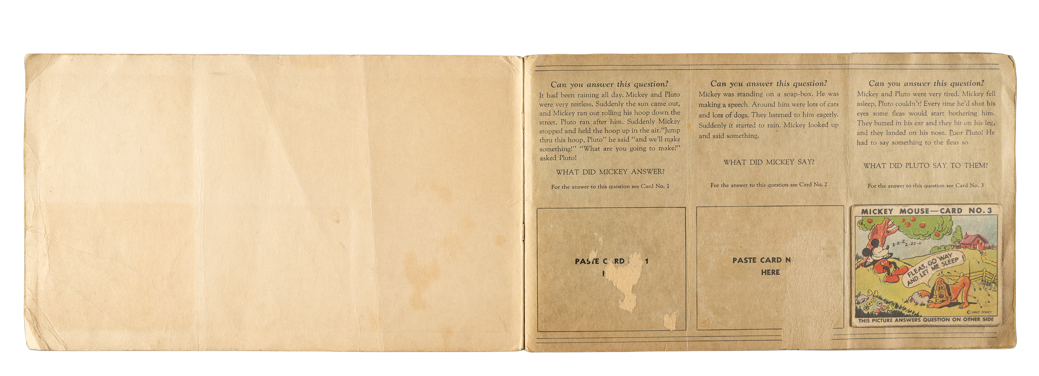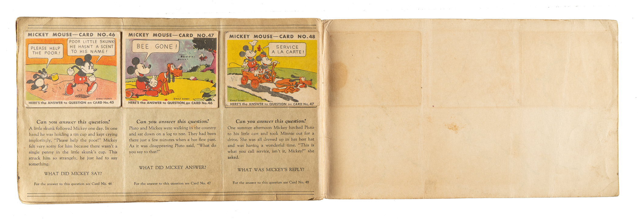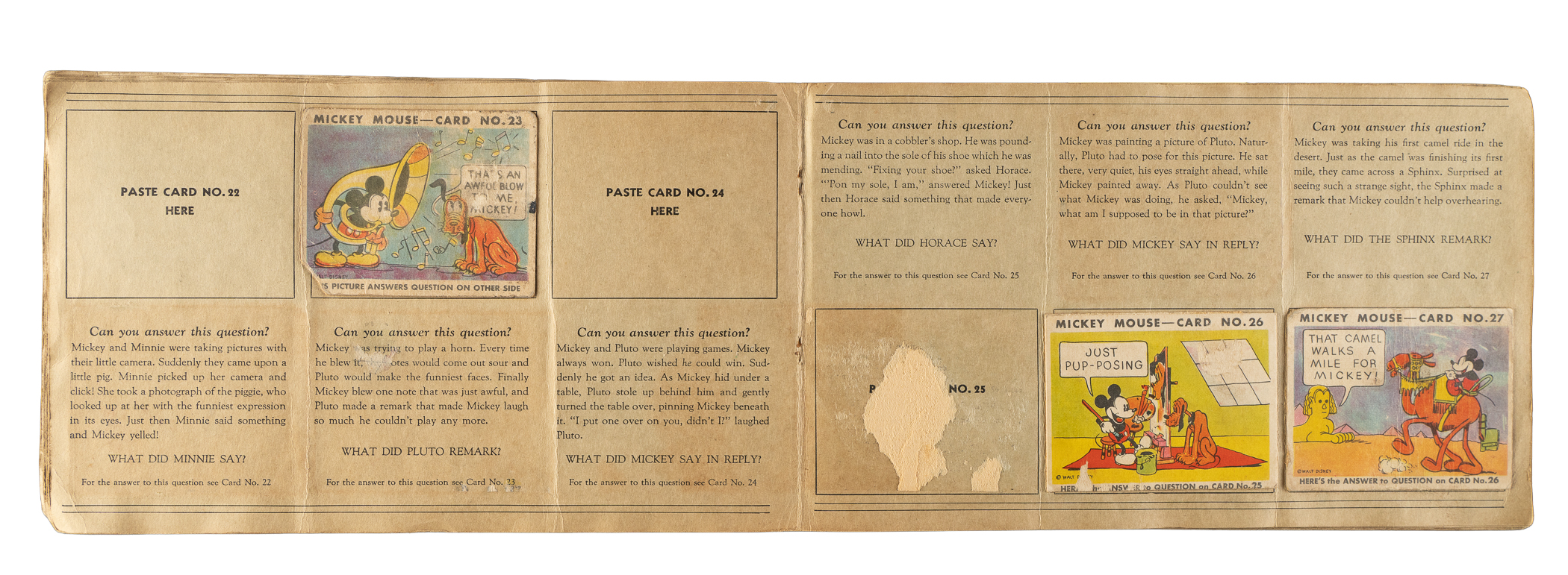 Collection of thirty-three different 1935 R89 "Mickey Mouse" Bubble Gum cards issued by Gum, Inc. Each card is housed in the original album (affixed with glue) and presents as Gd to Vg-Ex, including four Pr. The collection consists of the following: #3, 4, 8, 10, 11, 12, 13, 14, 16, 18, 19, 21 "He's Sure a Handy..."w/ Walt Disney (Vg-Ex appearance from the front), 23, 26, 27, 29, 30, 31, 32, 33, 34, 35, 36, 37, 38, 40, 41, 42, 43, 44, 46, 47, and 48. The original "Vol. 1" album (earlier Type 1 variation) in which the cards are mounted is in Poor condition because of heavy creasing, surface wear, and writing on the front cover. Mickey Mouse Bubble Gum cards are an iconic 1930s nonsport bubble-gum card set. The brilliant colors, high-quality artwork, and popular subject matter make this set a favorite with collectors. It is worth noting that cards from this set are much scarcer than most collectors realize and far more difficult to find than most baseball cards of the era. This is a relatively affordable yet still attractive group of one of the most popular of all 1930s gum-card sets with tremendous crossover appeal to both card collectors and Mickey Mouse collectors. Total: 33 cards mounted in original album.