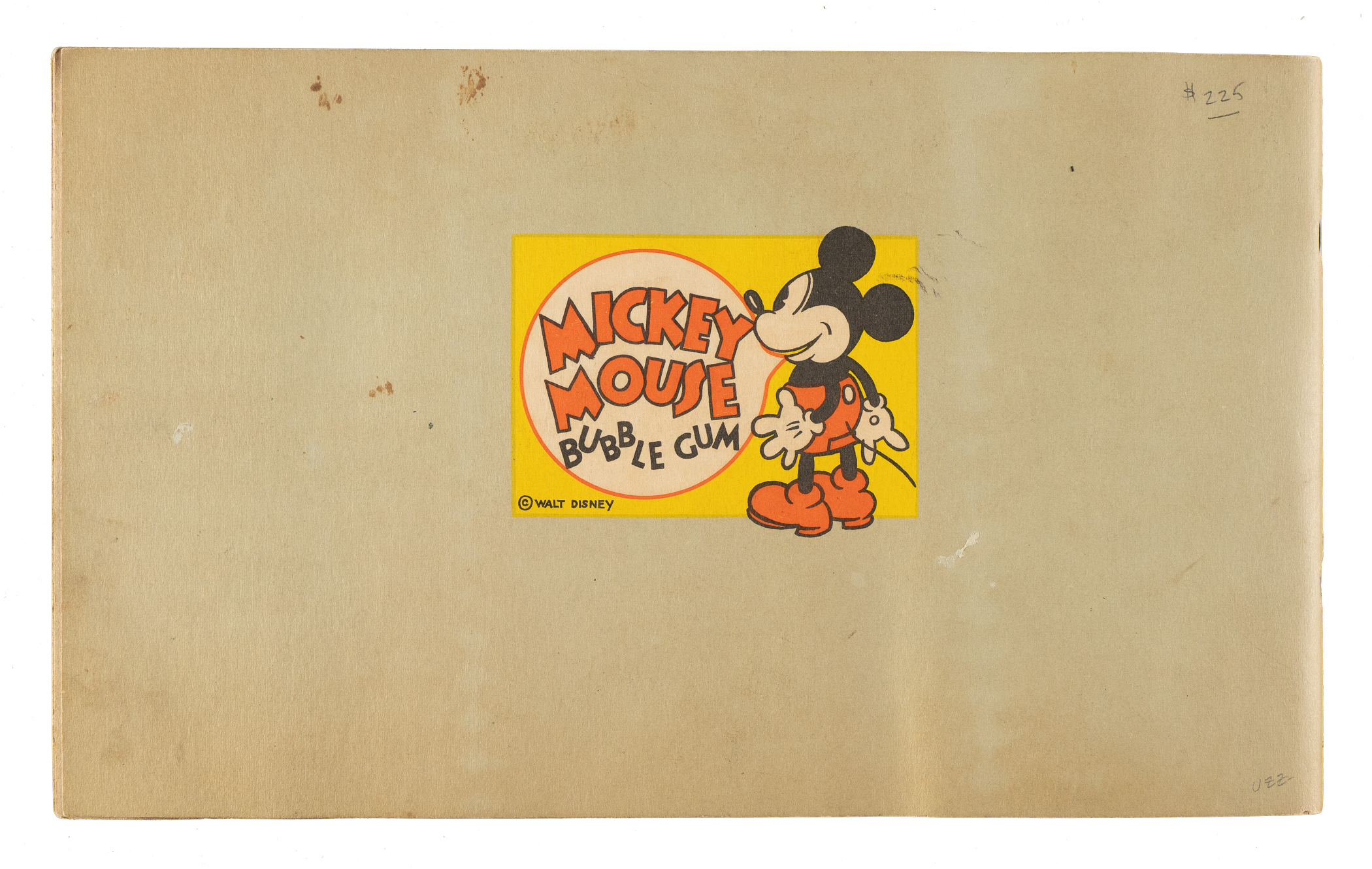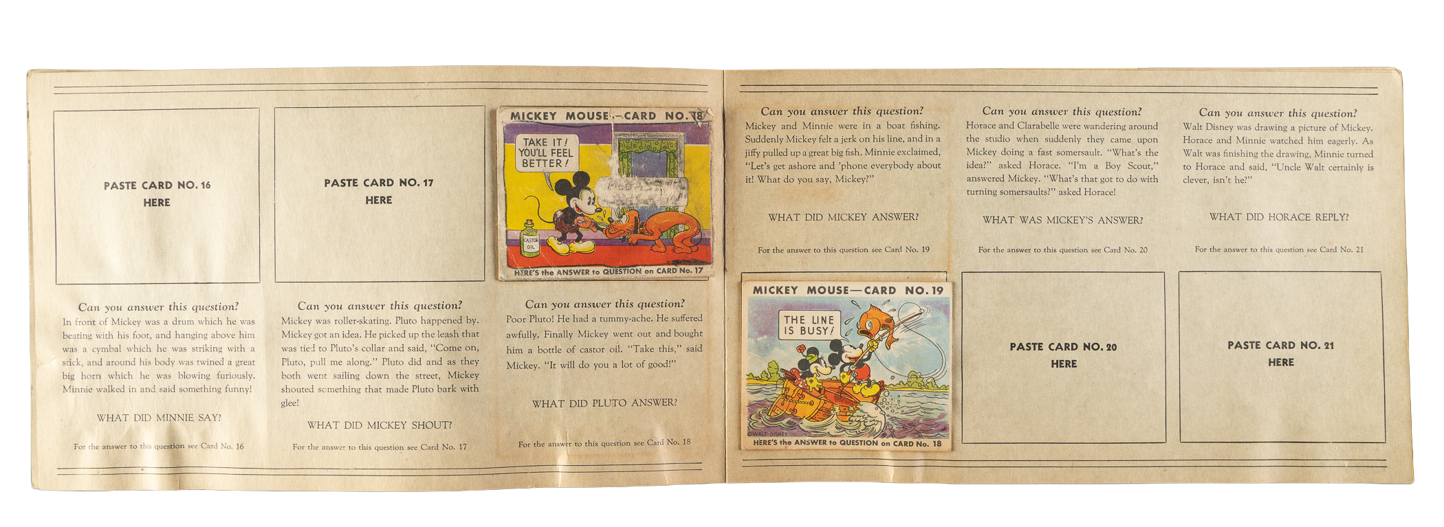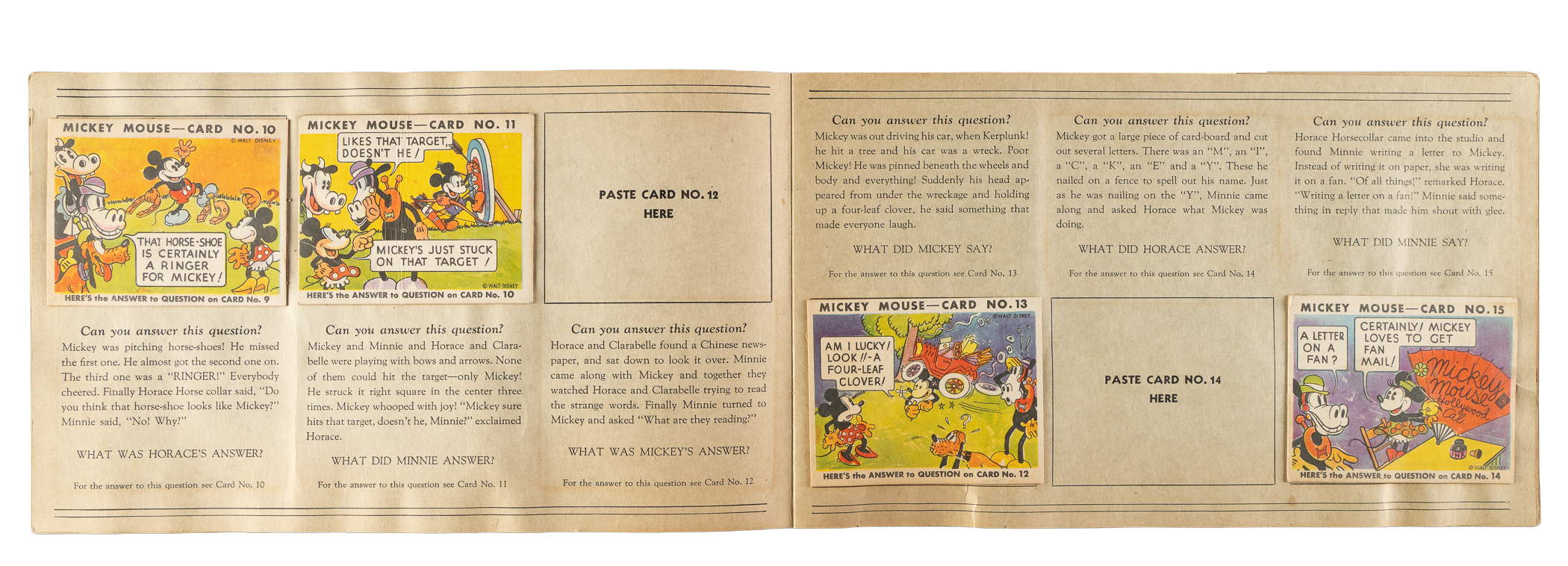 Collection of eleven different 1935 R89 "Mickey Mouse" Bubble Gum cards issued by Gum, Inc. Each card is housed in the original album (affixed with glue) and presents as Vg to Vg-Ex, including one Pr. This collection consists of the following: #2, 3, 5, 8, 10, 11, 13, 15, 18, 19, and 43. The original "Vol. 1" album in which the cards are mounted is in Good condition. There is pencil writing on the back cover, light creases, and scattered spots of discoloration. Mickey Mouse Bubble Gum cards are an iconic 1930s nonsport bubble-gum card set. The brilliant colors, high-quality artwork, and popular subject matter make this set a favorite with collectors. It is worth noting that cards from this set are much scarcer than most collectors realize and far more difficult to find than most baseball cards of the era. This is a relatively affordable yet still attractive group of one of the most popular of all 1930s gum-card sets with tremendous crossover appeal to both card collectors and Mickey Mouse collectors. Total: 11 cards mounted in original album.