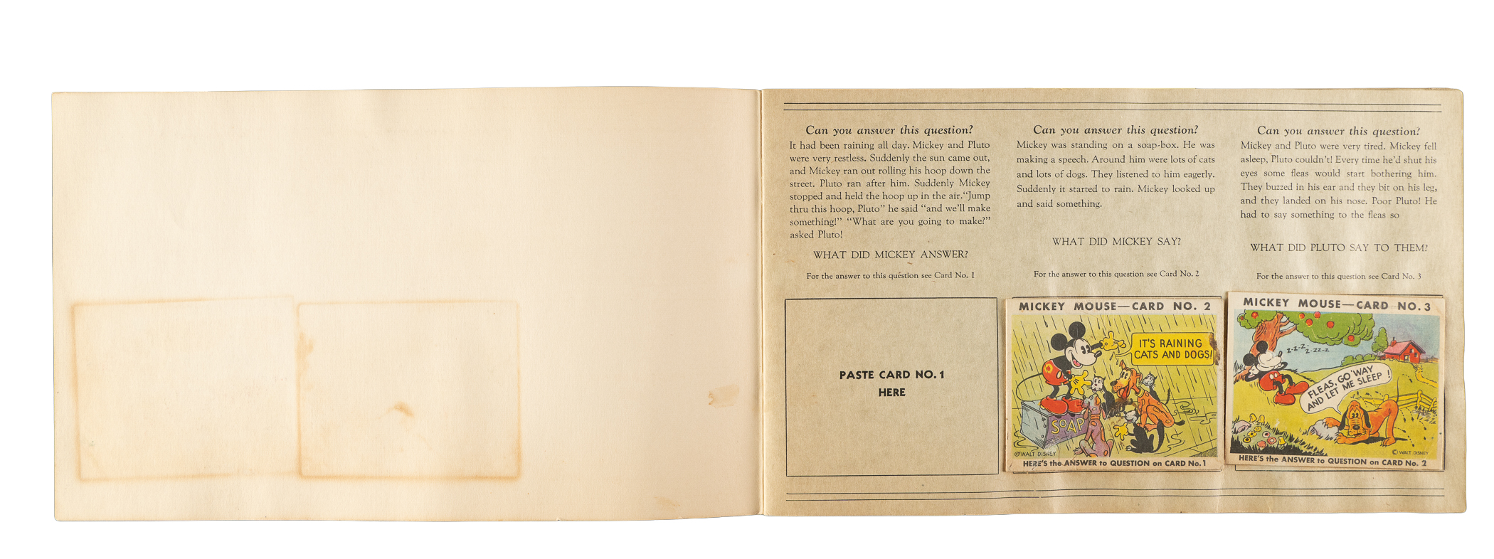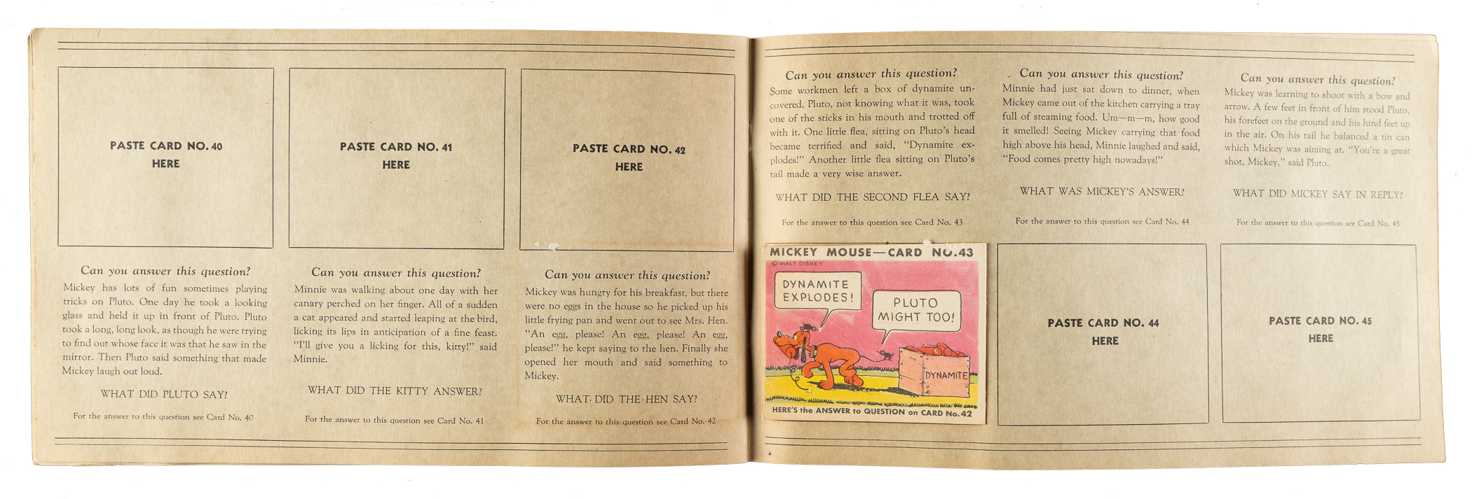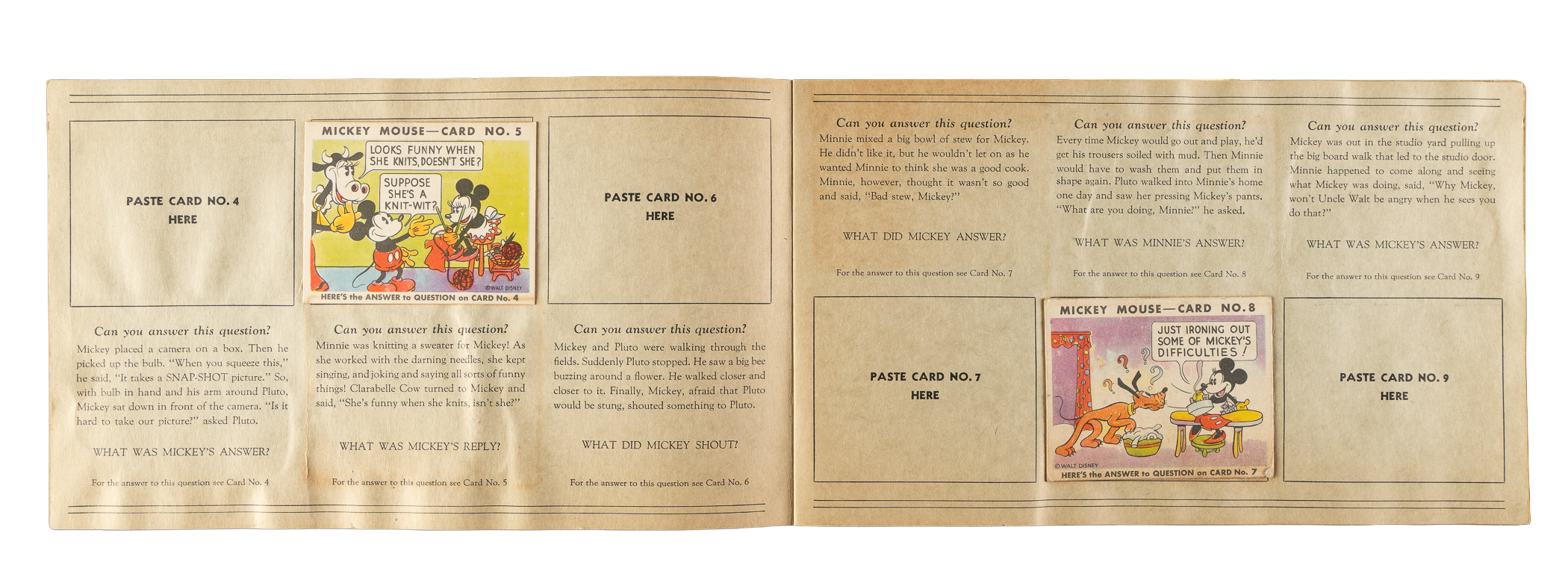 Collection of eleven different 1935 R89 "Mickey Mouse" Bubble Gum cards issued by Gum, Inc. Each card is housed in the original album (affixed with glue) and presents as Vg to Vg-Ex, including one Pr. This collection consists of the following: #2, 3, 5, 8, 10, 11, 13, 15, 18, 19, and 43. The original "Vol. 1" album in which the cards are mounted is in Good condition. There is pencil writing on the back cover, light creases, and scattered spots of discoloration. Mickey Mouse Bubble Gum cards are an iconic 1930s nonsport bubble-gum card set. The brilliant colors, high-quality artwork, and popular subject matter make this set a favorite with collectors. It is worth noting that cards from this set are much scarcer than most collectors realize and far more difficult to find than most baseball cards of the era. This is a relatively affordable yet still attractive group of one of the most popular of all 1930s gum-card sets with tremendous crossover appeal to both card collectors and Mickey Mouse collectors. Total: 11 cards mounted in original album.