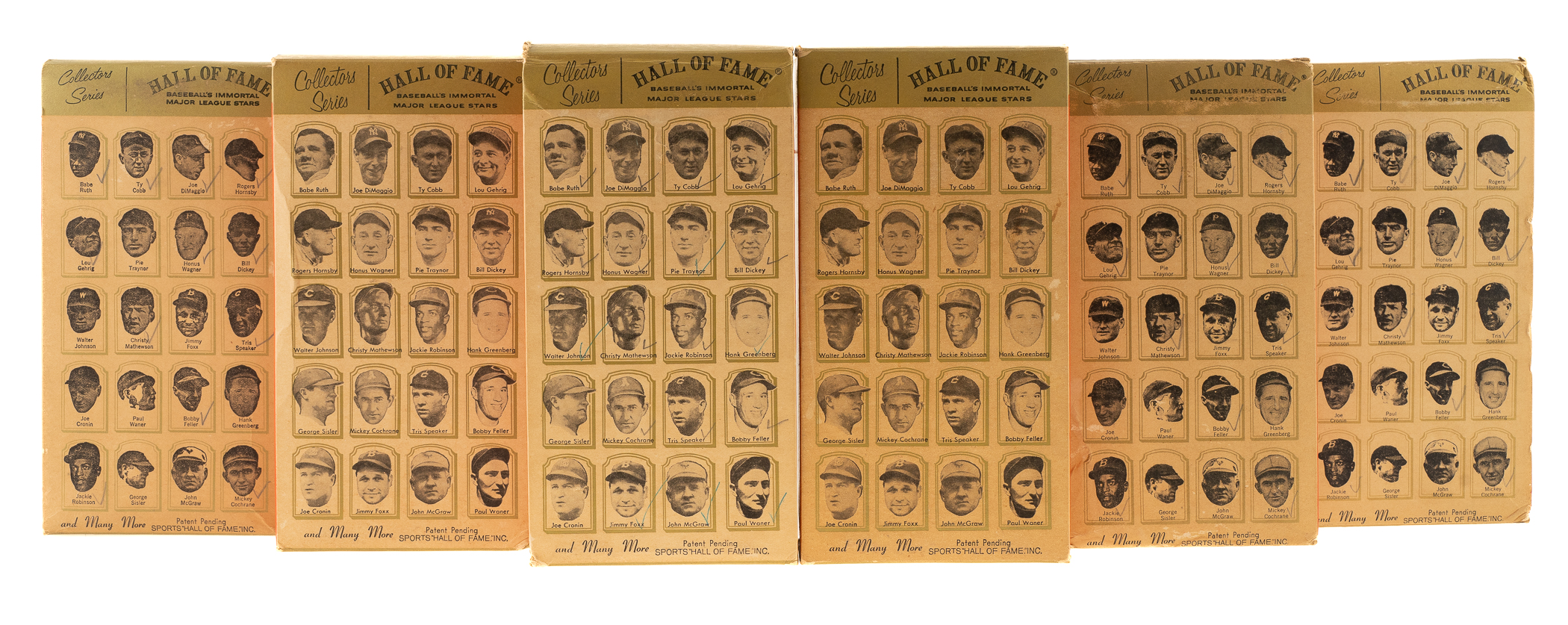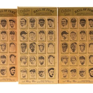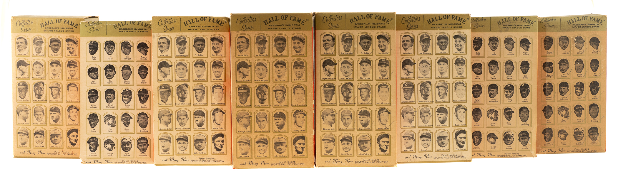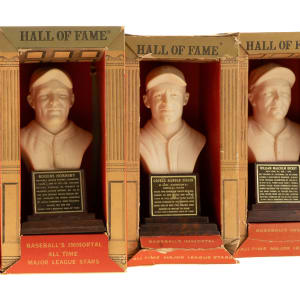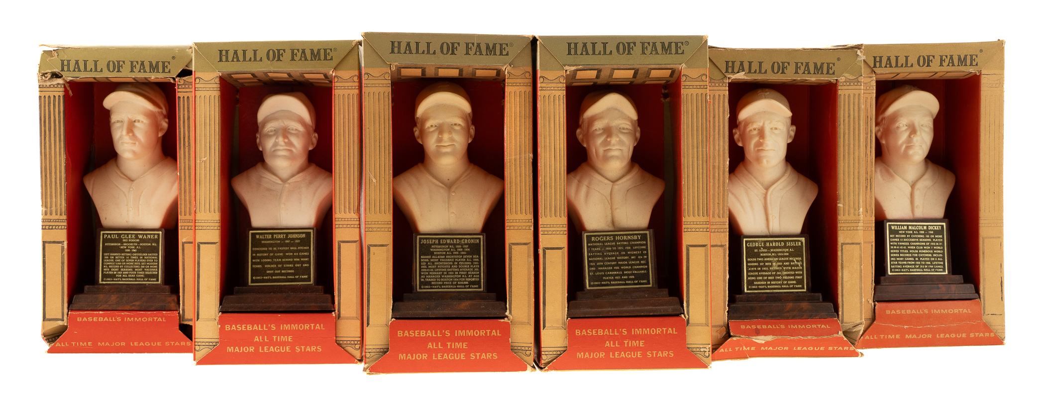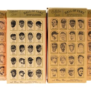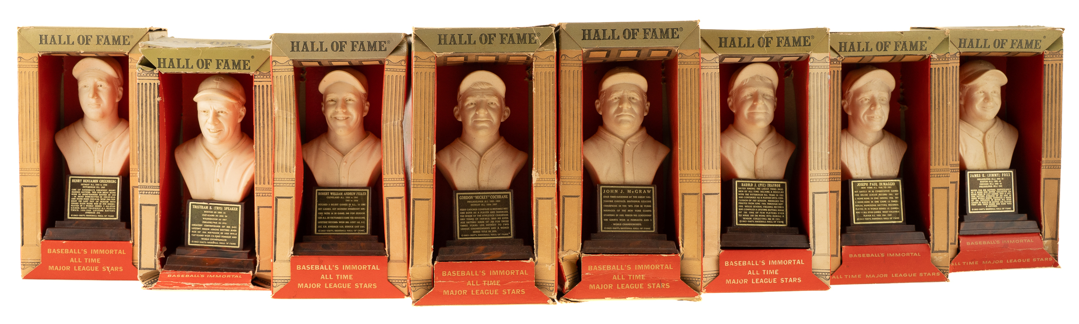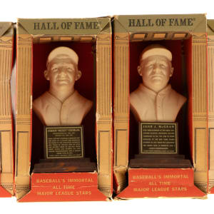 Presented is a collection of all twenty 1963 Hall of Fame busts packaged in their boxes as originally issued. These attractive display pieces, produced by Sports "Hall of Fame," Inc. (the official licensee of the National Baseball Hall of Fame), feature a white, bust-length image of the respective player rendered in plastic and mounted upon an imitation-wood plastic base. Displayed upon each base is a plaque listing the player's career highlights. Each figure (height: 6 inches) is still in its original packaging, a red, white, and gold box (4 x 3 x 8.5 inches), the reverse of which features portrait images of all twenty offered players in the set: Ruth, DiMaggio, Cobb, Gehrig, Hornsby, Wagner, Traynor, Dickey, W. Johnson, Mathewson, J. Robinson, Greenberg, Sisler, Cochrane, Speaker, Feller, Cronin, Foxx, McGraw, and P. Waner. Although the text on the reverse makes note of "Many More" to come, these twenty were the only ones ever issued. When sold in 1963, each box was covered in cellophane (none of the boxes in this collection have original cellophane intact). All of the busts range from Good to Excellent condition, averaging Very Good, with two lesser (Feller and Sisler, missing bottom panel). This is just the sixth complete set we have offered in the past 22 years. It should be noted that these busts were not all issued at the same time or in the same quantity. Some of these Hall of Fame busts are particularly rare, making sets extremely difficult to assemble. The Hall of Fame busts were originally sold in Cooperstown but apparently were not a particularly successful line. Somehow the entire remaining stock wound up at Manny's Baseball Land, the souvenir store located across the street from Yankee Stadium. The Manny's stock had a very poor distribution, with only six or eight different players represented, and most of the Hall of Fame busts in original boxes that have survived in the hobby today originate from Manny's. This is an exceptionally rare complete set of these attractive display pieces, each still housed in its original retail box. Total: 20 statues. The size/weight of this item requires that there will be an additional shipping charge for this lot.