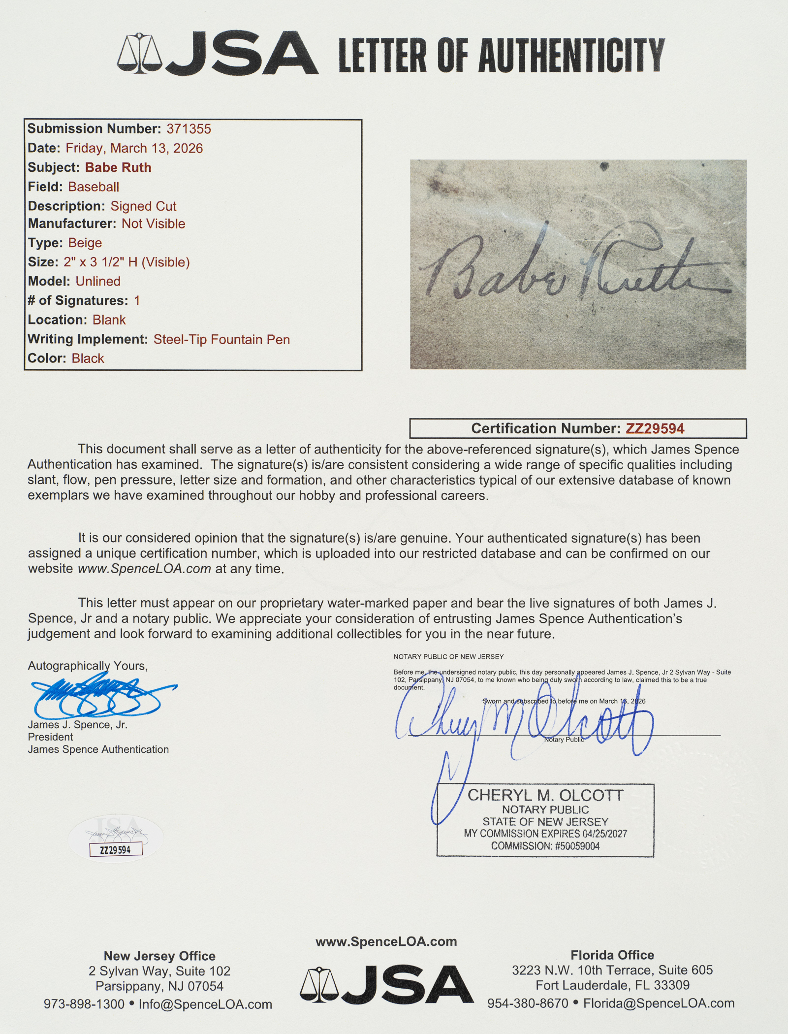 This decorative wall display is comprised of a Babe Ruth cut signature matted together with a poster of Ruth in his Yankees uniform. The signature is scripted in black fountain pen on a segment of an index card. The index-card segment (3.5 x 2 inches) is in Good condition and has been affixed to a larger, black-colored backing. The poster (20.5 x 24.25 inches, visible dimensions), which is matted above the signature, is in apparent Near Mint condition. This is an outstanding Ruth signature example, made all the more appealing by its attractive manner of presentation. Total dimensions: 25 x 30.5 inches. Full LOA from James Spence/JSA. The size/weight of this item requires that there will be an additional shipping charge for this lot.