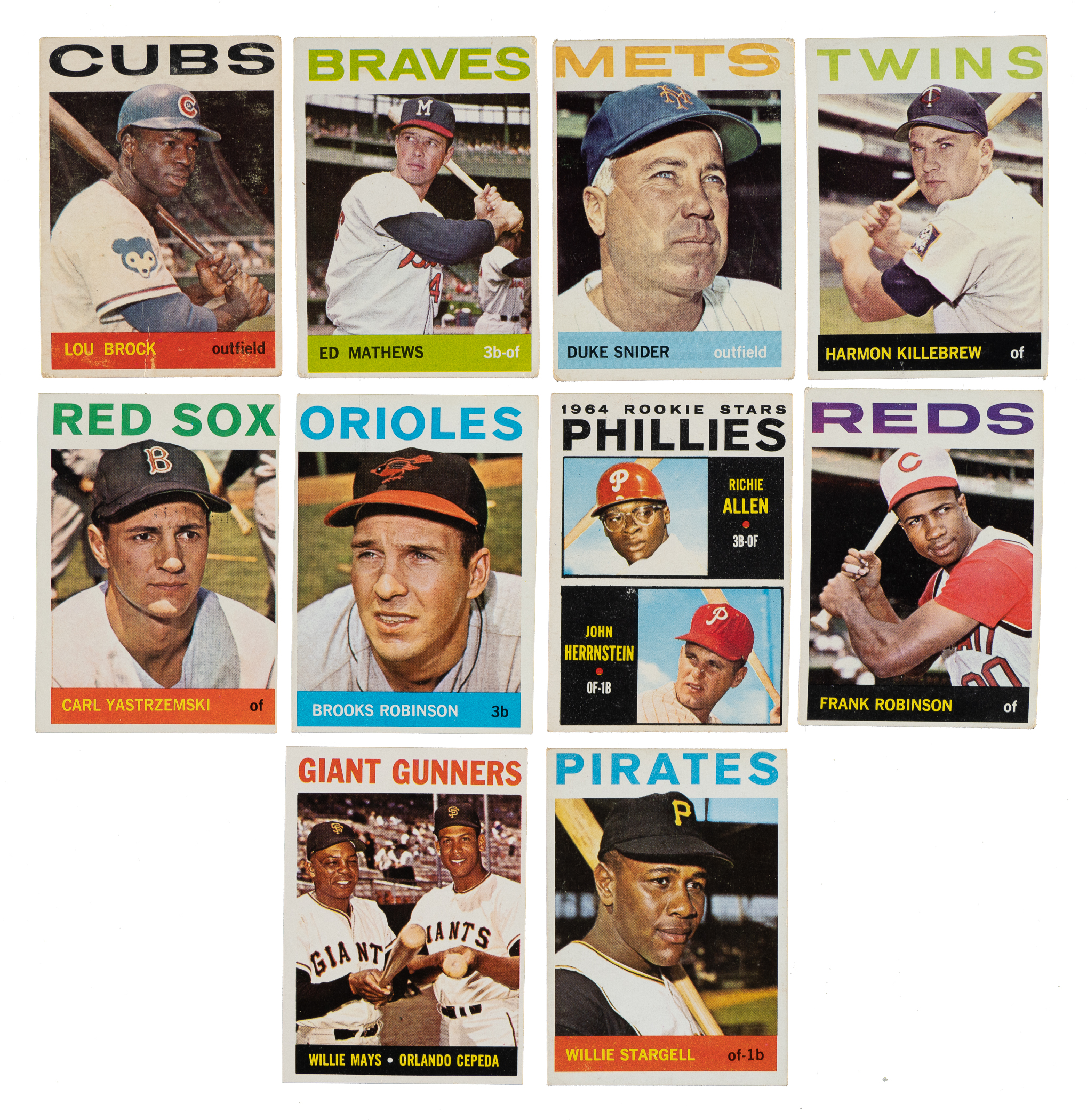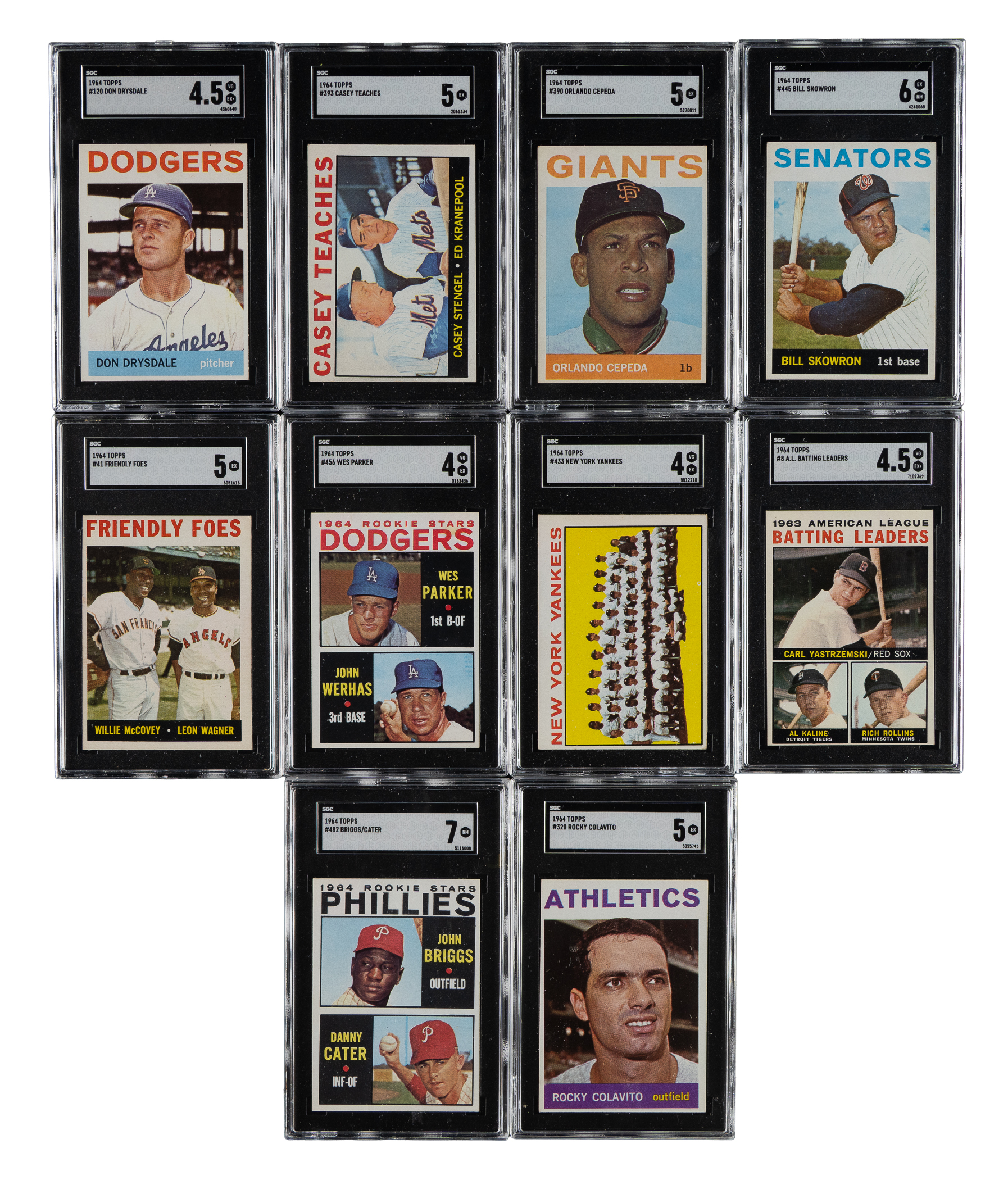 Offered is a near-complete set of 1964 Topps consisting of 552 different cards, out of 587 in the set. The 1964 Topps set is loaded with scores of stars and Hall of Famers of the era and also includes several extremely popular multiplayer cards featuring great legends of the early 1960s. Condition is 26% Ex-Mt to Nr/Mt (including a few Nr/Mt-Mt), 63% Vg-Ex to Ex, and 11% Gd to Vg (including a few lesser, a few with a slight miscut, and a couple that measure small). Ten cards have been professionally graded and encapsulated by SGC. Keys: #29 Brock (Gd), 35 Mathews (Vg), 50 Mantle (Vg-Ex+), 120 Drysdale (VG/EX+ 4.5), 150 Mays (Fr), 155 Snider (Vg), 177 Killebrew (Vg+), 200 Koufax (Vg-Ex+), 210 Yastrzemski (90/10 L/R, otherwise Vg-Ex), 230 B. Robinson (Vg-Ex), 243 Allen RC (Vg-Ex), 260 F. Robinson (Vg), 300 Aaron (Vg-Ex), 306 Mays/Cepeda (Ex-Mt), 342 Stargell (Vg-Ex+), and 390 Cepeda (EX 5). Eight additional SGC-graded cards: NM 7 (1 card): #482. EX/NM 6 (1 card): #445 Skowron. EX 5 (3 cards): #41 Friendly Foes, 320 Colavito, and 393 Casey Teaches. VG/EX+ 4.5 (1 card): #8 AL Batting Ldrs. VG/EX 4 (2 cards): #433 Yankees and 456. Missing the following thirty-five cards for completion: #7, 21 Berra, 43, 55 Banks, 70, 100, 103, 125 Rose, 161, 167, 175, 225 Maris, 250 Kaline, 265, 280 Marichal, 331 AL Bombers w/ Mantle/Maris, 350 McCovey, 360, 371, 380 Ford, 400 Spahn, 407, 423 Aaron/Mays, 429, 440 Clemente, 460 Gibson, 470, 476, 492, 541 Niekro, 543, 581, 585, 586, and 587. This is a very sharp-looking near-complete set of one of the classic sets of the era. Total: 552 cards.