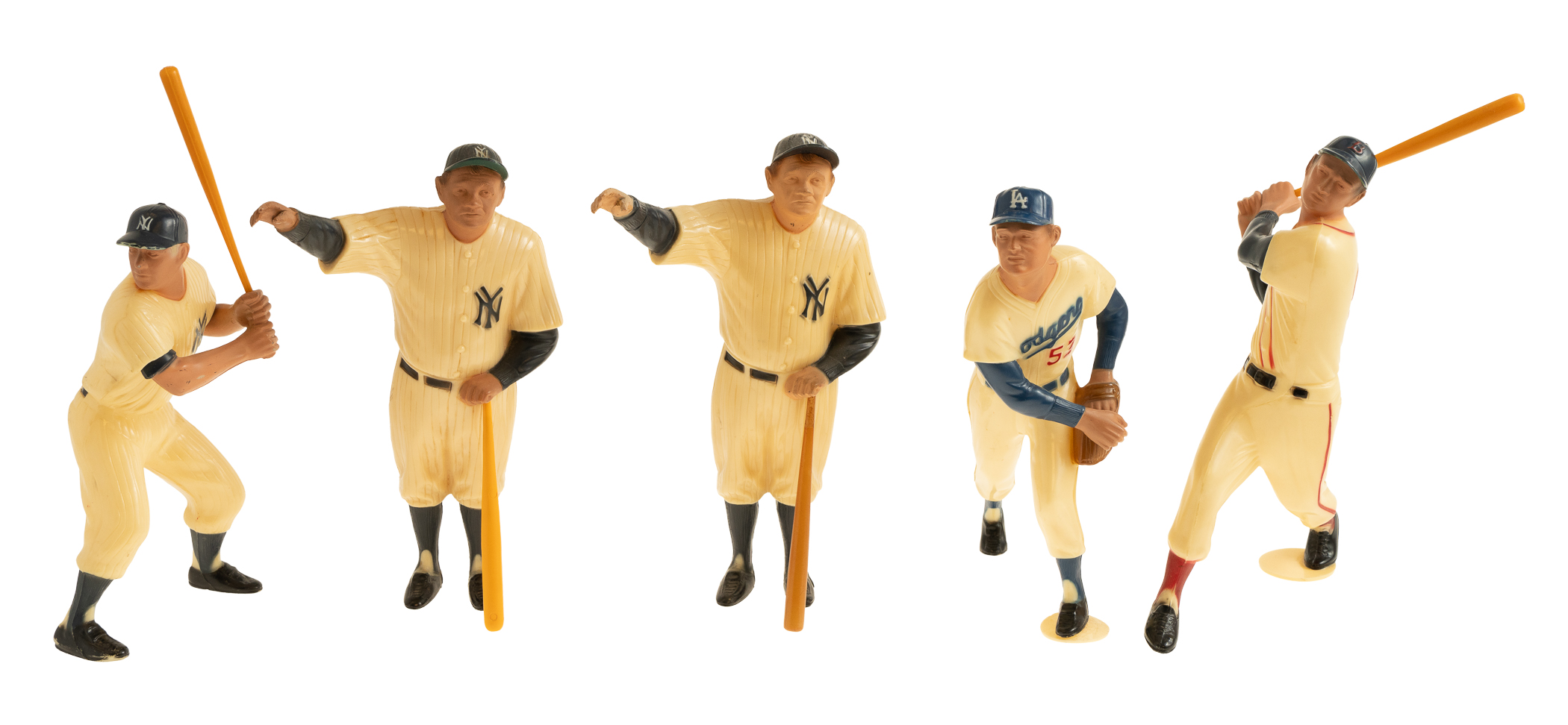 Collection of five original Hartland Plastics baseball statues: Also included are six original bats. This collection consists of the following: Ted Williams (Ex), Don Drysdale (Vg-Ex dab of glue on foot), Mickey Mantle Vg (stray marks and chipping on cap), and two Babe Ruth (Gd, adhesive residue on both statues' feet, although the extent is more severe on one). Total: 5 statues.
