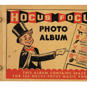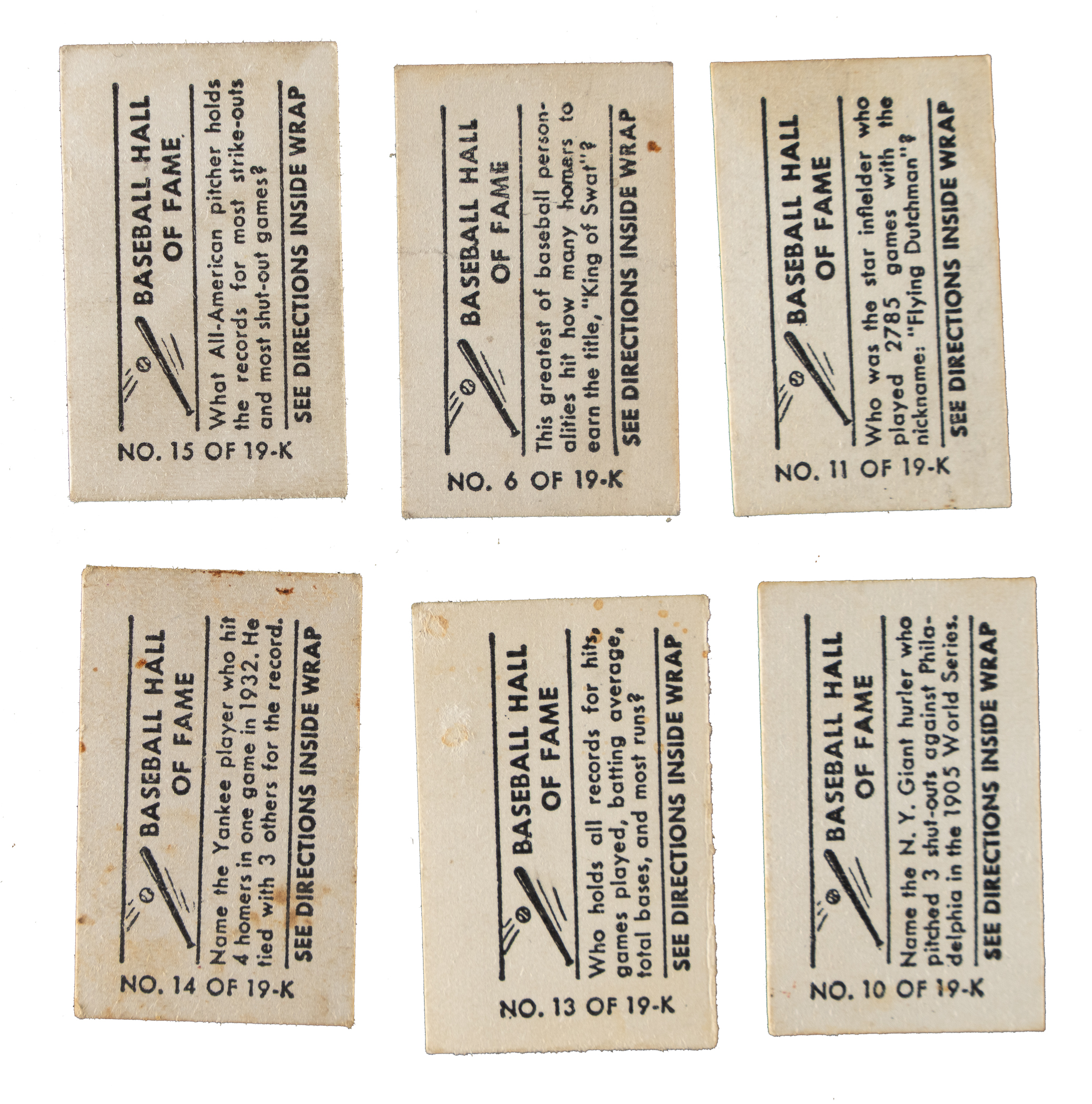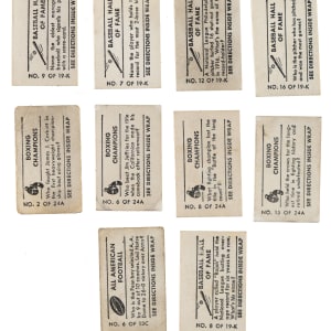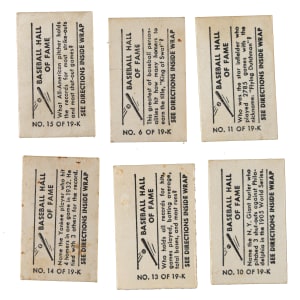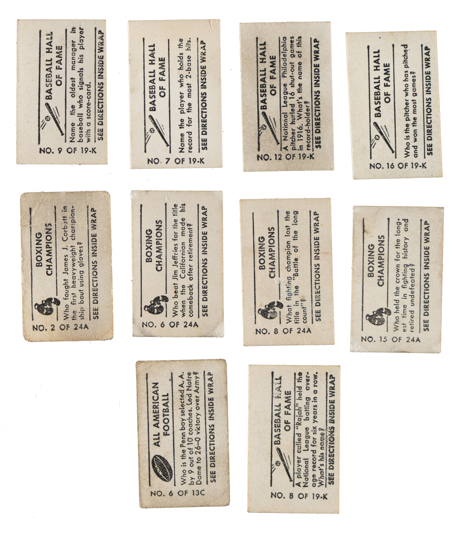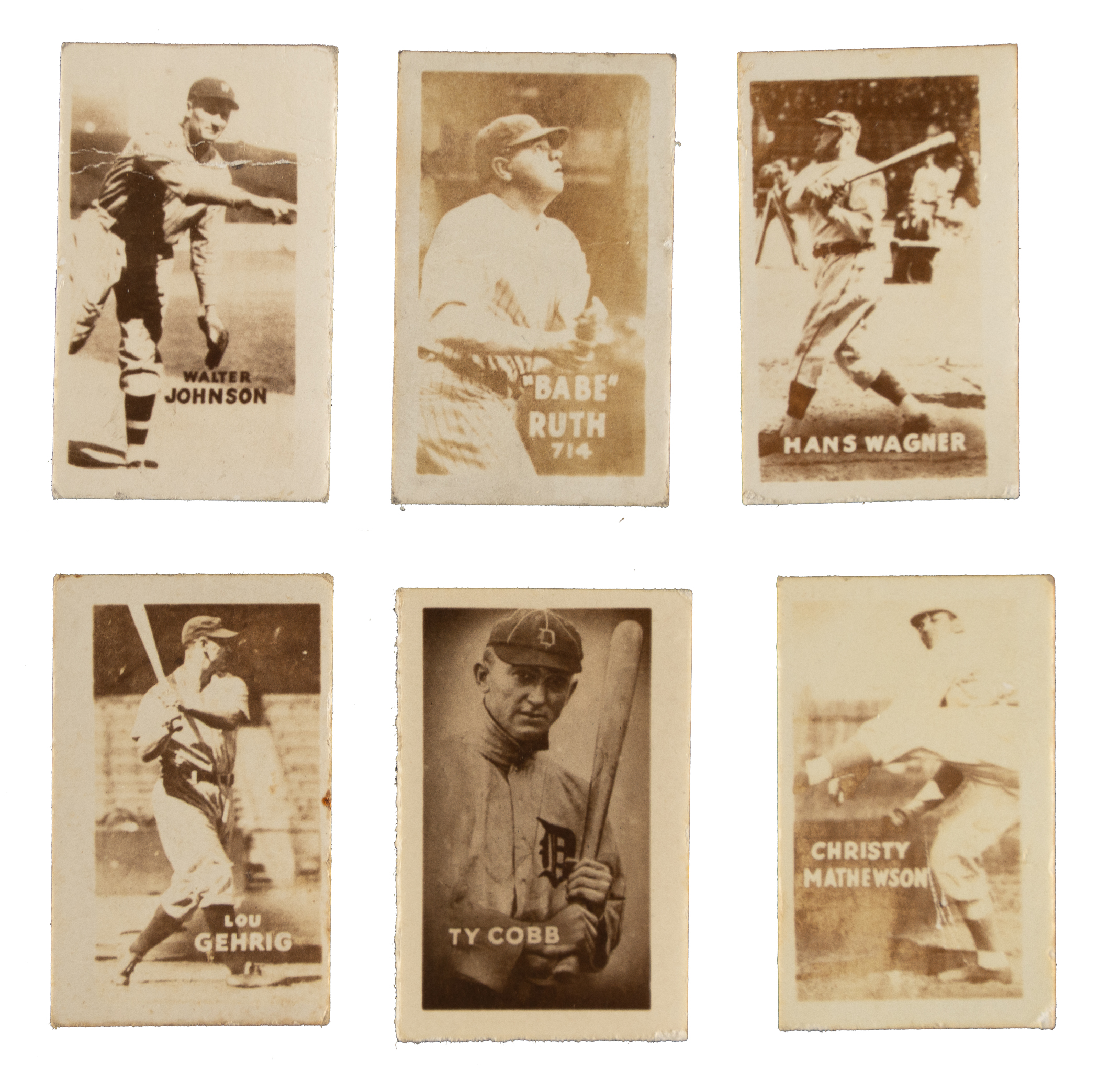 Presented is an impressive 252-card complete set of 1948 Topps "Magic Photos" including an original album. Most assume that the first Topps card issues were in 1951. In fact, the very first Topps card issue was the unusual "Magic Photos" set of 1948. This was also Topps' first baseball-card set. Among the 19 subsets that make up the set is a 19-card subset of baseball players including Ruth, Cobb, Wagner, Mack, Johnson, Alexander, Mathewson, Hornsby, Speaker, Young, Sisler, Tinker, and Evers. Other subjects represented include boxers (Dempsey, Tunney, Jeffries, Willard, Johnson, Louis, etc.), and various nonsport topics, including famous movie stars, buildings, famous personalities, cowboys, championship dogs, etc. These "self-developing" cards (7/8 x 1-7/16 inches) were called "Magic Photos" because, when issued, they had blank fronts, and the sepia photos on the fronts could be developed by youngsters exposing them to the sun. This set has always been very popular among nonsport collectors, but its great significance as Topps' first baseball card set has never fully been appreciated by baseball-card collectors. This might be due, in part, to the fact that the self-developing process produced very inconsistent results, and many cards that have survived have photos that are very poorly developed. In terms of overall condition and photo quality, this complete set is better than the norm, with the majority having pleasing contrast and detail. Only a modest percentage are partially developed. Condition is 12% Ex or slightly better, 53% Vg to Vg-Ex, and 35% lesser (including approximately 5% trimmed). Keys: #6-K Ruth (Gd), 10-K Mathewson (Gd-Vg), 13-K Cobb (Gd due solely to mild back damage), and 14-K Gehrig (Vg+). The set is accompanied by an original album that displays pencil marks on the inside back cover, otherwise presenting in Very Good condition. This is a very significant and scarce early Topps issue, which has always been somewhat overlooked by collectors, perhaps because of its unusual design and dimensions. This is a very attractive set of 1948 Topps "Magic Photos," only the third full 252-card complete set we have offered in the past 22 years. Total: 252 cards and an album.